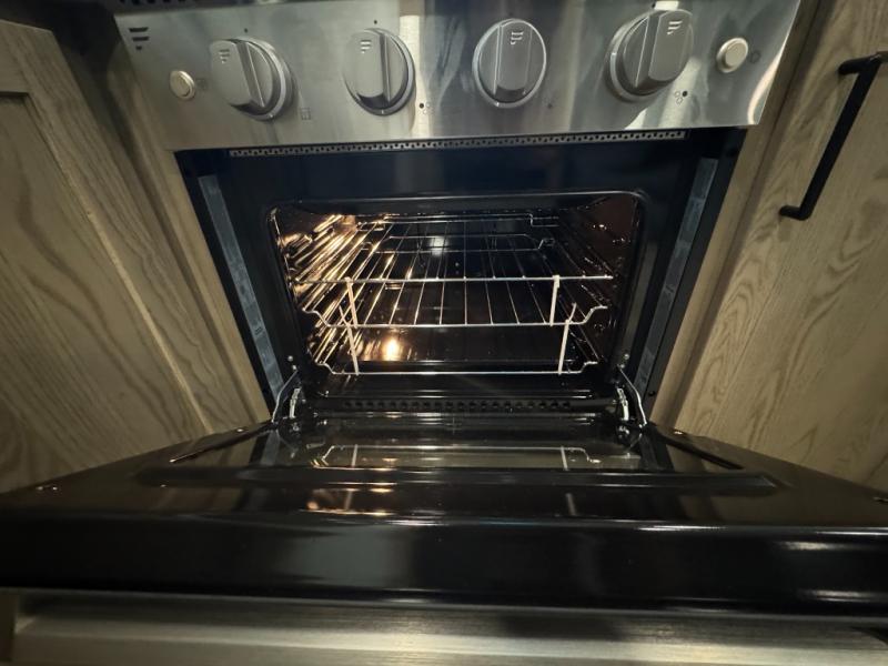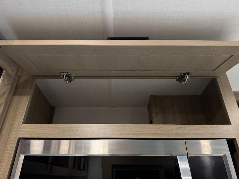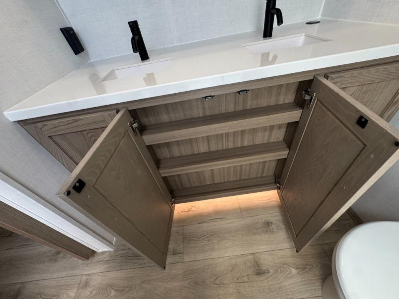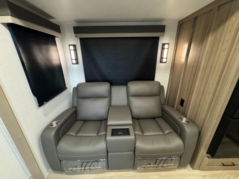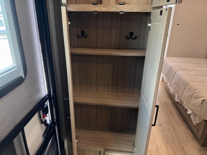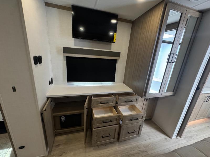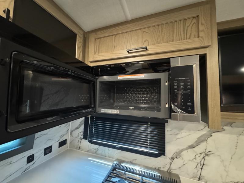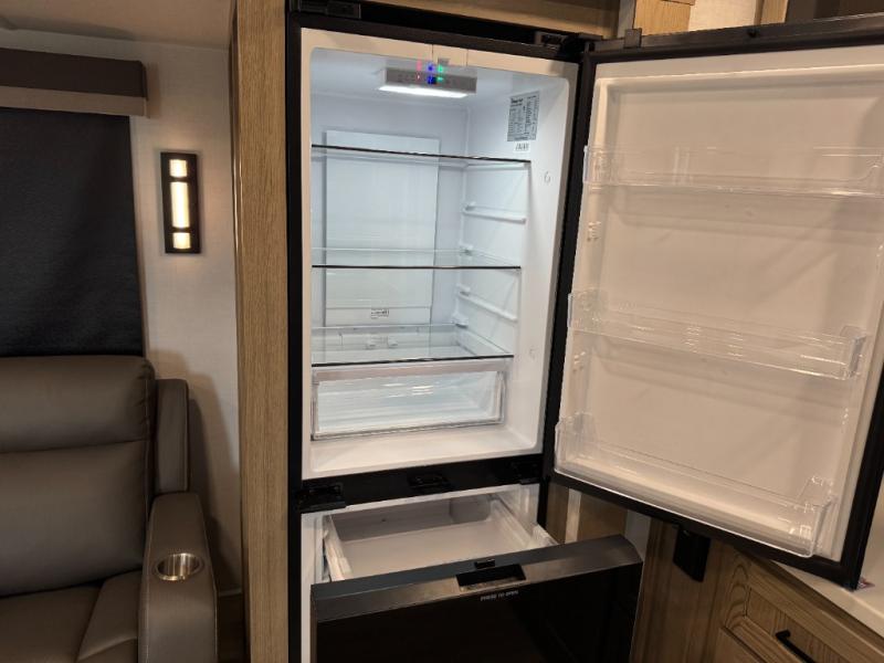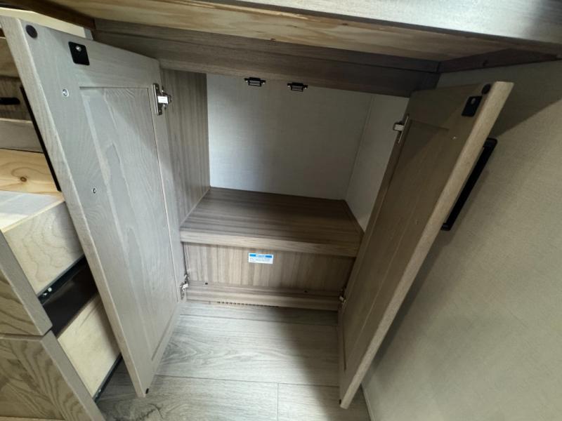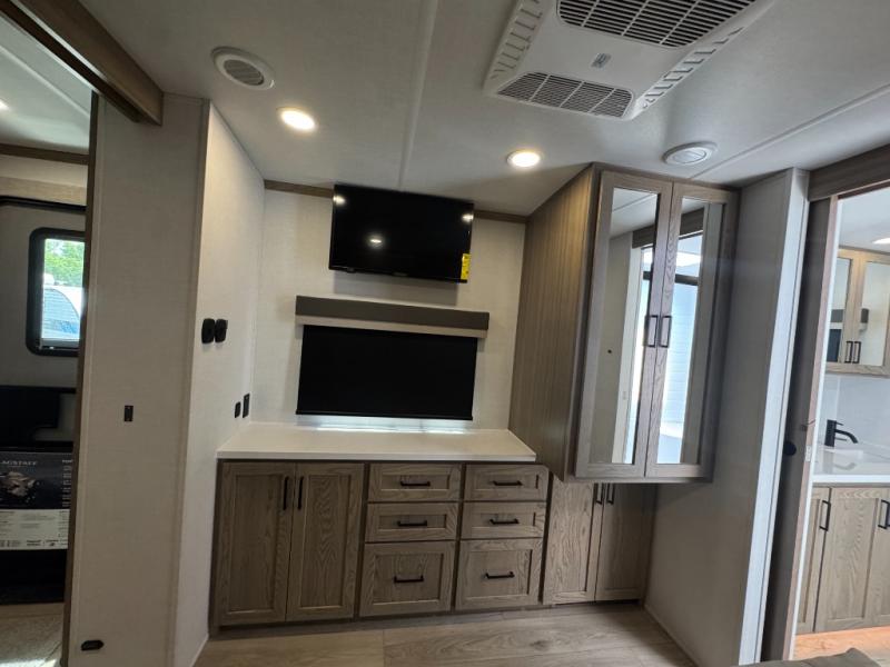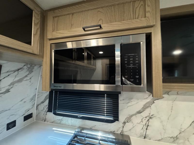 You will love how open this travel trailer will feel with the large front window that you can look out from the two-person bar top seating! The front kitchen has plenty of countertop space for you to prepare your best meals. Your nights will be spent in true relaxation with a 67" theater seating and king bed slide in the bedroom for a great night's rest. The full rear bathroom has a shower with a seat to take a nice, hot shower before bed, and a dual-sink vanity for two to get ready at once in the mornings!