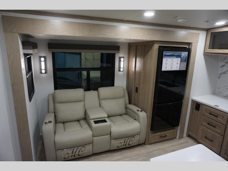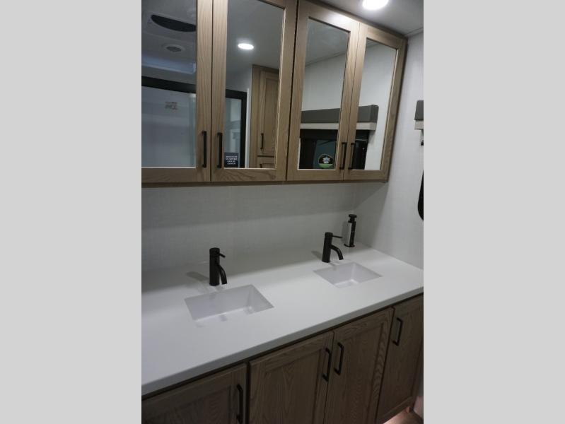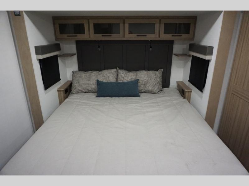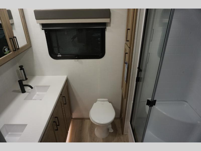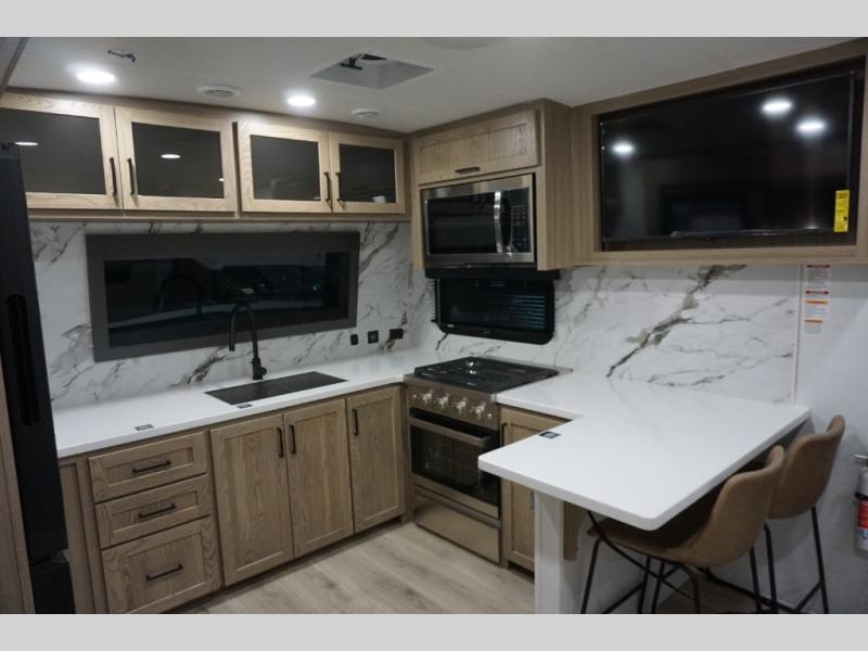You will love how open this travel trailer will feel with the large front window that you can look out from the two-person bar top seating! The front kitchen has plenty of countertop space for you to prepare your best meals. Your nights will be spent in true relaxation with a 67" theater seating and king bed slide in the bedroom for a great night's rest. The full rear bathroom has a shower with a seat to take a nice, hot shower before bed, and a dual-sink vanity for two to get ready at once in the mornings!