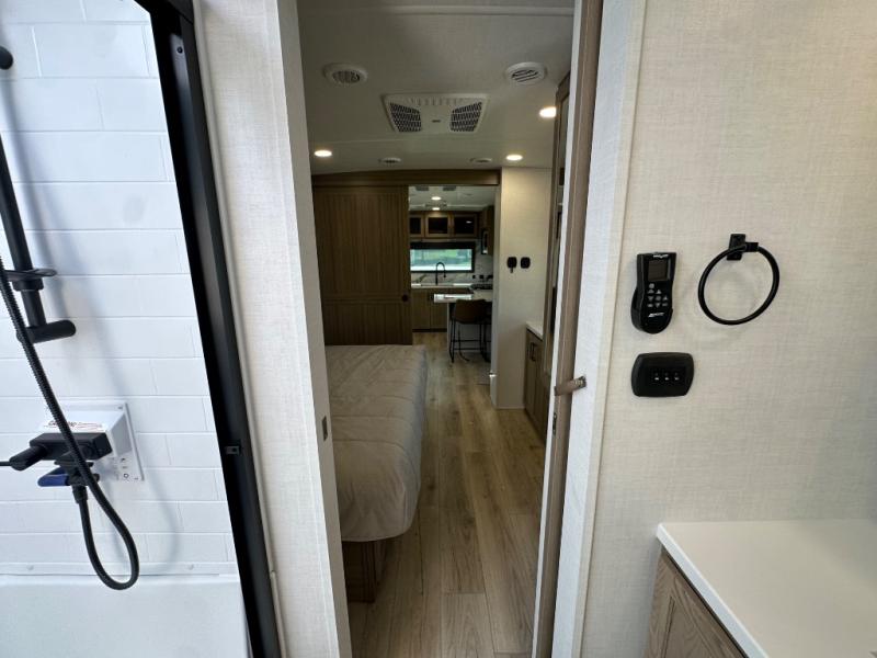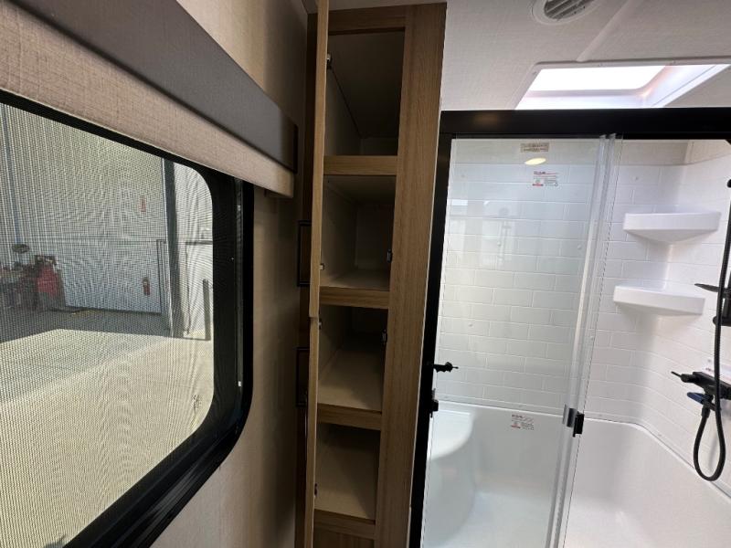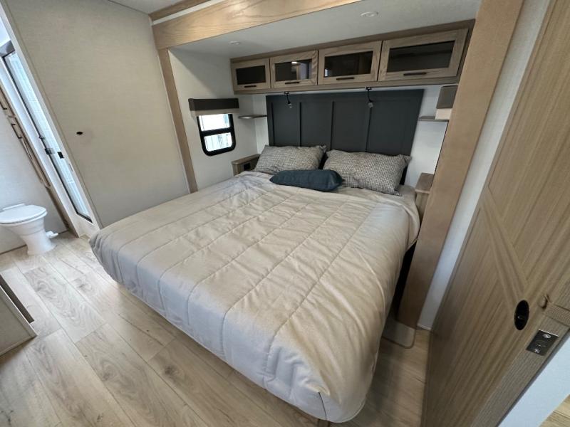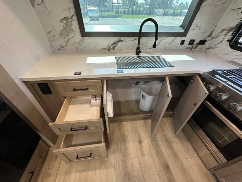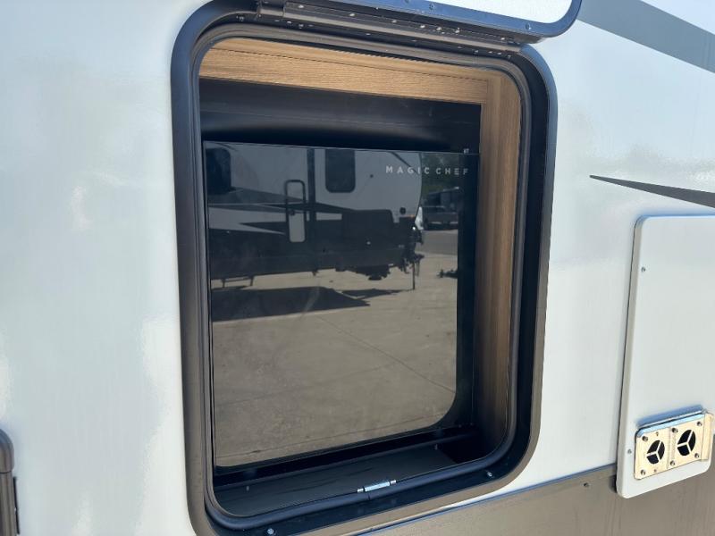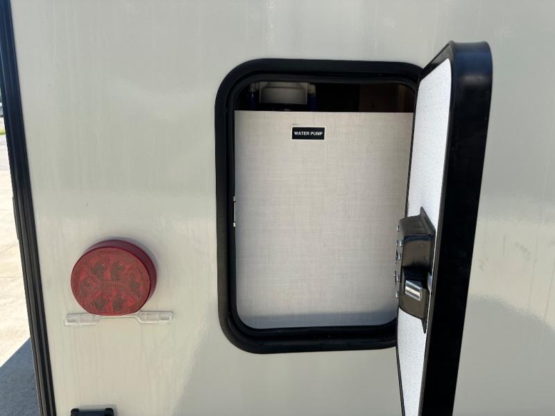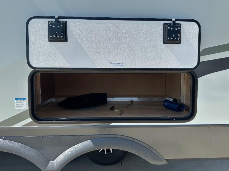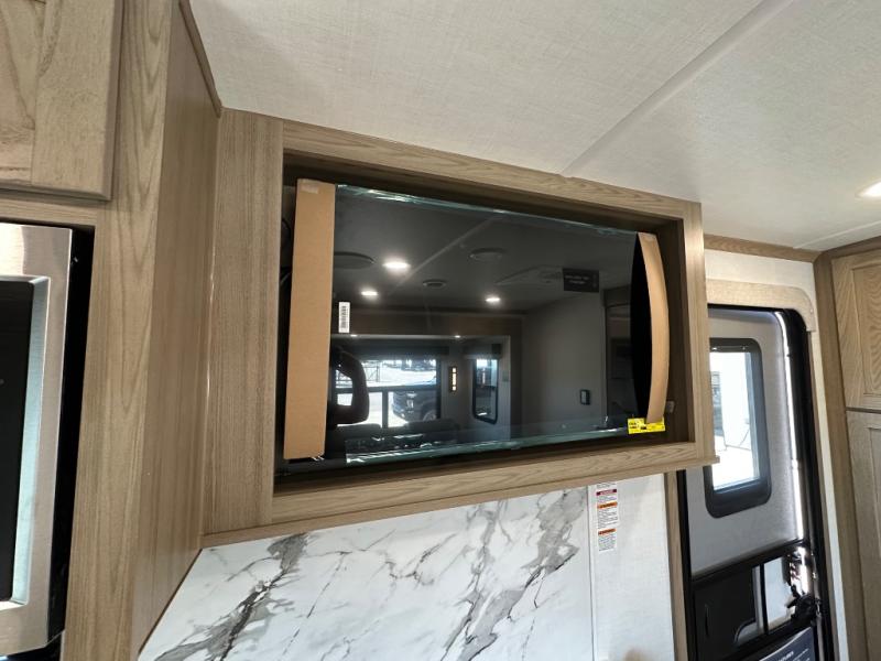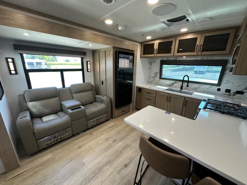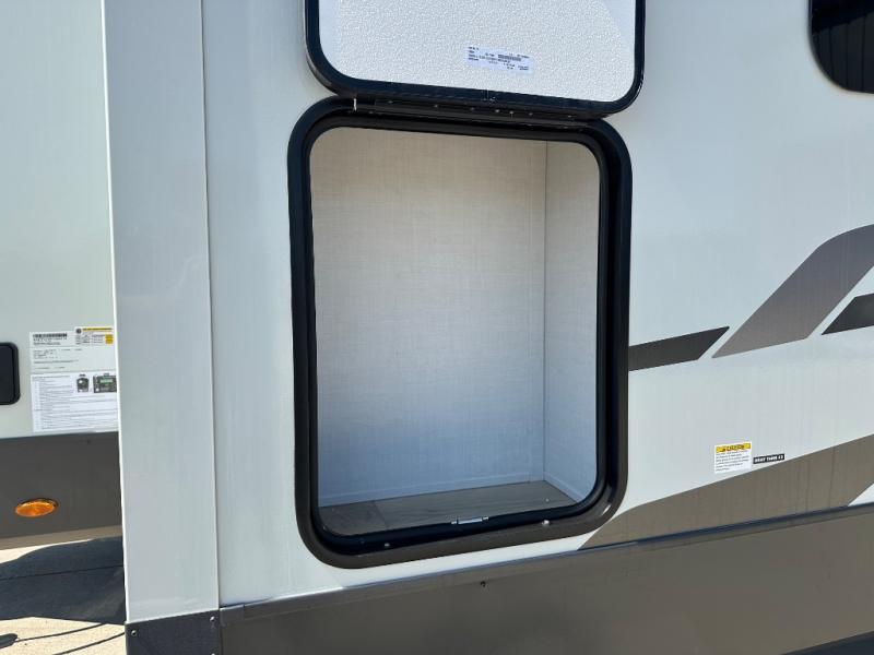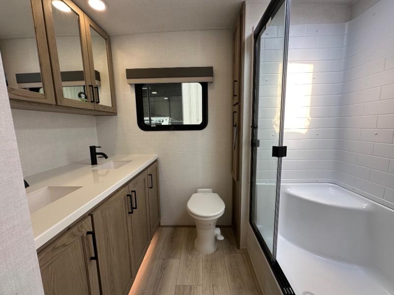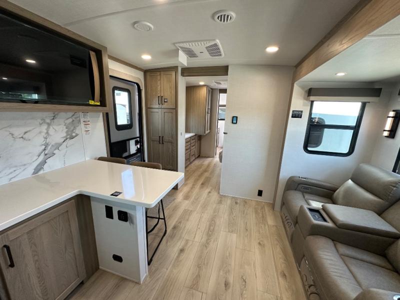 You will love how open this travel trailer will feel with the large front window that you can look out from the two-person bar top seating! The front kitchen has plenty of countertop space for you to prepare your best meals. Your nights will be spent in true relaxation with a 67" theater seating and king bed slide in the bedroom for a great night's rest. The full rear bathroom has a shower with a seat to take a nice, hot shower before bed, and a dual-sink vanity for two to get ready at once in the mornings!