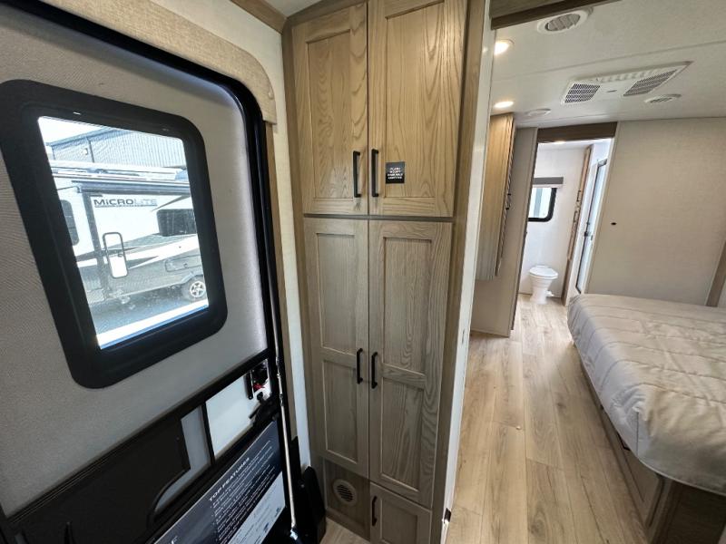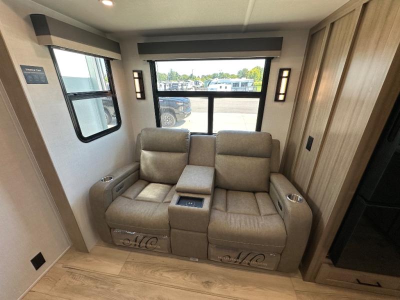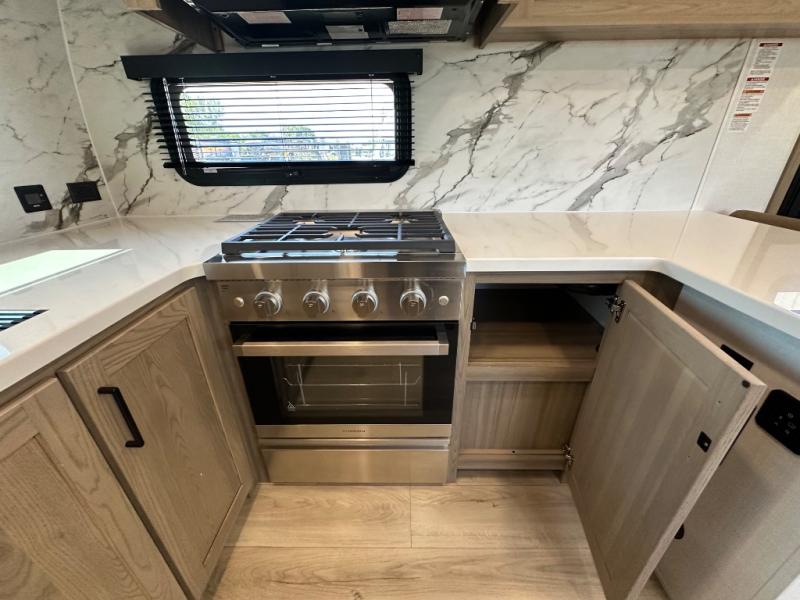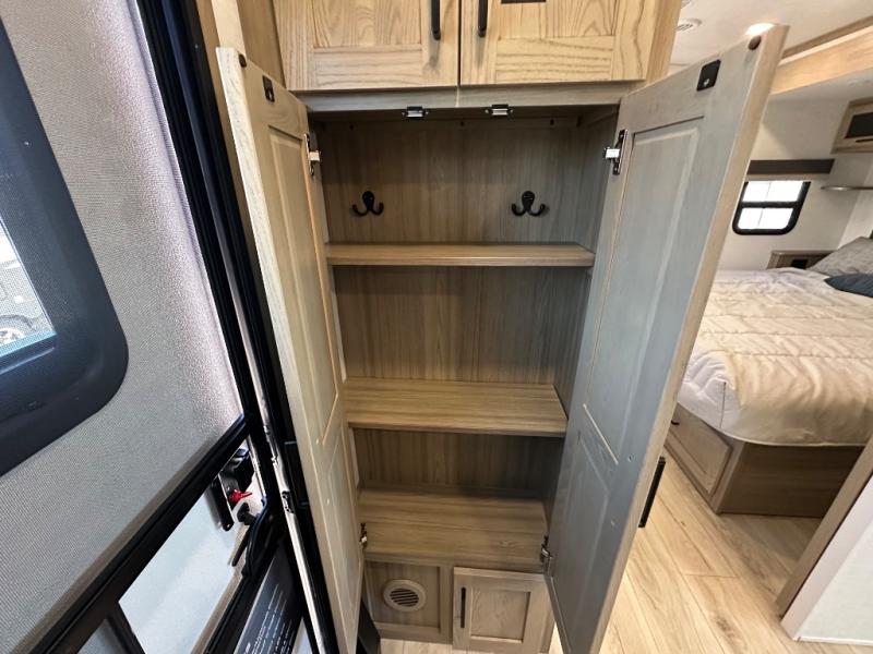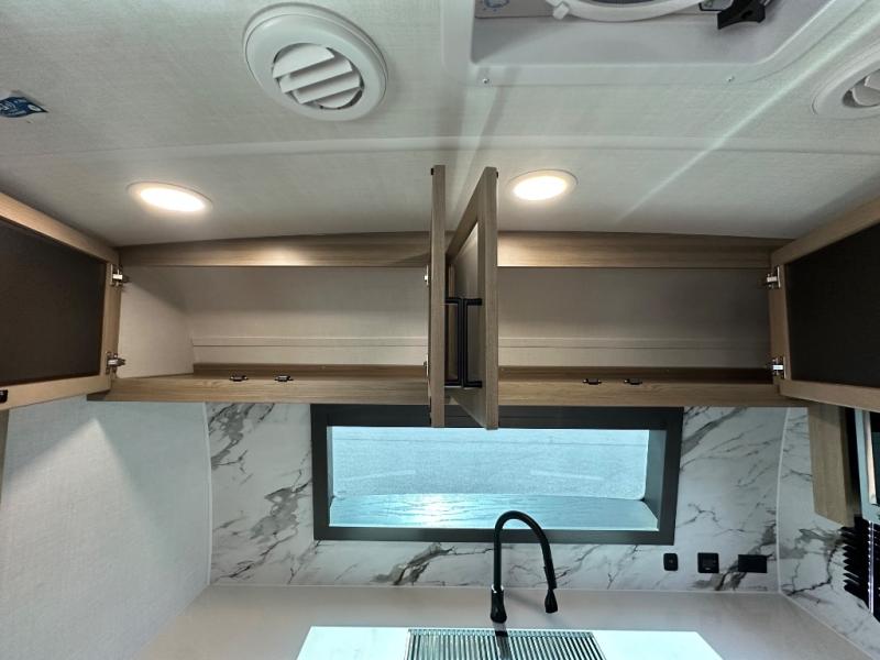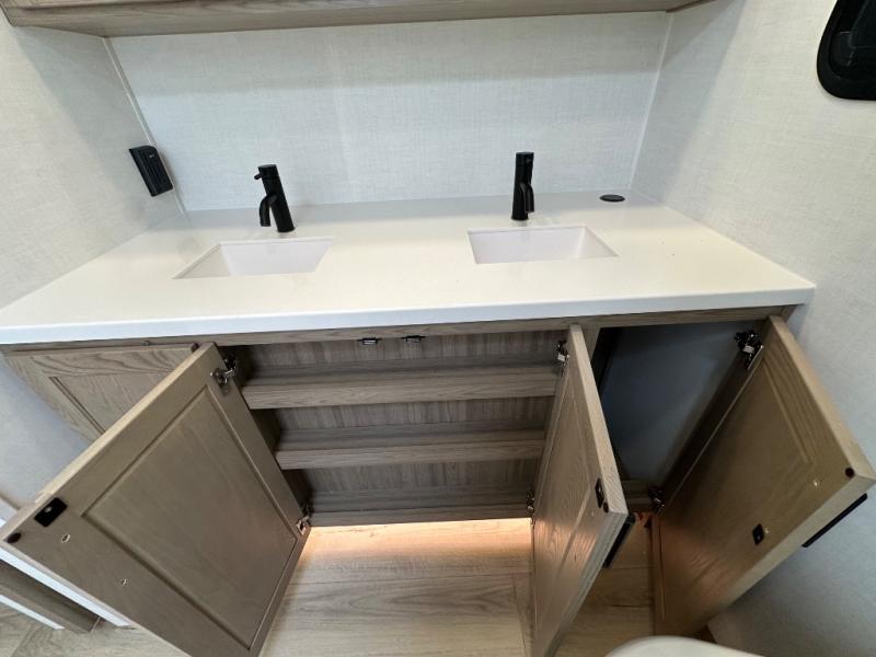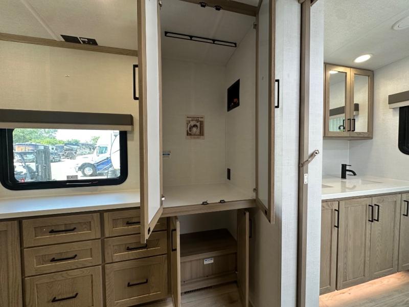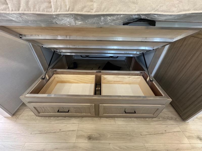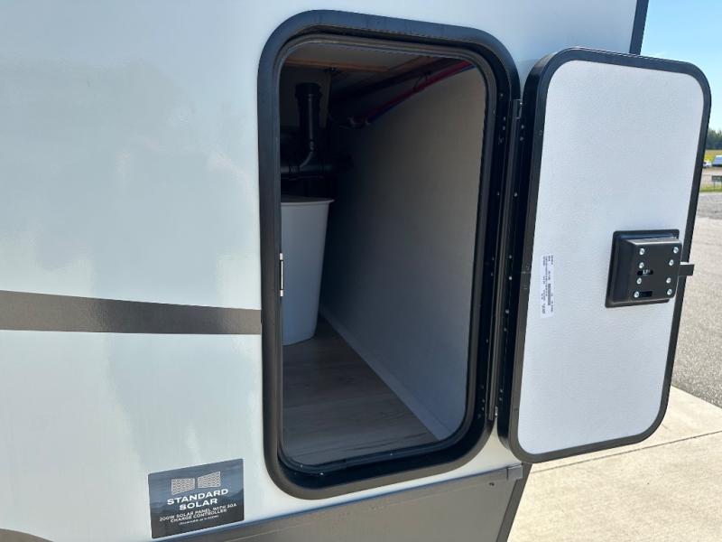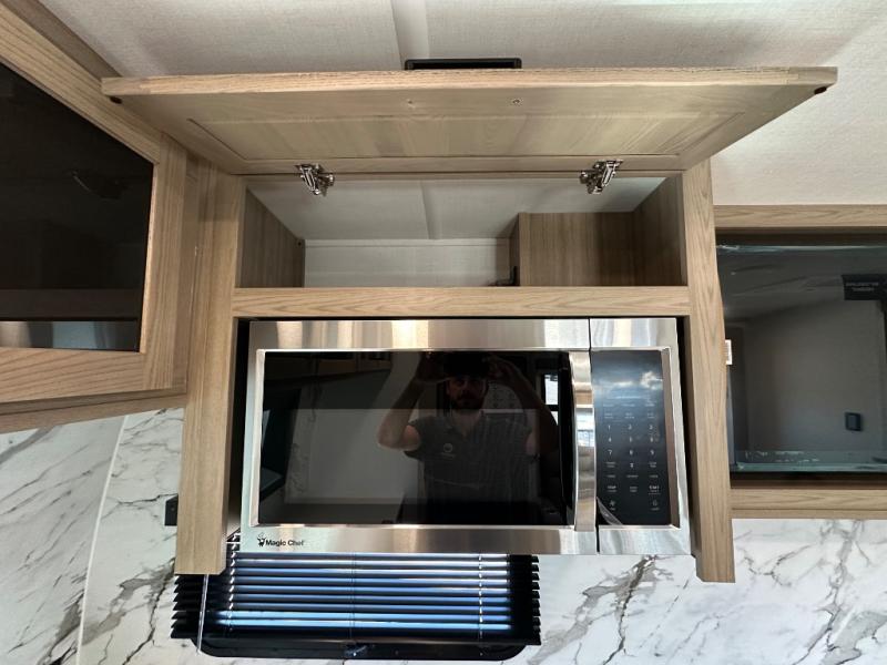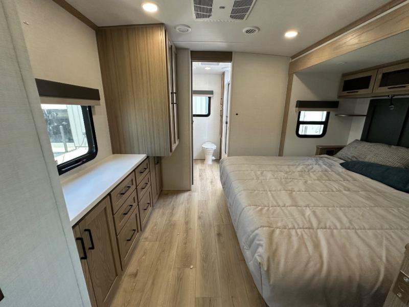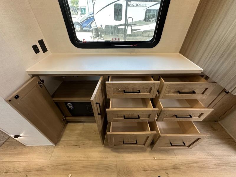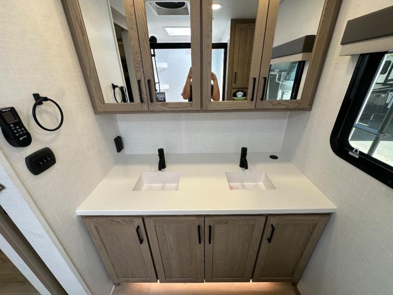 You will love how open this travel trailer will feel with the large front window that you can look out from the two-person bar top seating! The front kitchen has plenty of countertop space for you to prepare your best meals. Your nights will be spent in true relaxation with a 67" theater seating and king bed slide in the bedroom for a great night's rest. The full rear bathroom has a shower with a seat to take a nice, hot shower before bed, and a dual-sink vanity for two to get ready at once in the mornings!
