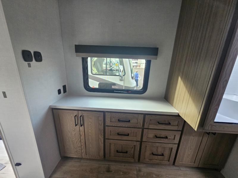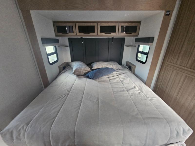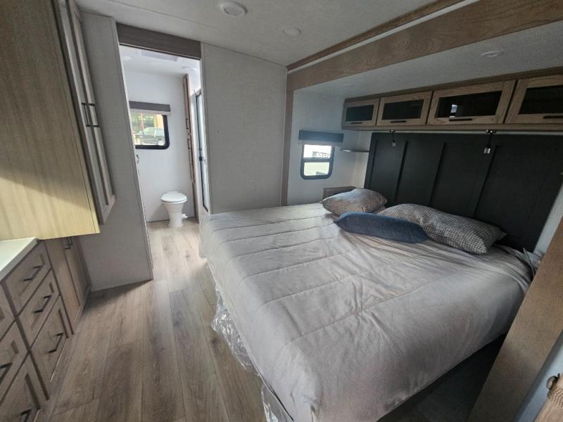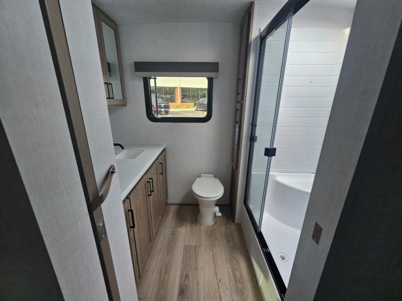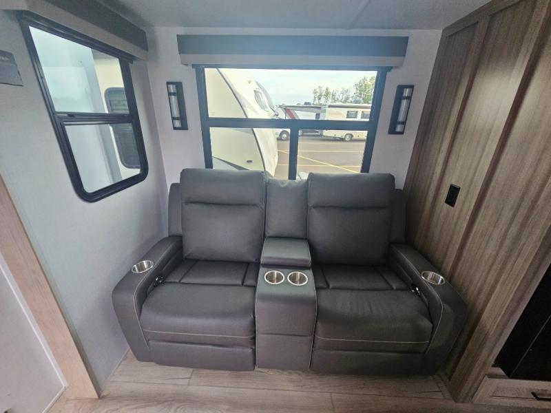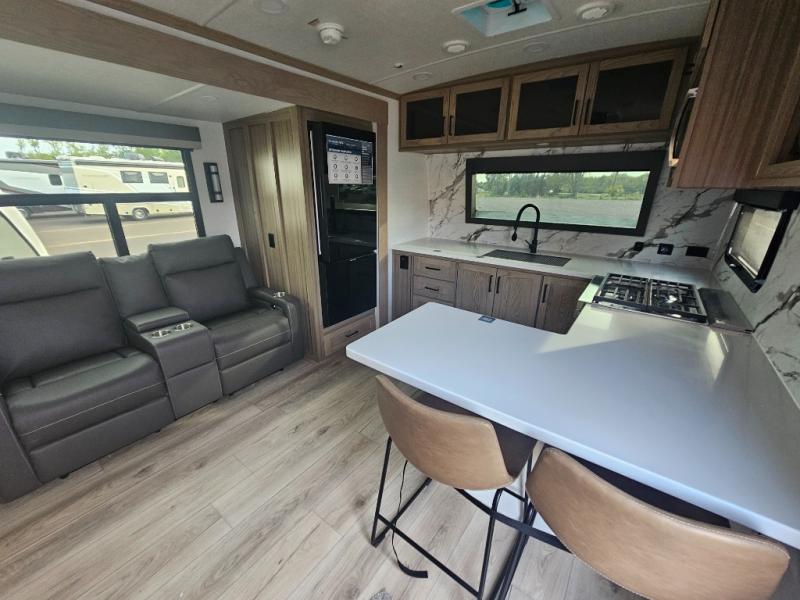 You will love how open this travel trailer will feel with the large front window that you can look out from the two-person bar top seating! The front kitchen has plenty of countertop space for you to prepare your best meals. Your nights will be spent in true relaxation with a 67" theater seating and king bed slide in the bedroom for a great night's rest. The full rear bathroom has a shower with a seat to take a nice, hot shower before bed, and a dual-sink vanity for two to get ready at once in the mornings!