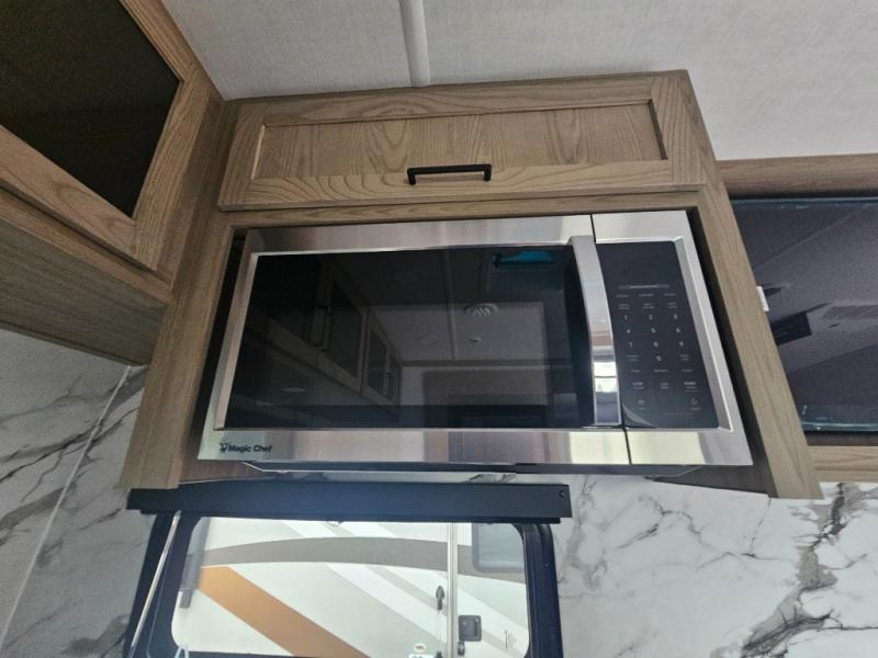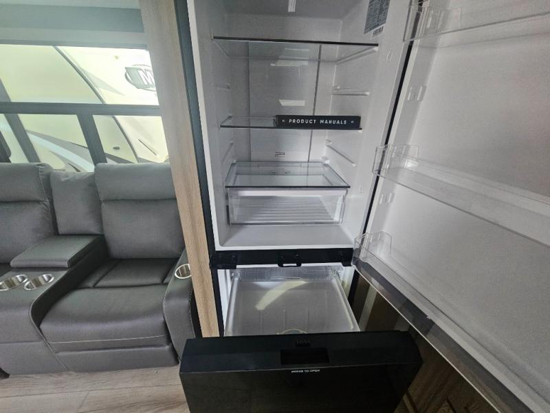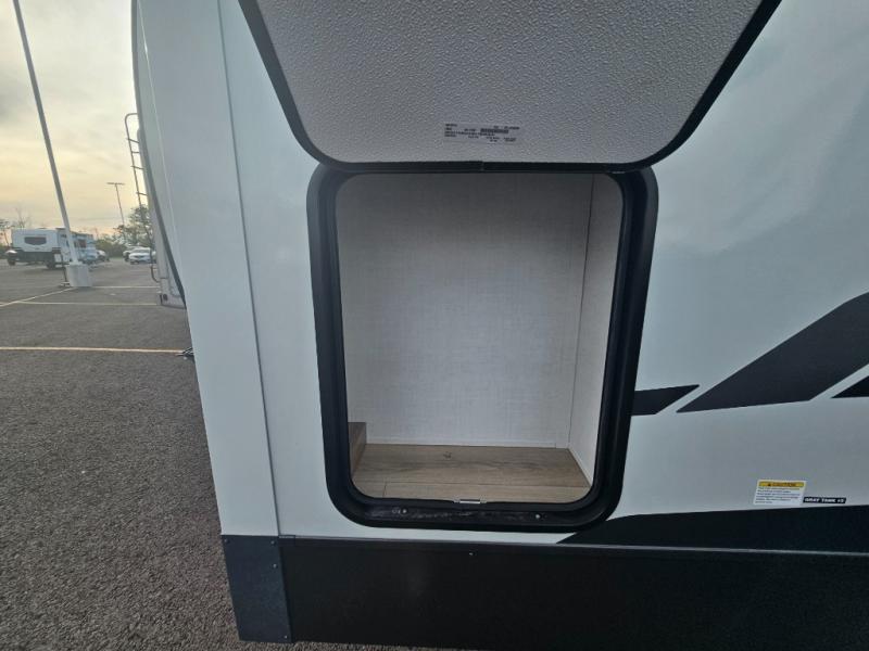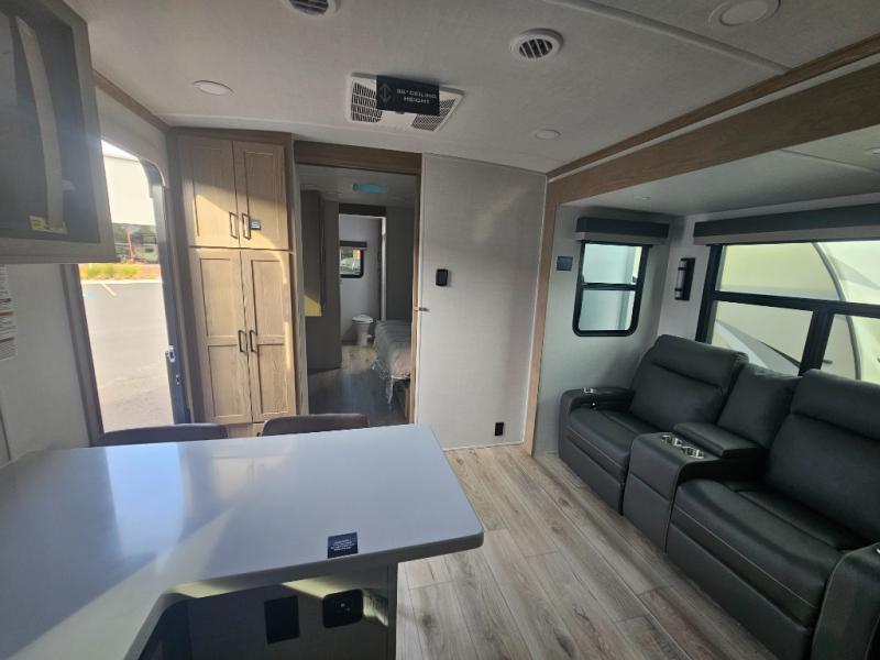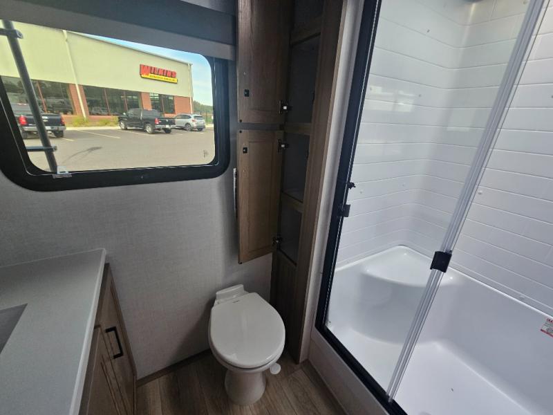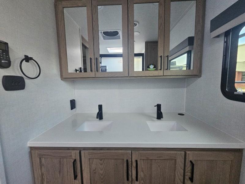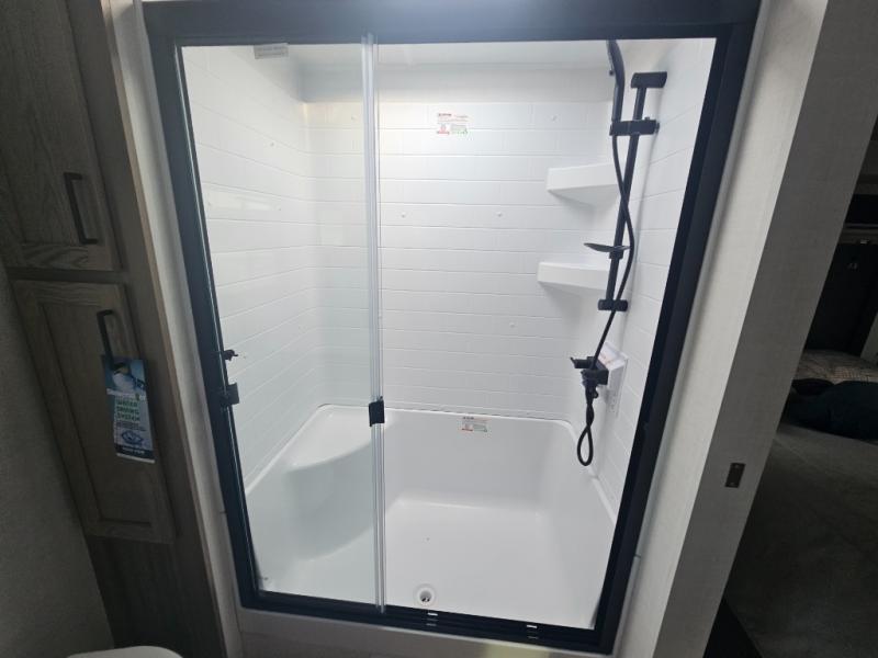 You will love how open this travel trailer will feel with the large front window that you can look out from the two-person bar top seating! The front kitchen has plenty of countertop space for you to prepare your best meals. Your nights will be spent in true relaxation with a 67" theater seating and king bed slide in the bedroom for a great night's rest. The full rear bathroom has a shower with a seat to take a nice, hot shower before bed, and a dual-sink vanity for two to get ready at once in the mornings!