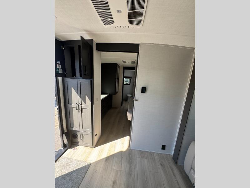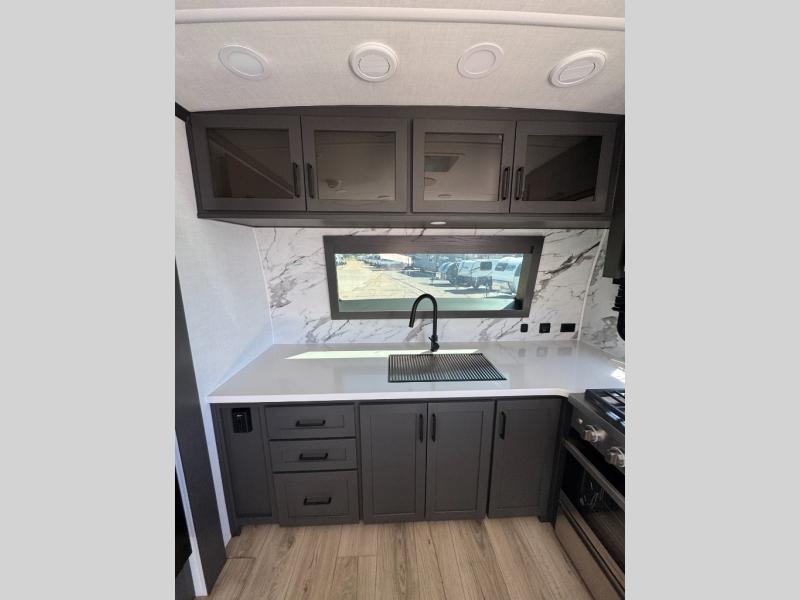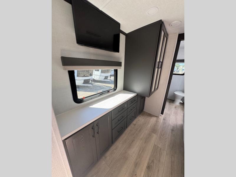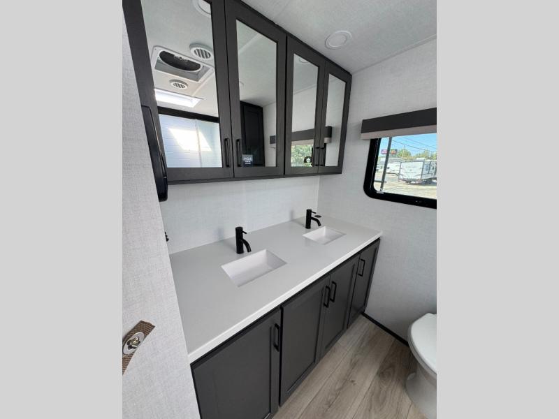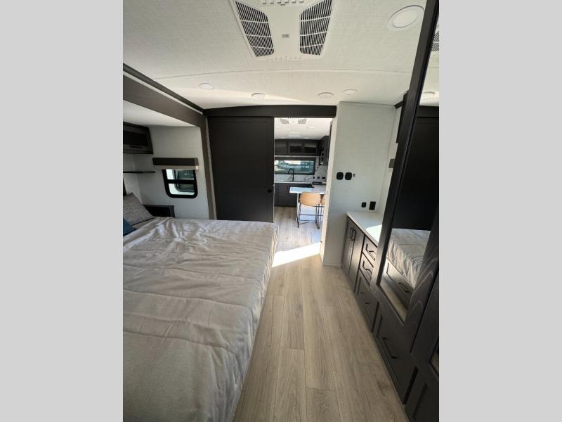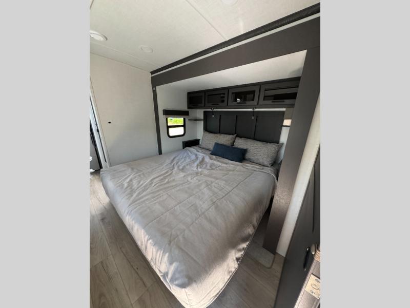 You will love how open this travel trailer will feel with the large front window that you can look out from the two-person bar top seating! The front kitchen has plenty of countertop space for you to prepare your best meals. Your nights will be spent in true relaxation with a 67" theater seating and king bed slide in the bedroom for a great night's rest. The full rear bathroom has a shower with a seat to take a nice, hot shower before bed, and a dual-sink vanity for two to get ready at once in the mornings!