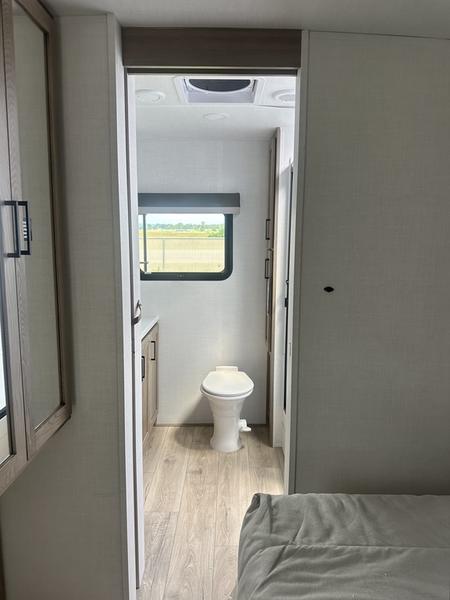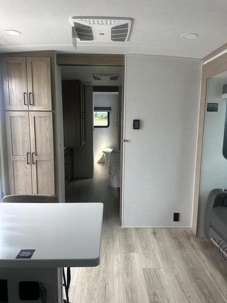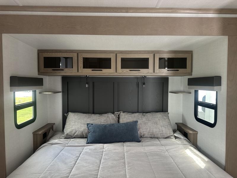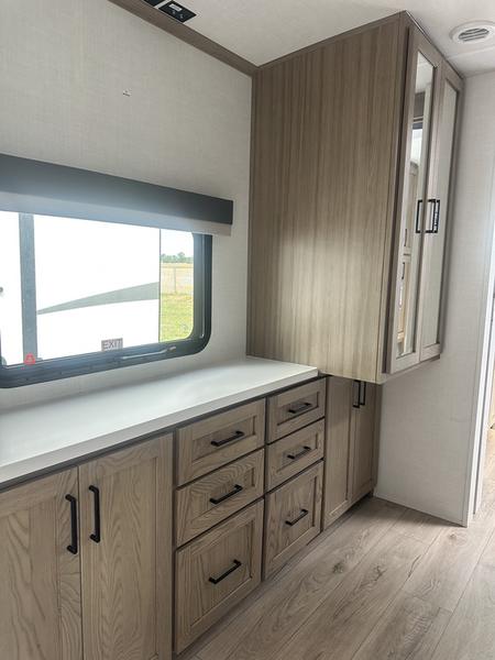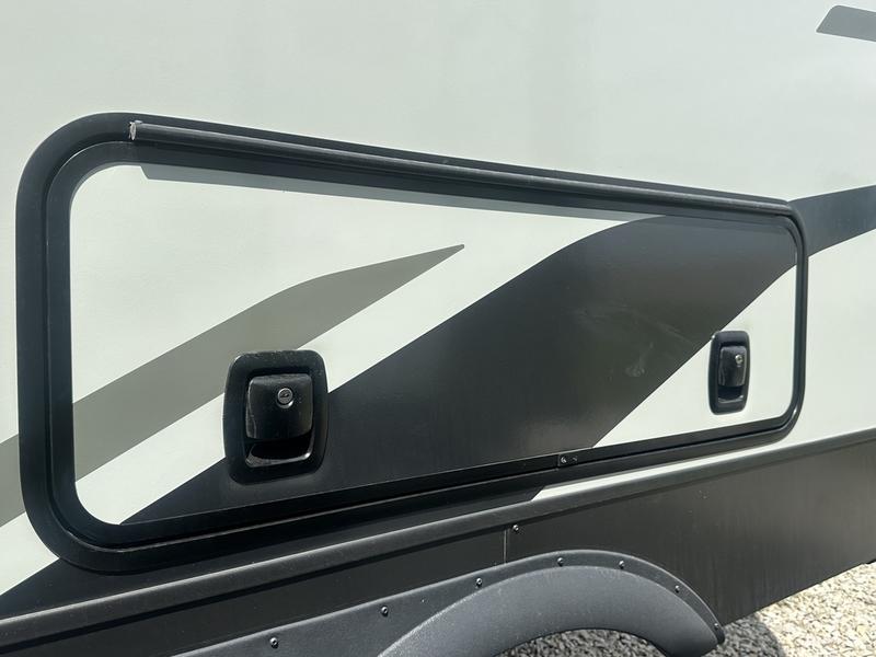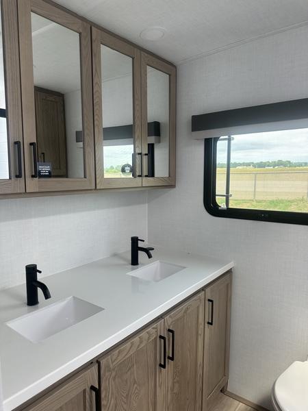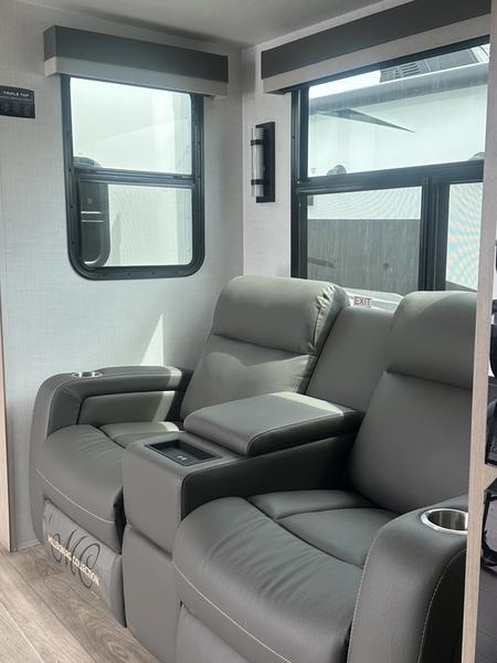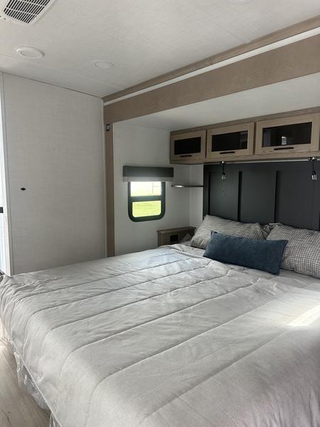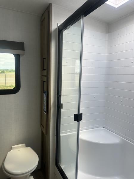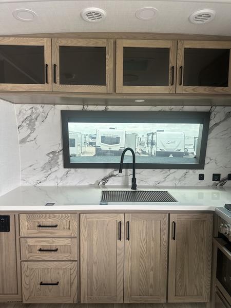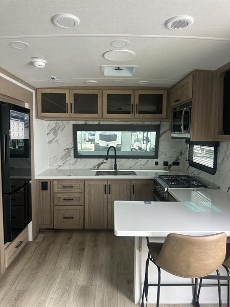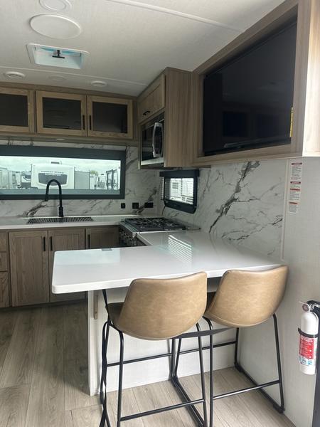 You will love how open this travel trailer will feel with the large front window that you can look out from the two-person bar top seating! The front kitchen has plenty of countertop space for you to prepare your best meals. Your nights will be spent in true relaxation with a 67" theater seating and king bed slide in the bedroom for a great night's rest. The full rear bathroom has a shower with a seat to take a nice, hot shower before bed, and a dual-sink vanity for two to get ready at once in the mornings!