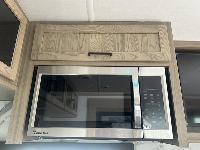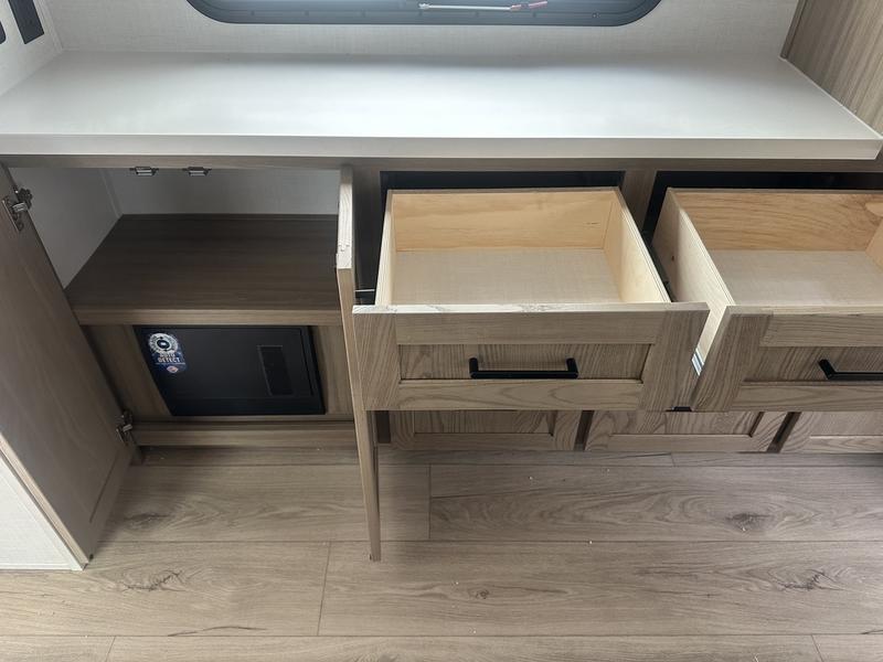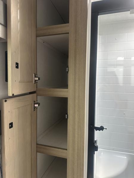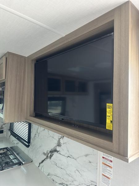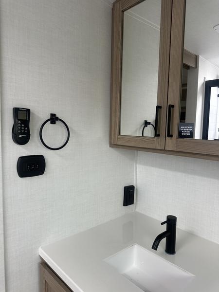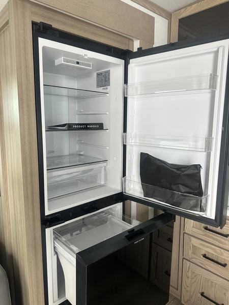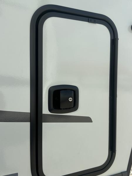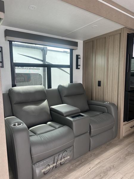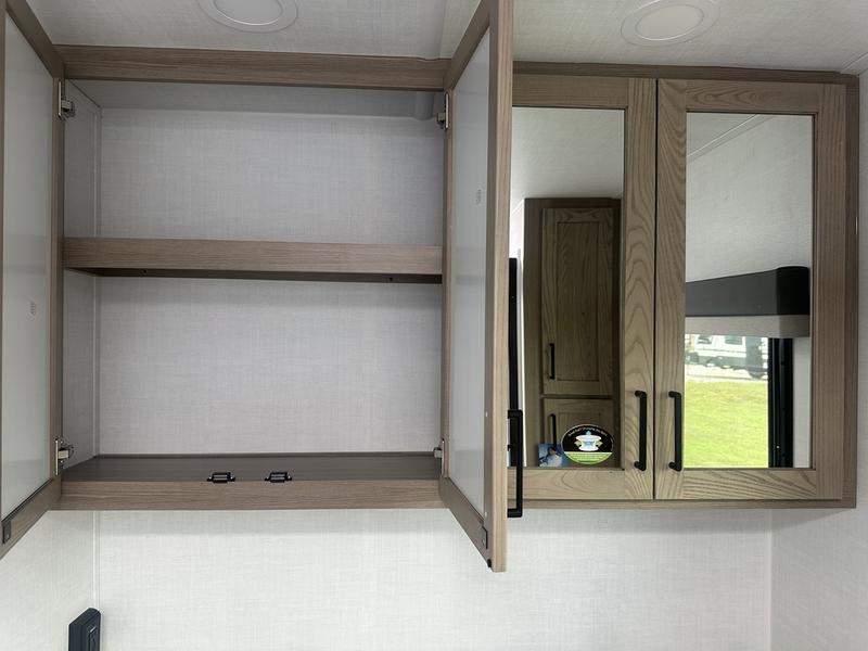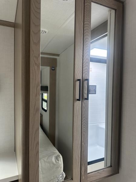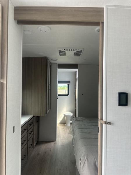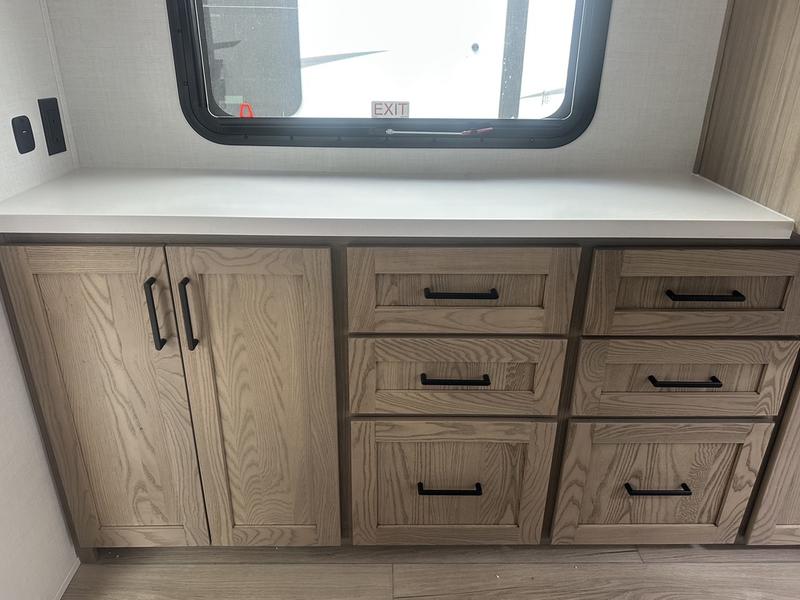 You will love how open this travel trailer will feel with the large front window that you can look out from the two-person bar top seating! The front kitchen has plenty of countertop space for you to prepare your best meals. Your nights will be spent in true relaxation with a 67" theater seating and king bed slide in the bedroom for a great night's rest. The full rear bathroom has a shower with a seat to take a nice, hot shower before bed, and a dual-sink vanity for two to get ready at once in the mornings!