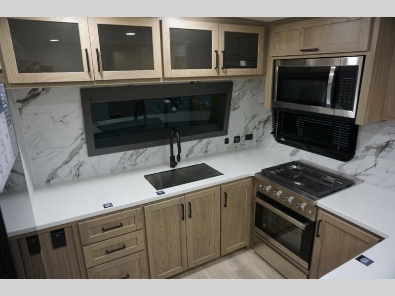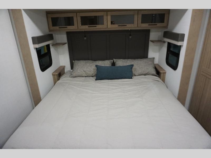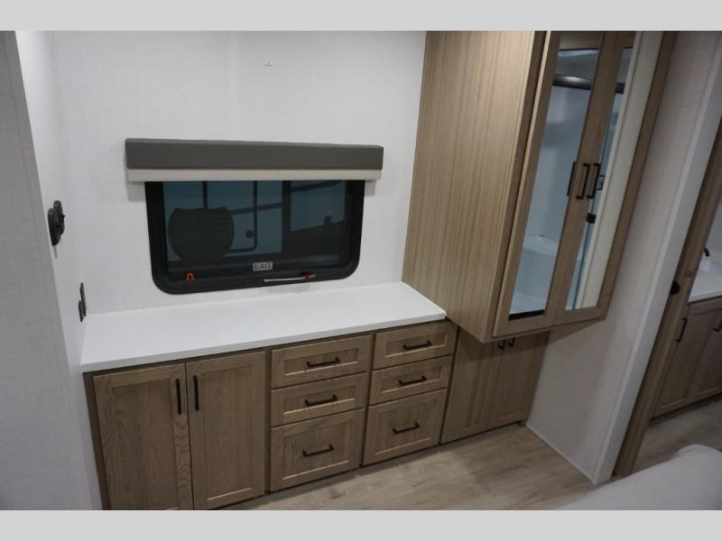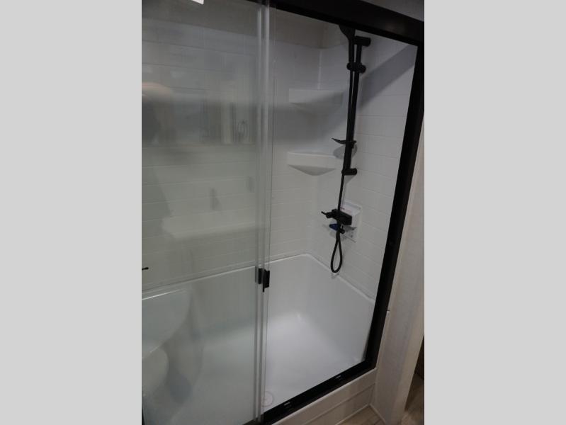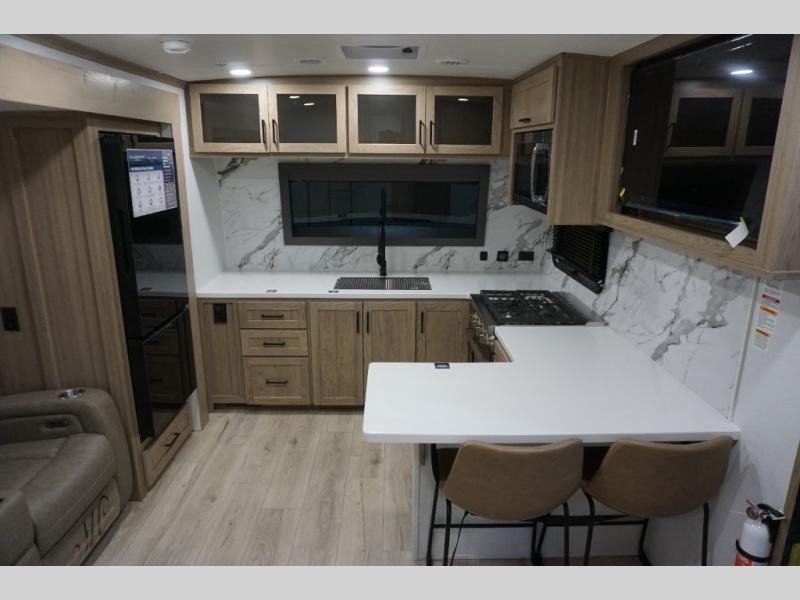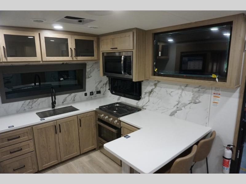 You will love how open this travel trailer will feel with the large front window that you can look out from the two-person bar top seating! The front kitchen has plenty of countertop space for you to prepare your best meals. Your nights will be spent in true relaxation with a 67" theater seating and king bed slide in the bedroom for a great night's rest. The full rear bathroom has a shower with a seat to take a nice, hot shower before bed, and a dual-sink vanity for two to get ready at once in the mornings!