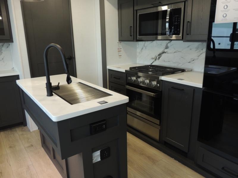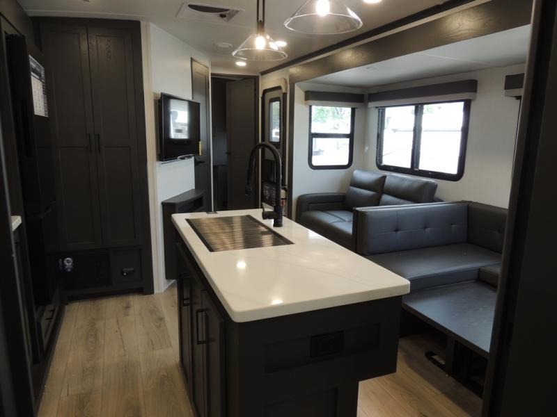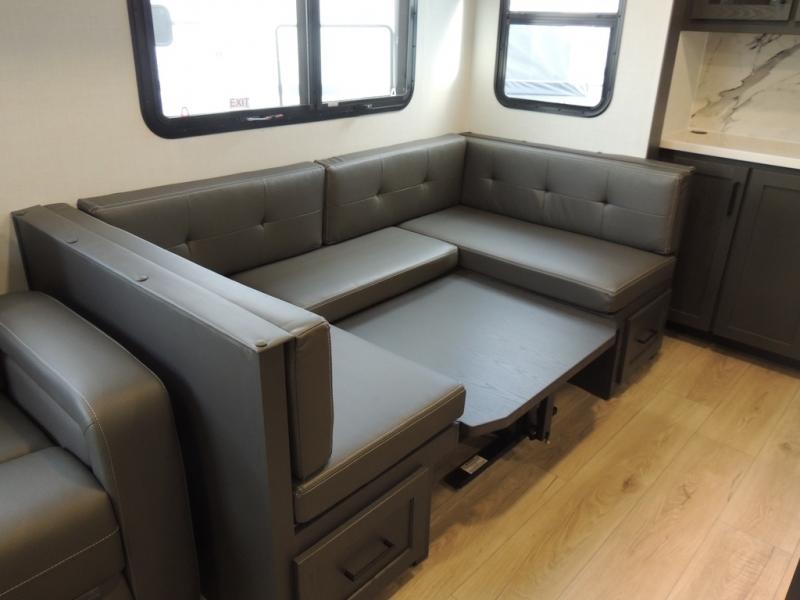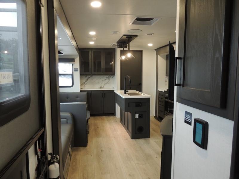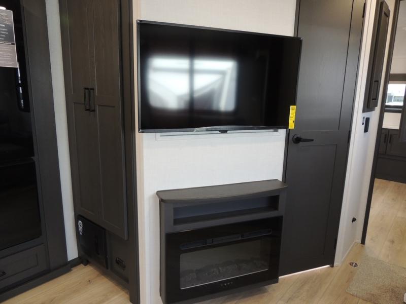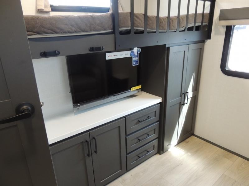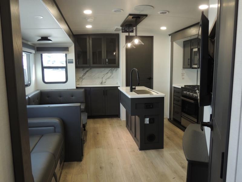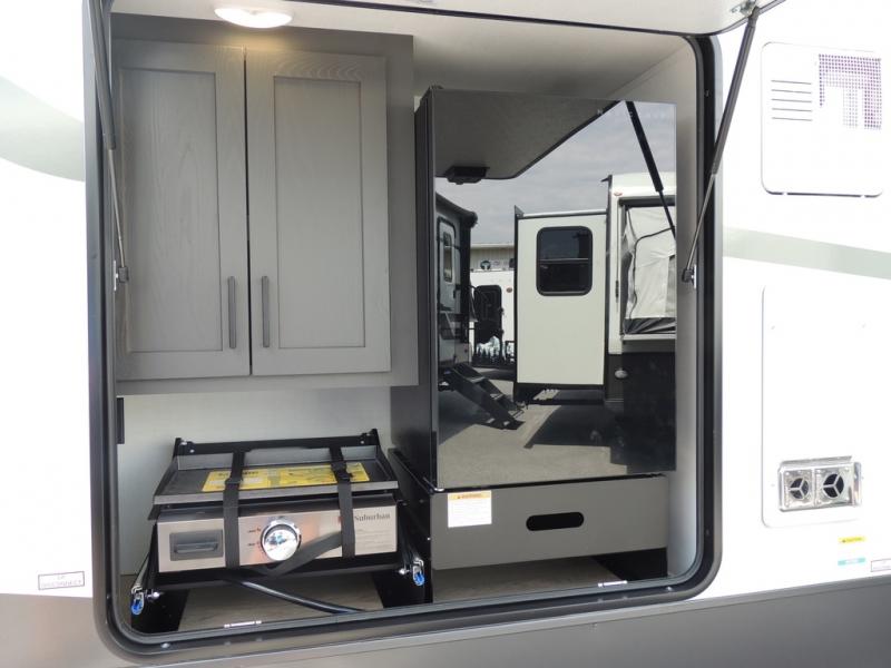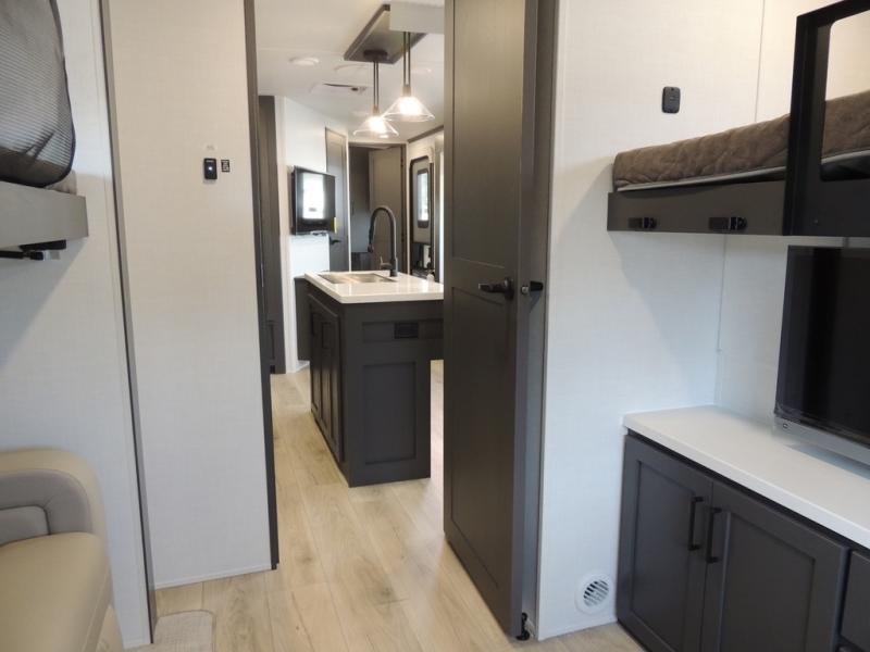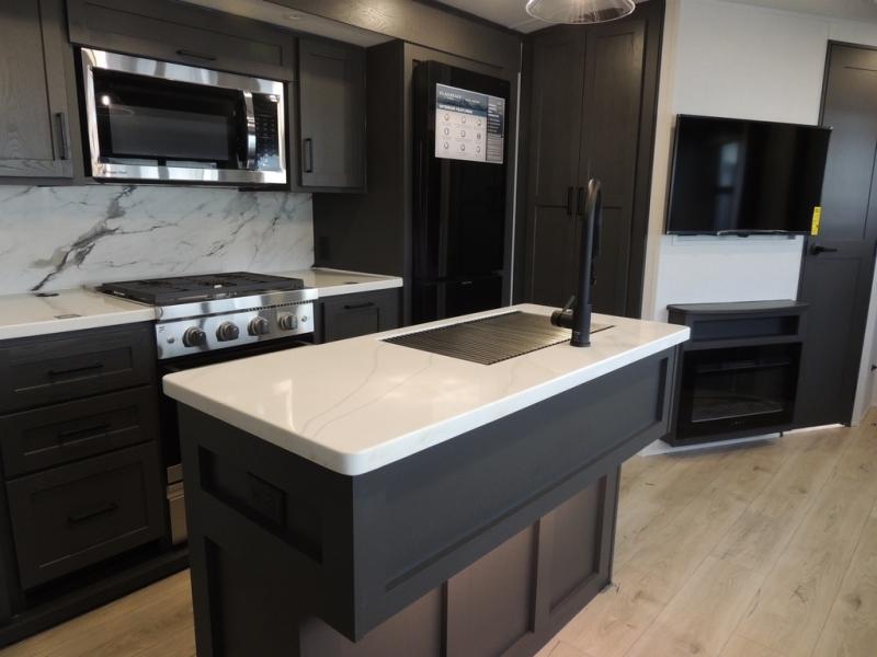 The whole family will love camping in this travel trailer! The kids have their own privacy within the rear bunkhouse that features a 42" x 72" upper bunk with a TV option below it along the curbside, and a flip-up bunk with a 68" pull-out sofa below it along the roadside. After you have prepared a delicious home-cooked meal with the three-burner cooktop and kitchen island, you can head to the 44" x 81" U-shaped dinette where everyone can gather around. You could even prepare dinner at the outside kitchen, set up a table and chairs, and eat underneath one of the two power awnings. The 60" hide-a-bed sofa is the perfect place to sit while enjoying the fireplace or watching your favorite movie on the Smart TV. A dual-entry bathroom makes it easy for everyone to access especially those staying in the front private bedroom!