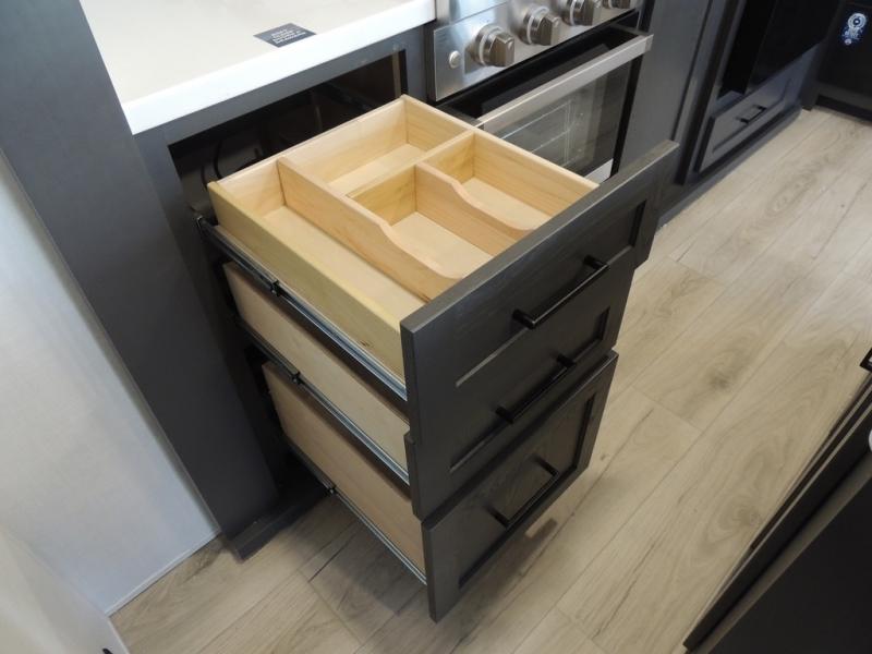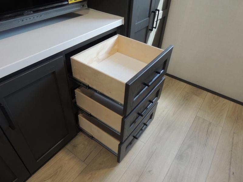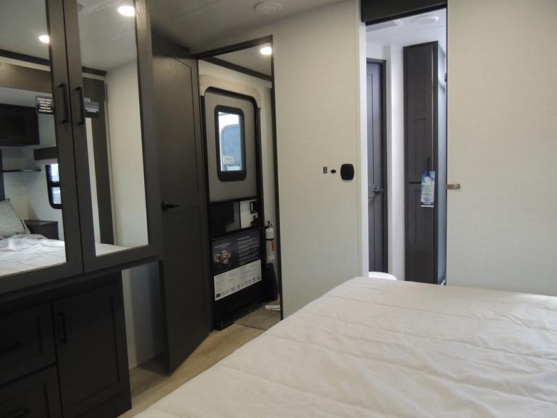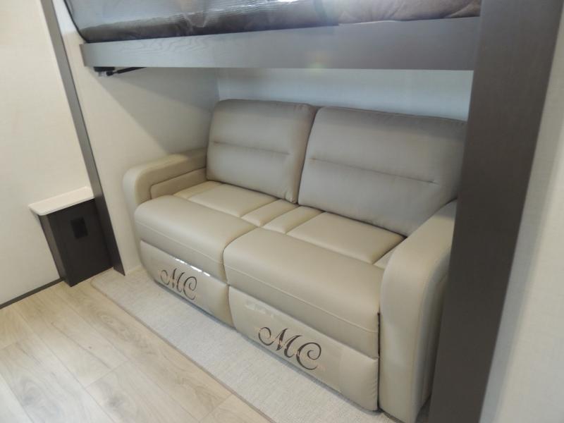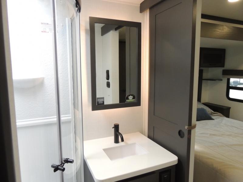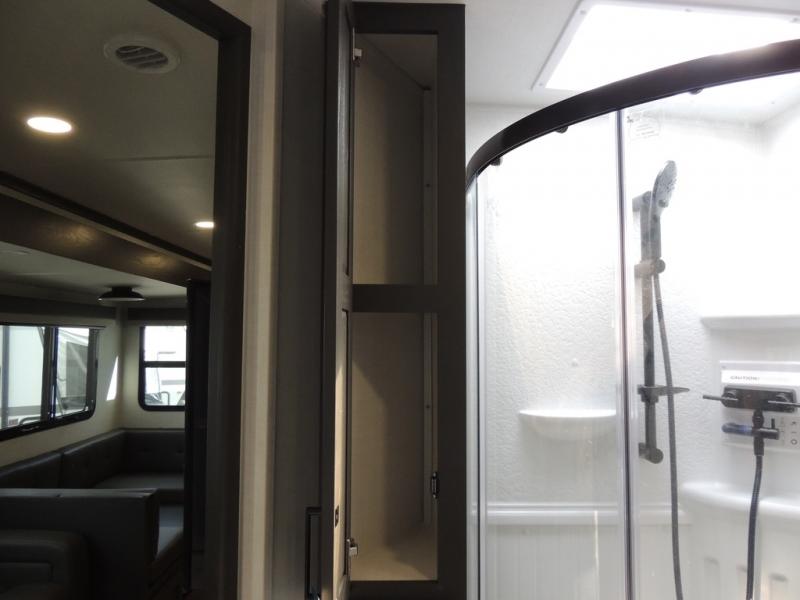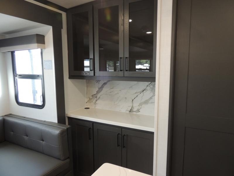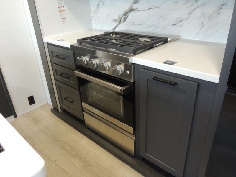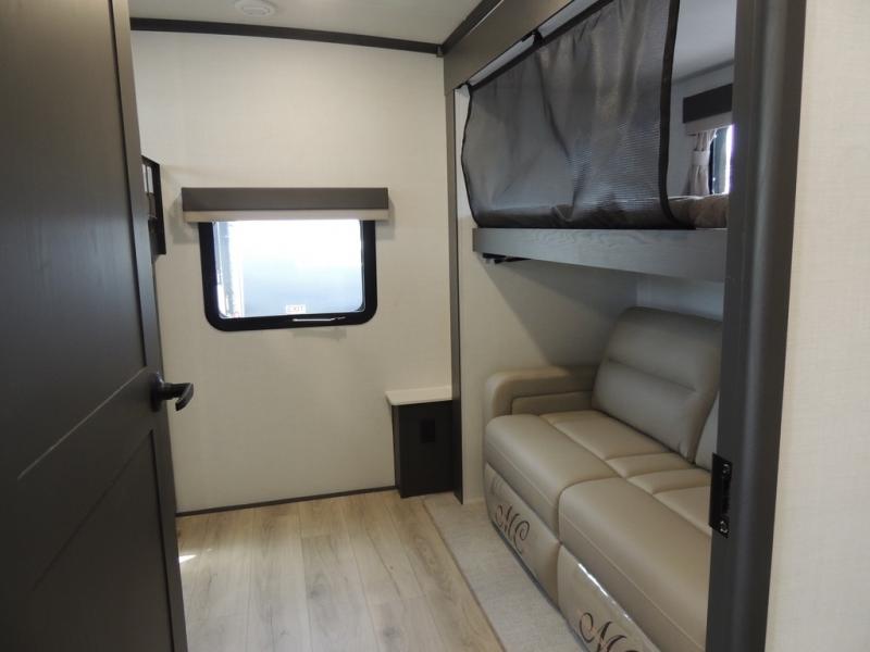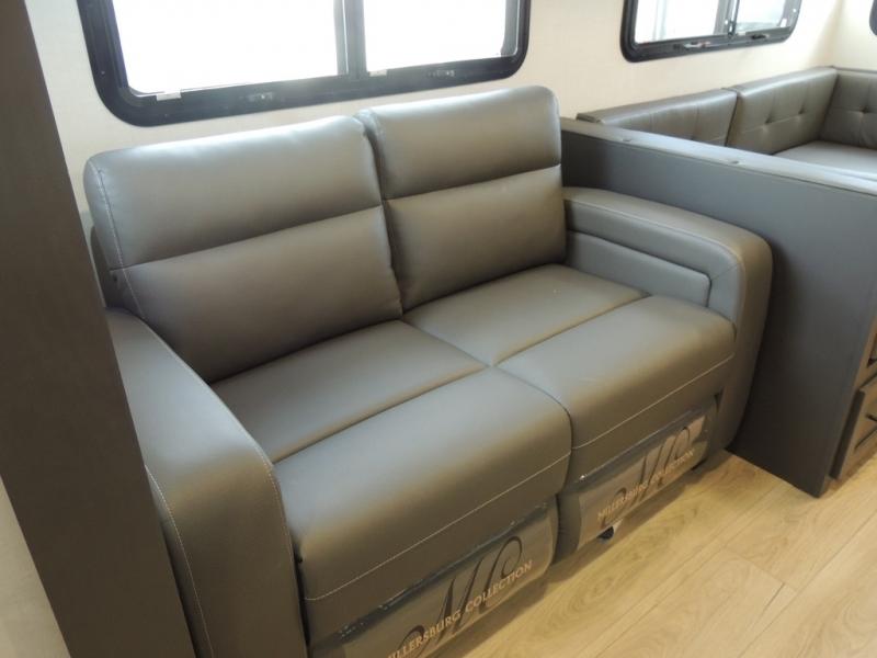 The whole family will love camping in this travel trailer! The kids have their own privacy within the rear bunkhouse that features a 42" x 72" upper bunk with a TV option below it along the curbside, and a flip-up bunk with a 68" pull-out sofa below it along the roadside. After you have prepared a delicious home-cooked meal with the three-burner cooktop and kitchen island, you can head to the 44" x 81" U-shaped dinette where everyone can gather around. You could even prepare dinner at the outside kitchen, set up a table and chairs, and eat underneath one of the two power awnings. The 60" hide-a-bed sofa is the perfect place to sit while enjoying the fireplace or watching your favorite movie on the Smart TV. A dual-entry bathroom makes it easy for everyone to access especially those staying in the front private bedroom!