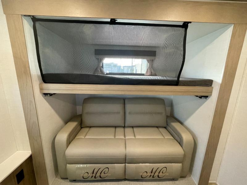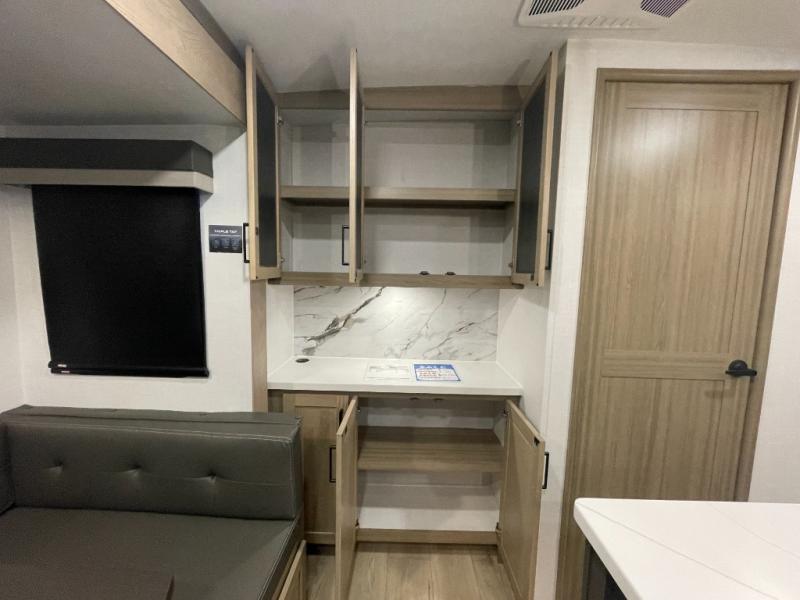 The whole family will love camping in this travel trailer! The kids have their own privacy within the rear bunkhouse that features a 42" x 72" upper bunk with a TV option below it along the curbside, and a flip-up bunk with a 68" pull-out sofa below it along the roadside. After you have prepared a delicious home-cooked meal with the three-burner cooktop and kitchen island, you can head to the 44" x 81" U-shaped dinette where everyone can gather around. You could even prepare dinner at the outside kitchen, set up a table and chairs, and eat underneath one of the two power awnings. The 60" hide-a-bed sofa is the perfect place to sit while enjoying the fireplace or watching your favorite movie on the Smart TV. A dual-entry bathroom makes it easy for everyone to access especially those staying in the front private bedroom!