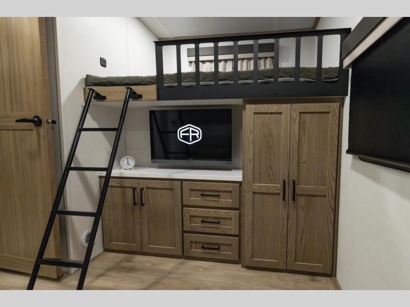 The whole family will love camping in this travel trailer! The kids have their own privacy within the rear bunkhouse that features a 42" x 72" upper bunk with a TV option below it along the curbside, and a flip-up bunk with a 68" pull-out sofa below it along the roadside. After you have prepared a delicious home-cooked meal with the three-burner cooktop and kitchen island, you can head to the 44" x 81" U-shaped dinette where everyone can gather around. You could even prepare dinner at the outside kitchen, set up a table and chairs, and eat underneath one of the two power awnings. The 60" hide-a-bed sofa is the perfect place to sit while enjoying the fireplace or watching your favorite movie on the Smart TV. A dual-entry bathroom makes it easy for everyone to access especially those staying in the front private bedroom!