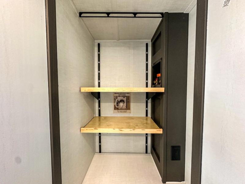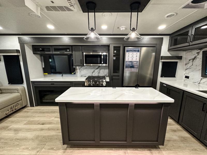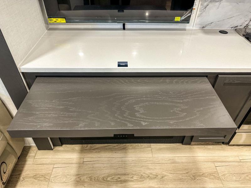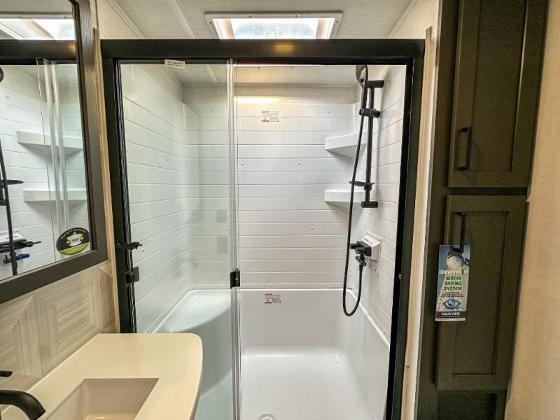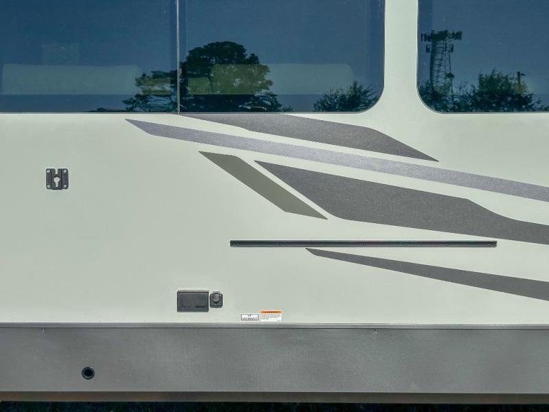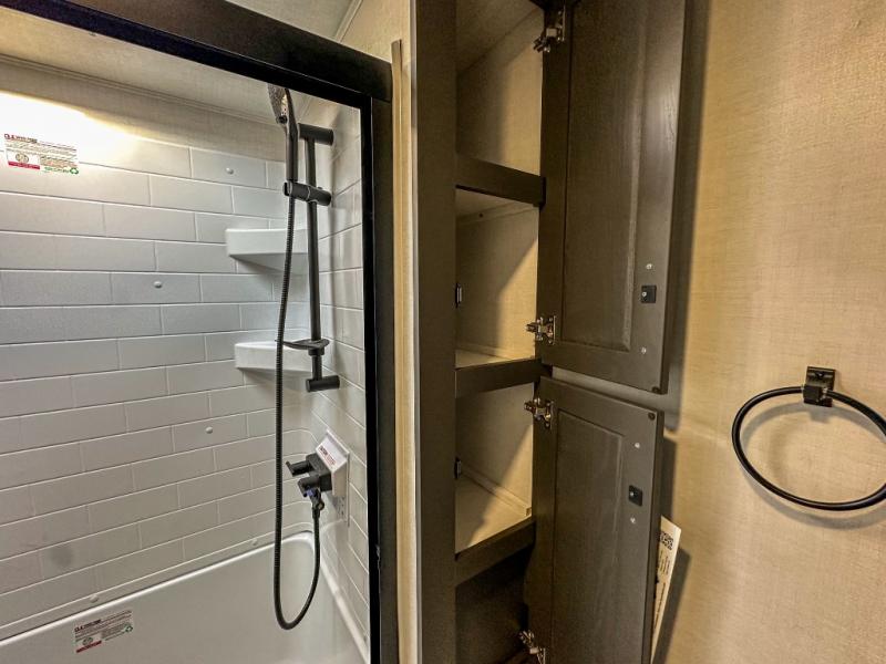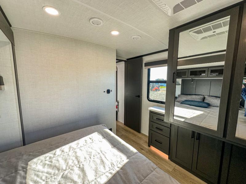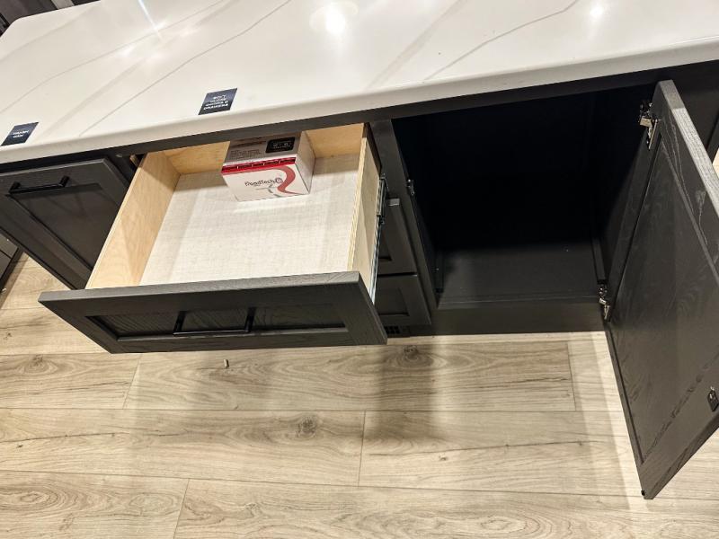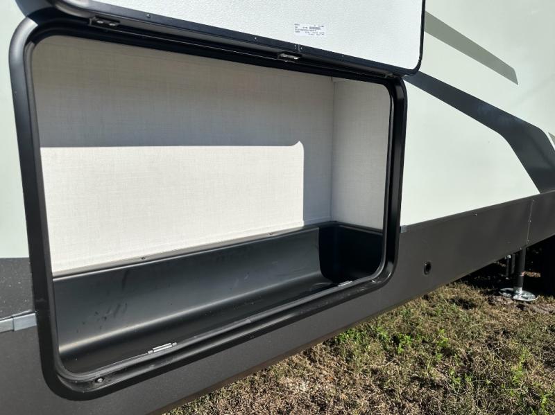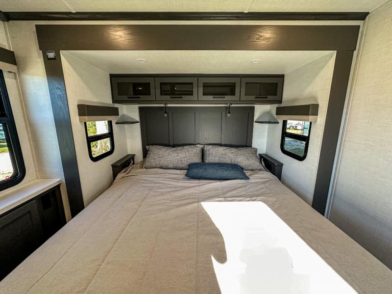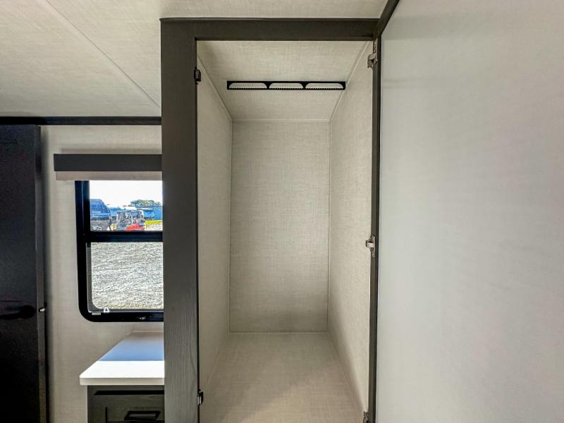 Pack your bags and head for the campground in this spacious travel trailer for four! There are dual opposing slides in the combined kitchen and living room plus a third slide out in the rear bedroom. You're sure to get a great night's rest on the king bed, and you can keep your room picked up thanks to the dresser and wardrobe. There is even washer and dryer prep if you choose to add those appliances. There are plenty of spaces to relax, including a theater seat and a hide-a-bed sofa, which will double as your guests' sleeping space. A large kitchen island and generous counter space lets the chef of your group whip up their best meals, and there is a table, chairs and a bench for dining space.