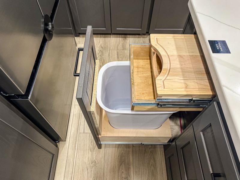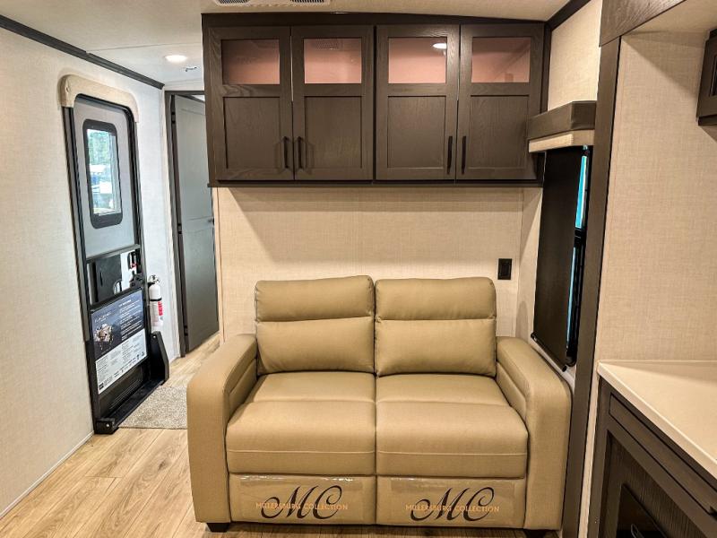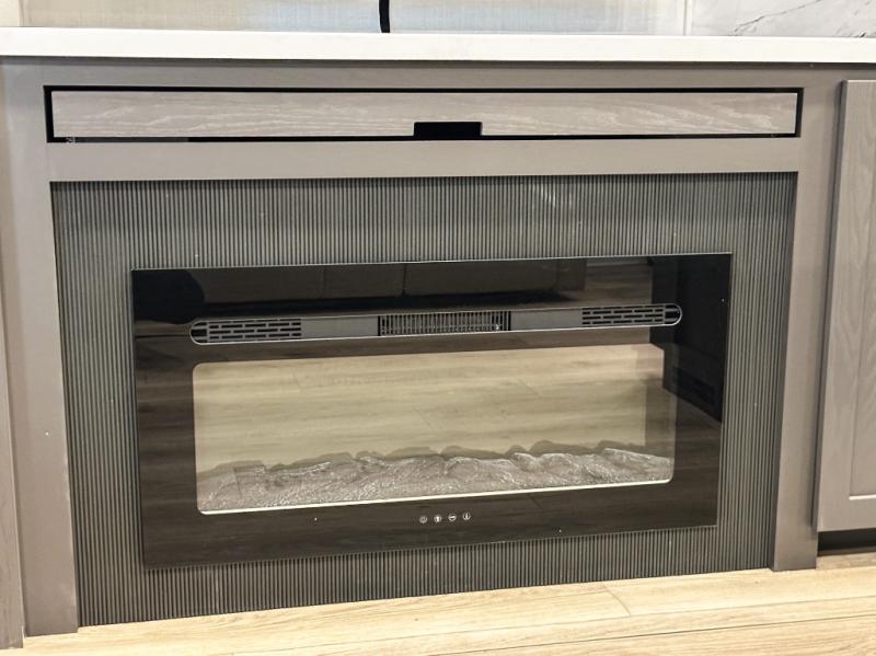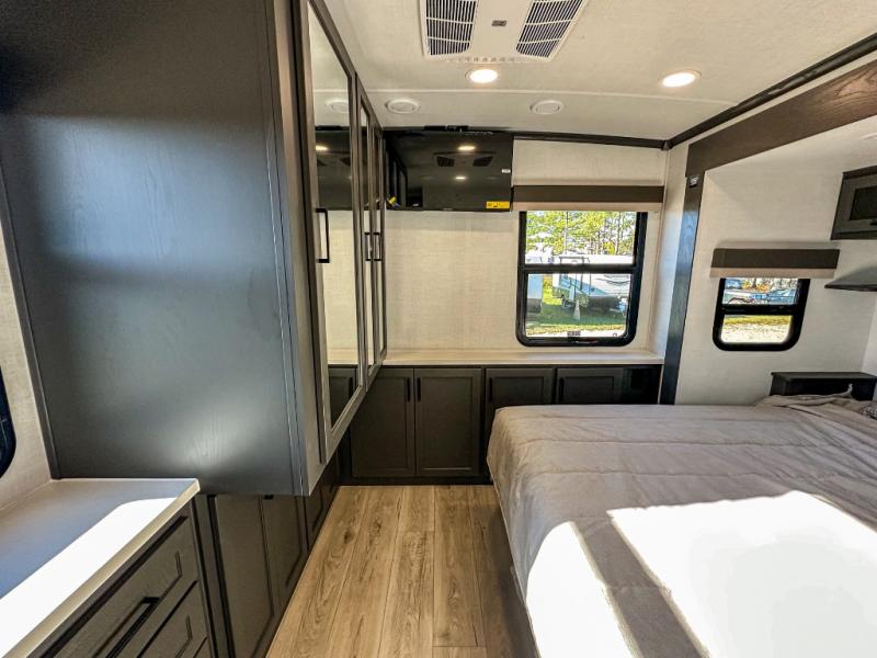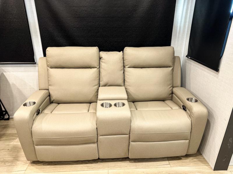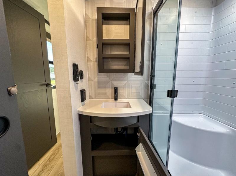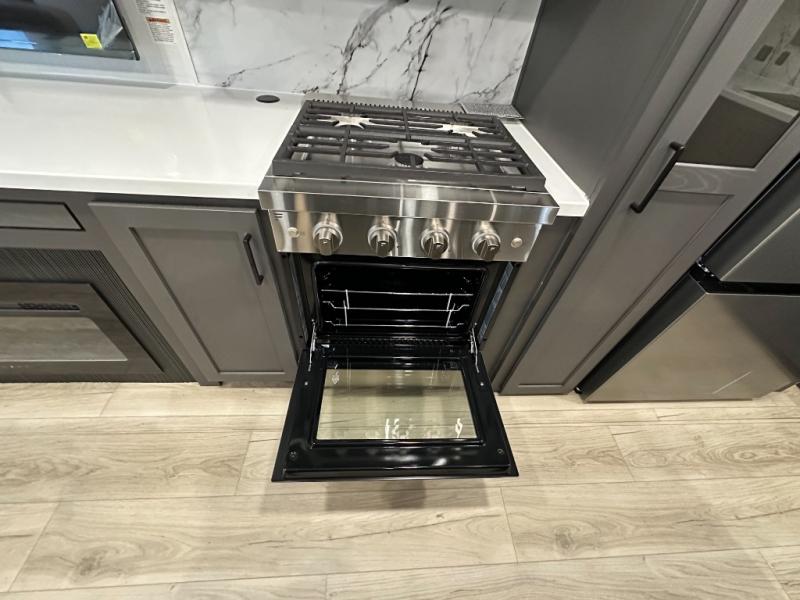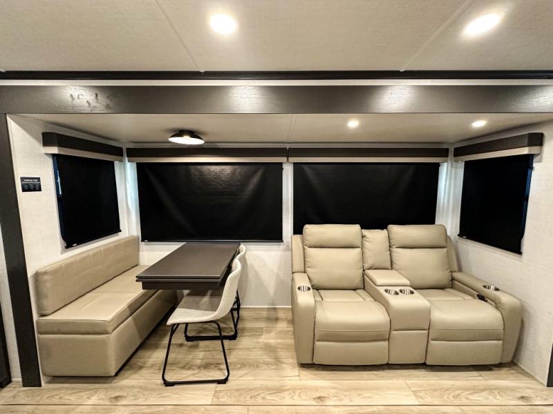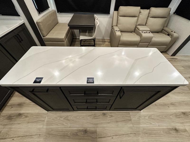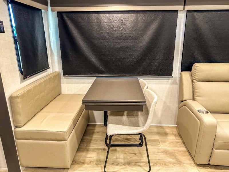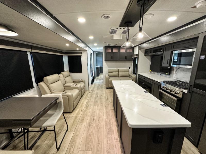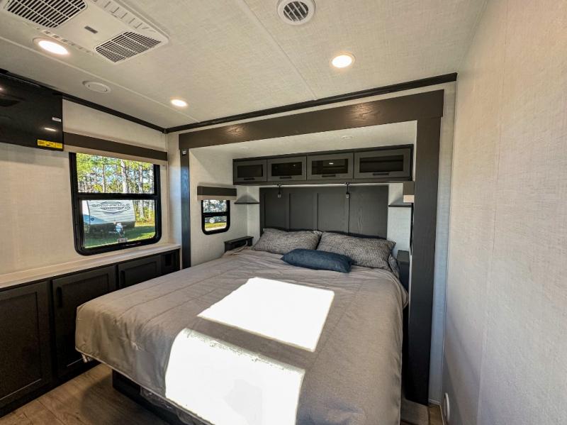 Pack your bags and head for the campground in this spacious travel trailer for four! There are dual opposing slides in the combined kitchen and living room plus a third slide out in the rear bedroom. You're sure to get a great night's rest on the king bed, and you can keep your room picked up thanks to the dresser and wardrobe. There is even washer and dryer prep if you choose to add those appliances. There are plenty of spaces to relax, including a theater seat and a hide-a-bed sofa, which will double as your guests' sleeping space. A large kitchen island and generous counter space lets the chef of your group whip up their best meals, and there is a table, chairs and a bench for dining space.
