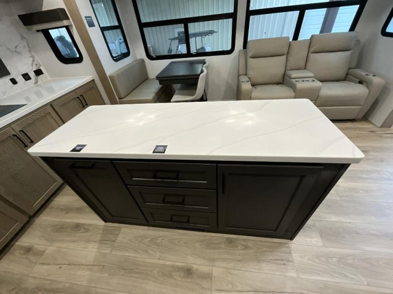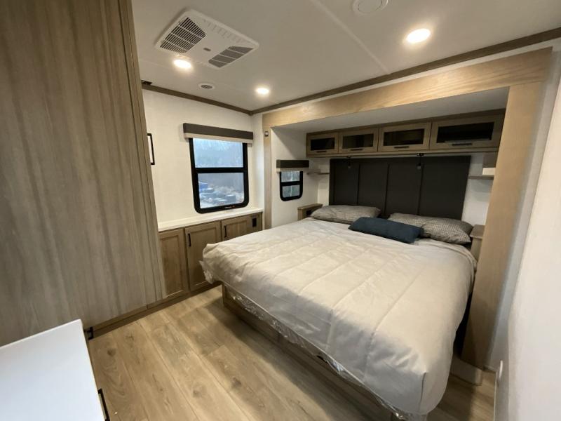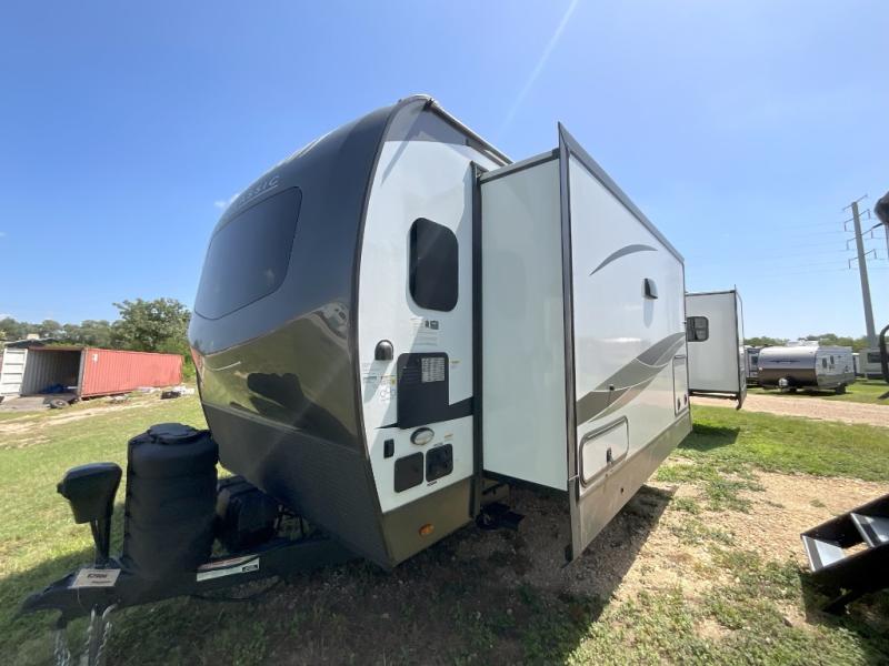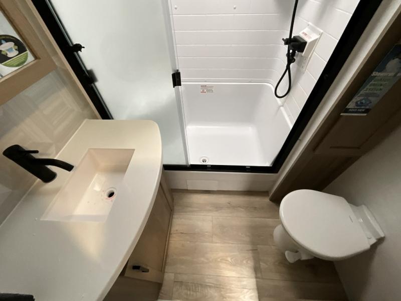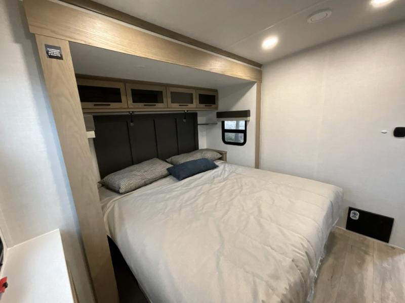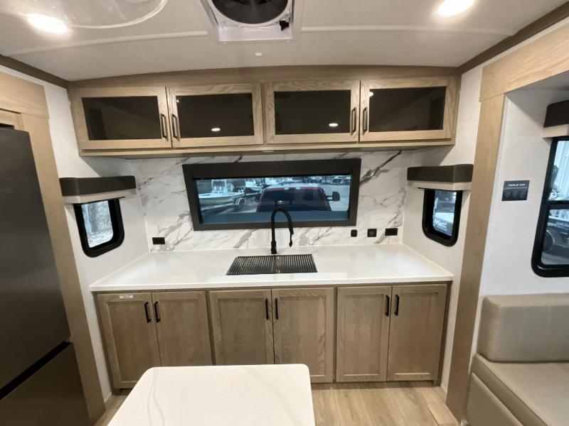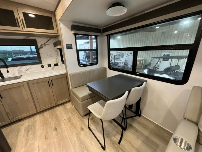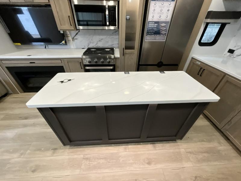 Pack your bags and head for the campground in this spacious travel trailer for four! There are dual opposing slides in the combined kitchen and living room plus a third slide out in the rear bedroom. You're sure to get a great night's rest on the king bed, and you can keep your room picked up thanks to the dresser and wardrobe. There is even washer and dryer prep if you choose to add those appliances. There are plenty of spaces to relax, including a theater seat and a hide-a-bed sofa, which will double as your guests' sleeping space. A large kitchen island and generous counter space lets the chef of your group whip up their best meals, and there is a table, chairs and a bench for dining space.