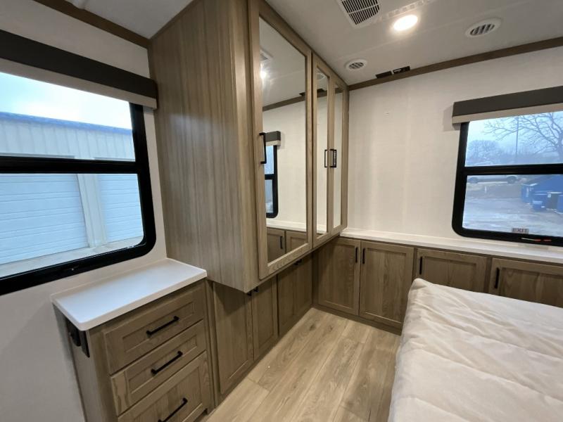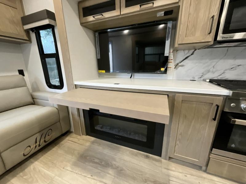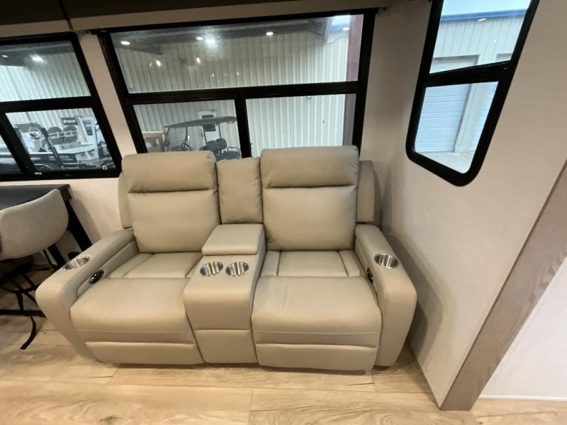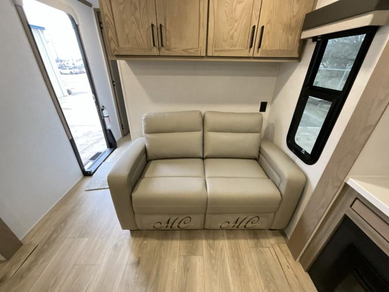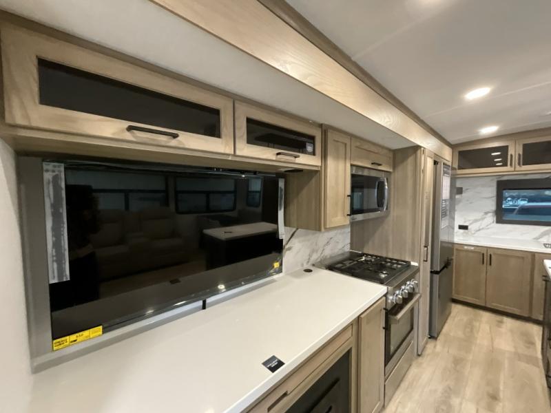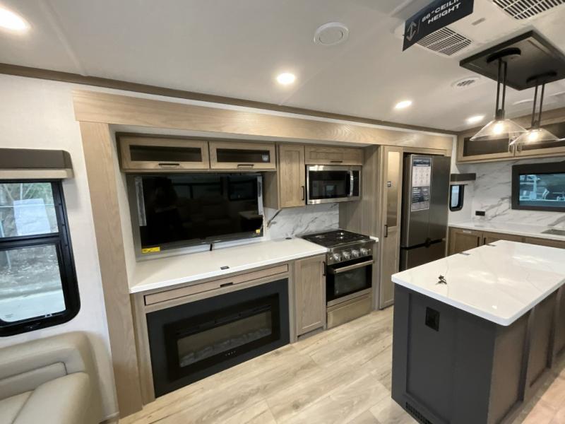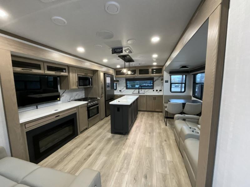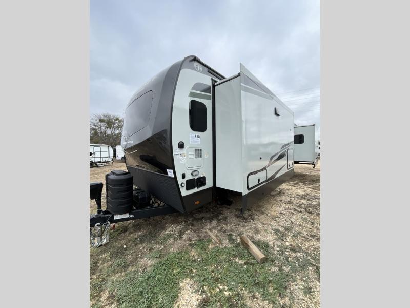 Pack your bags and head for the campground in this spacious travel trailer for four! There are dual opposing slides in the combined kitchen and living room plus a third slide out in the rear bedroom. You're sure to get a great night's rest on the king bed, and you can keep your room picked up thanks to the dresser and wardrobe. There is even washer and dryer prep if you choose to add those appliances. There are plenty of spaces to relax, including a theater seat and a hide-a-bed sofa, which will double as your guests' sleeping space. A large kitchen island and generous counter space lets the chef of your group whip up their best meals, and there is a table, chairs and a bench for dining space.