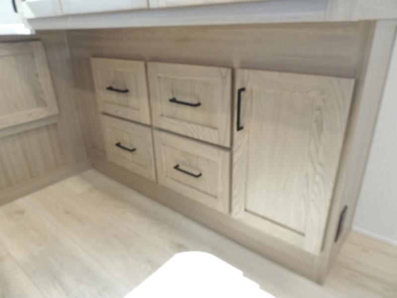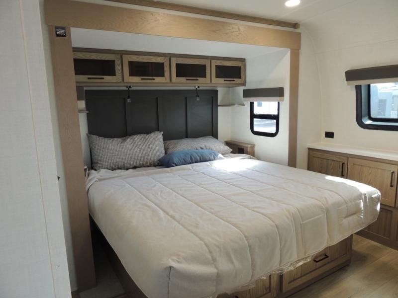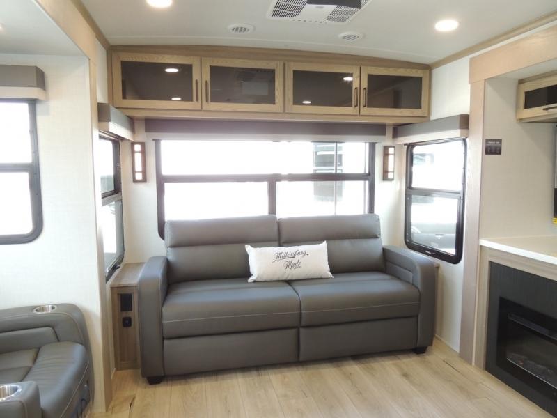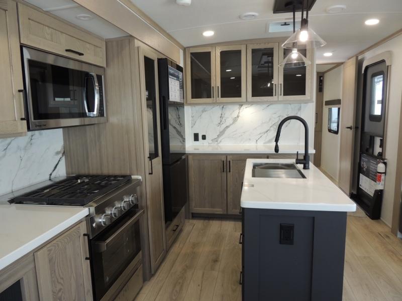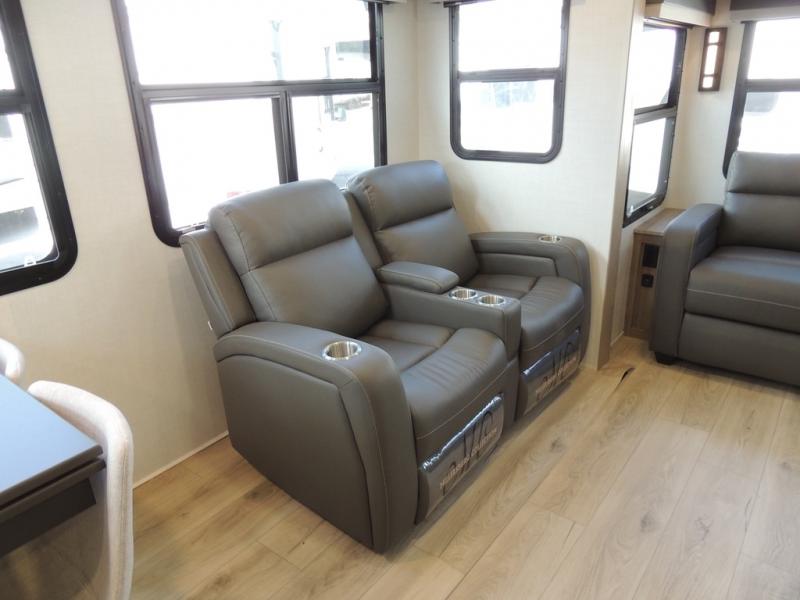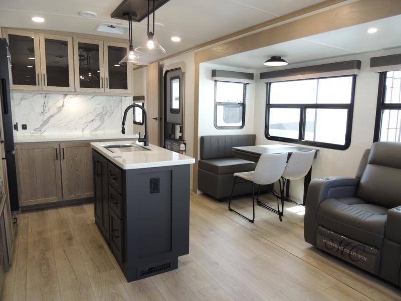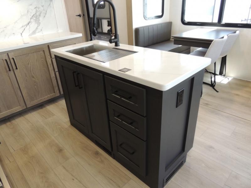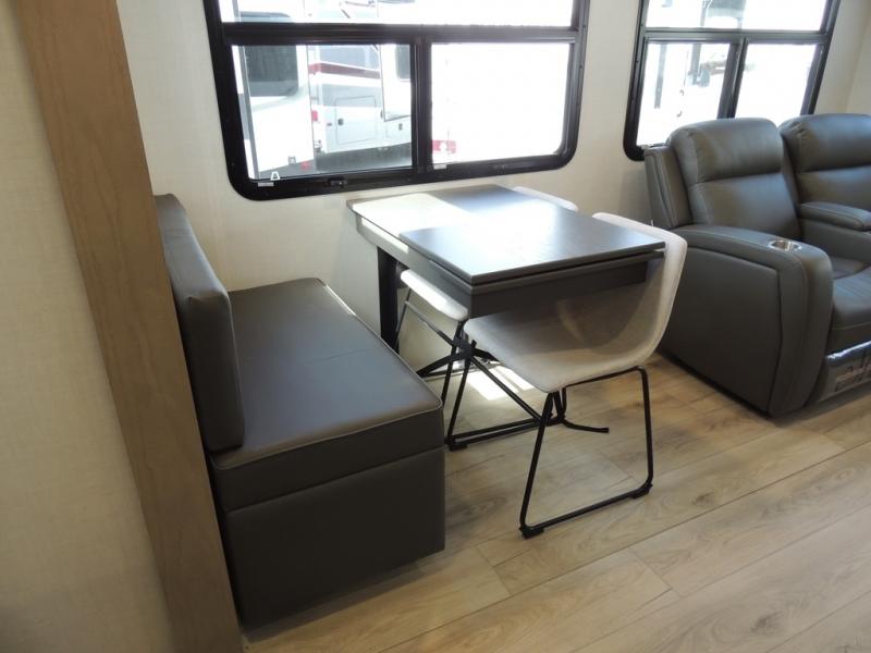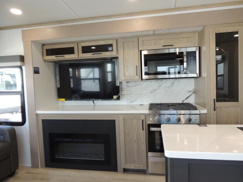 The large windows in the rear and door side slide will bring nature's scenery indoors with this travel trailer! Everyone can relax together in the rear living area featuring a 78" hide-a-bed sofa and 60" theater seating across from the entertainment center with a fireplace. Meal prepping will be even easier with the kitchen island, and the table and chairs with a bench is a comfortable place to enjoy your meals. The full bathroom has a shower with a seat and a linen closet to keep your towels close. You will feel well rested each morning after sleeping on the king bed slide in the front private bedroom which also has a wardrobe with washer and dryer prep and an area to add an optional TV!
