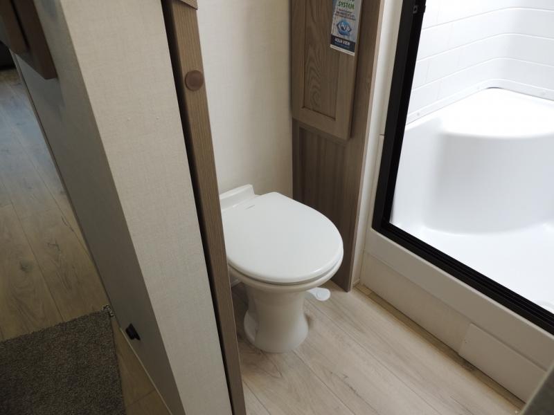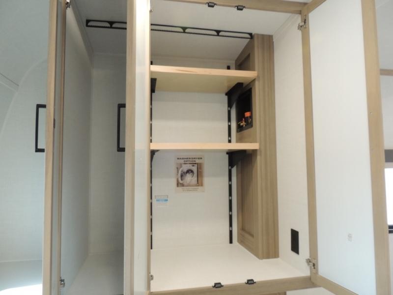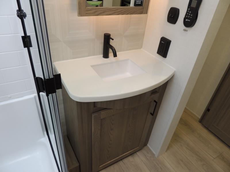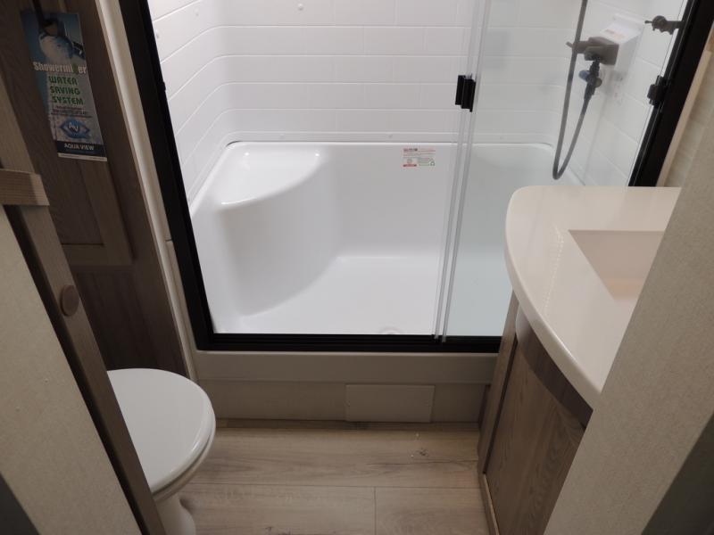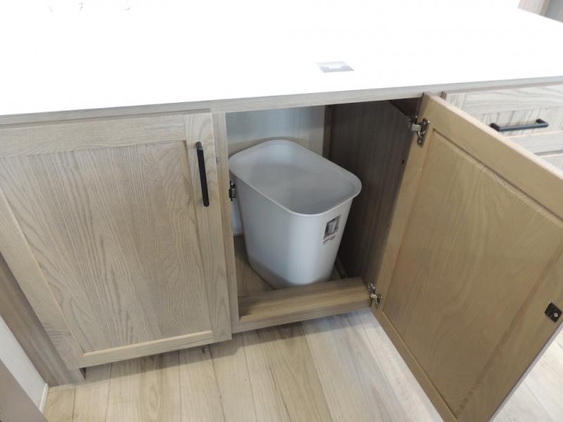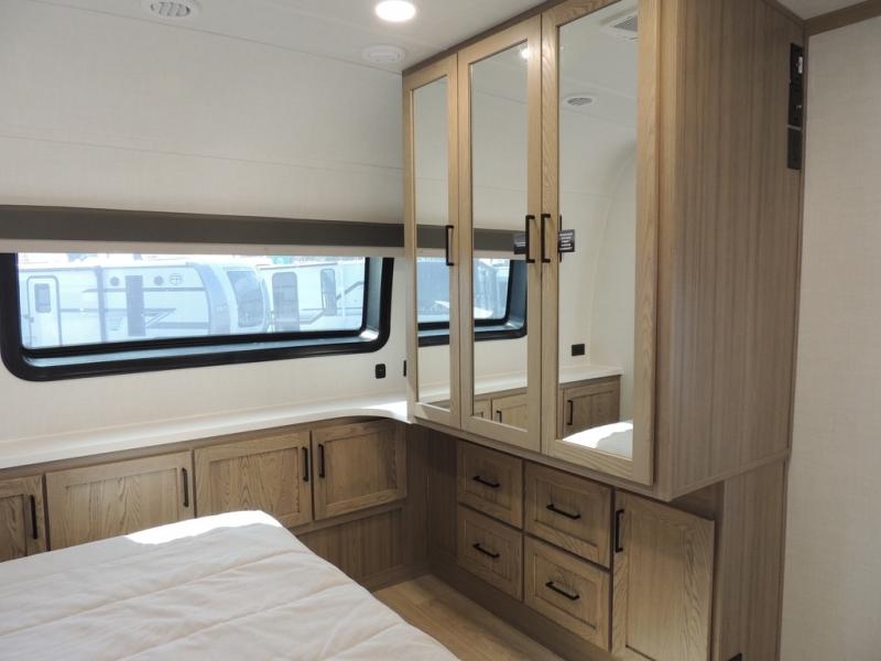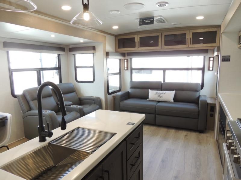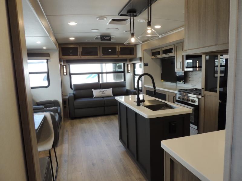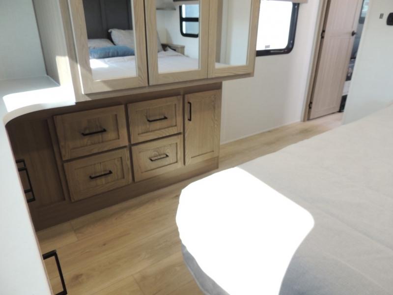 The large windows in the rear and door side slide will bring nature's scenery indoors with this travel trailer! Everyone can relax together in the rear living area featuring a 78" hide-a-bed sofa and 60" theater seating across from the entertainment center with a fireplace. Meal prepping will be even easier with the kitchen island, and the table and chairs with a bench is a comfortable place to enjoy your meals. The full bathroom has a shower with a seat and a linen closet to keep your towels close. You will feel well rested each morning after sleeping on the king bed slide in the front private bedroom which also has a wardrobe with washer and dryer prep and an area to add an optional TV!