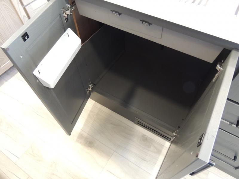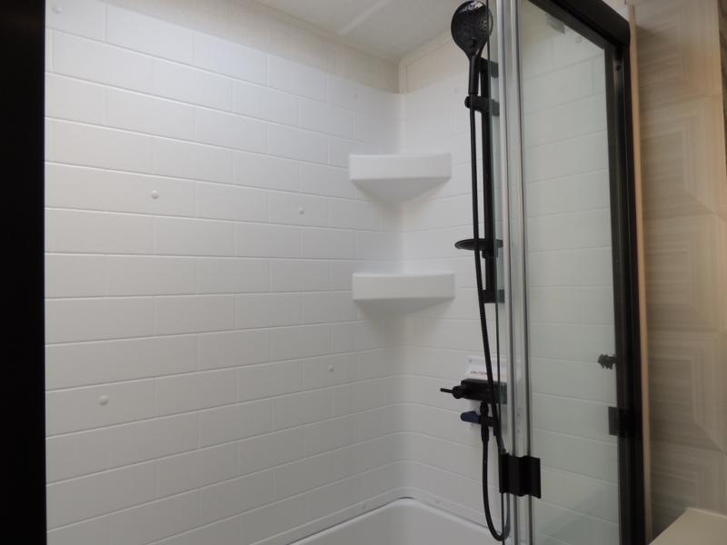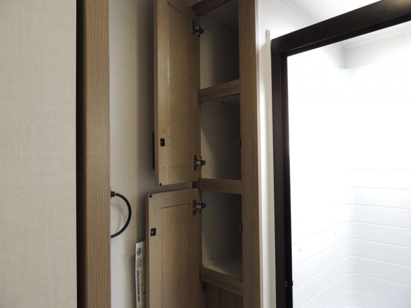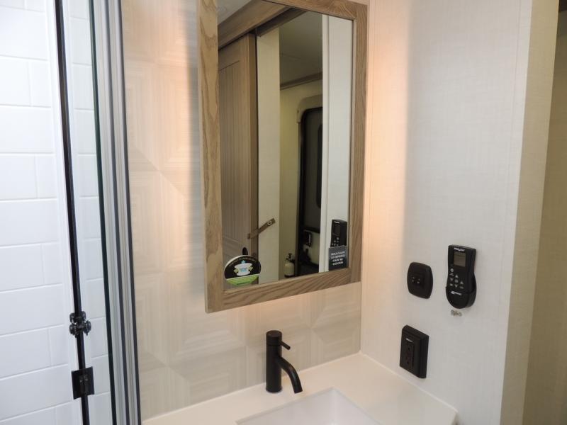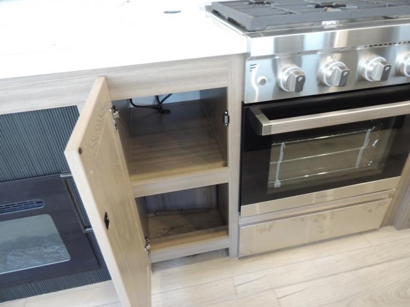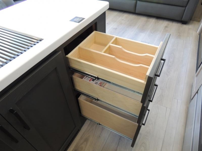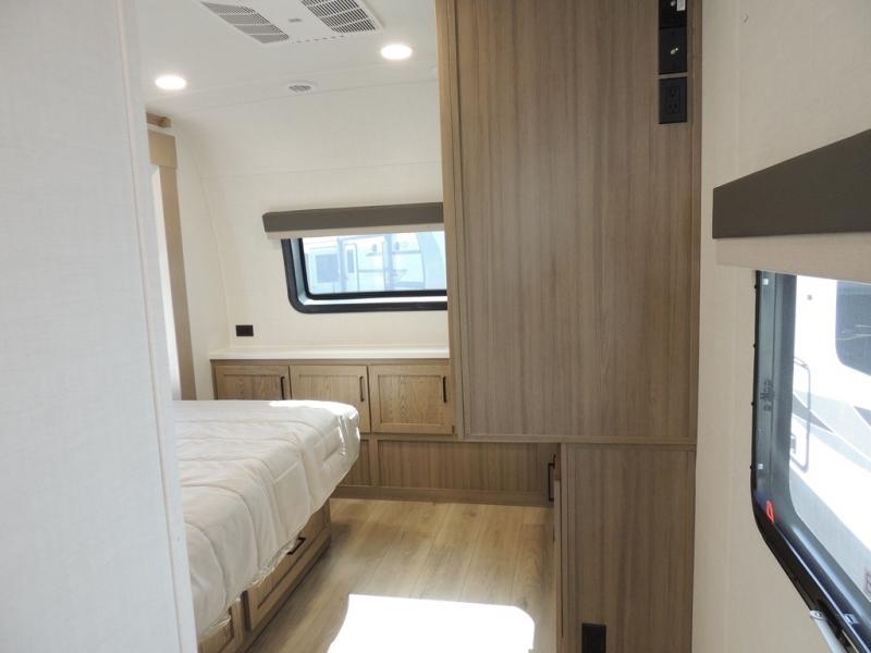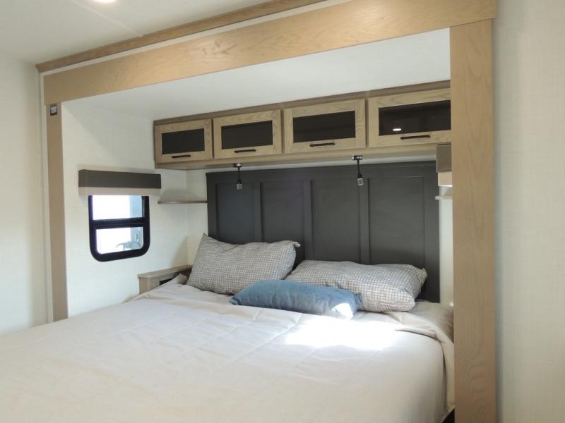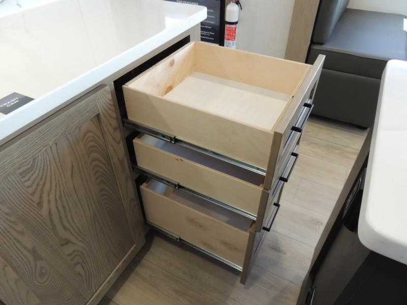 The large windows in the rear and door side slide will bring nature's scenery indoors with this travel trailer! Everyone can relax together in the rear living area featuring a 78" hide-a-bed sofa and 60" theater seating across from the entertainment center with a fireplace. Meal prepping will be even easier with the kitchen island, and the table and chairs with a bench is a comfortable place to enjoy your meals. The full bathroom has a shower with a seat and a linen closet to keep your towels close. You will feel well rested each morning after sleeping on the king bed slide in the front private bedroom which also has a wardrobe with washer and dryer prep and an area to add an optional TV!
