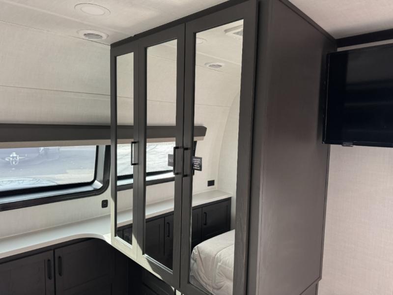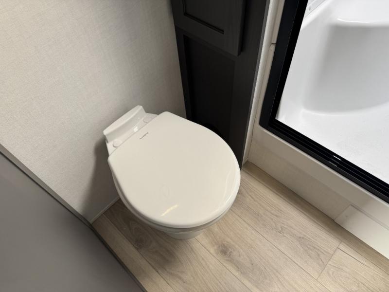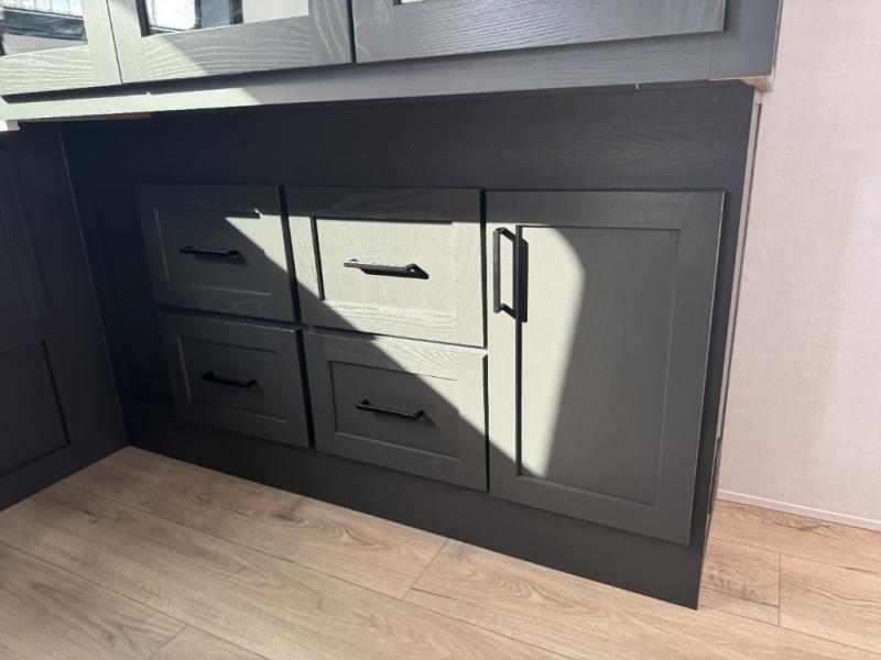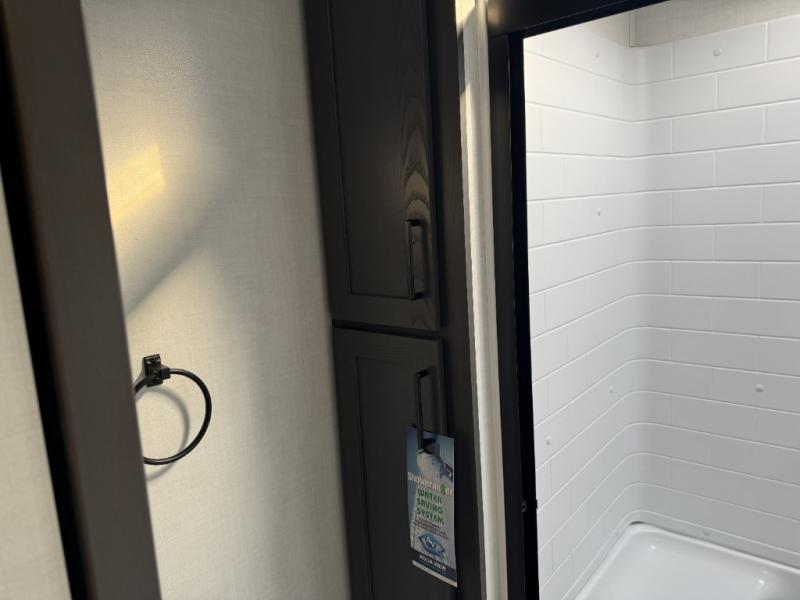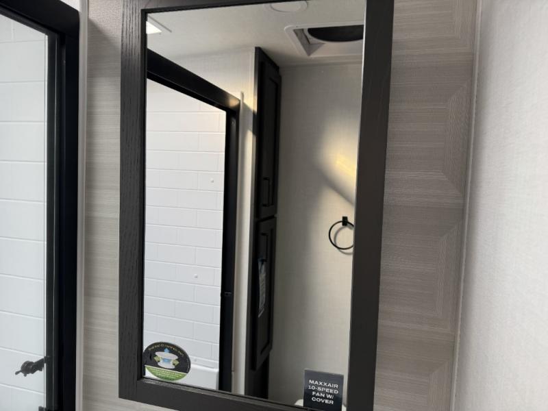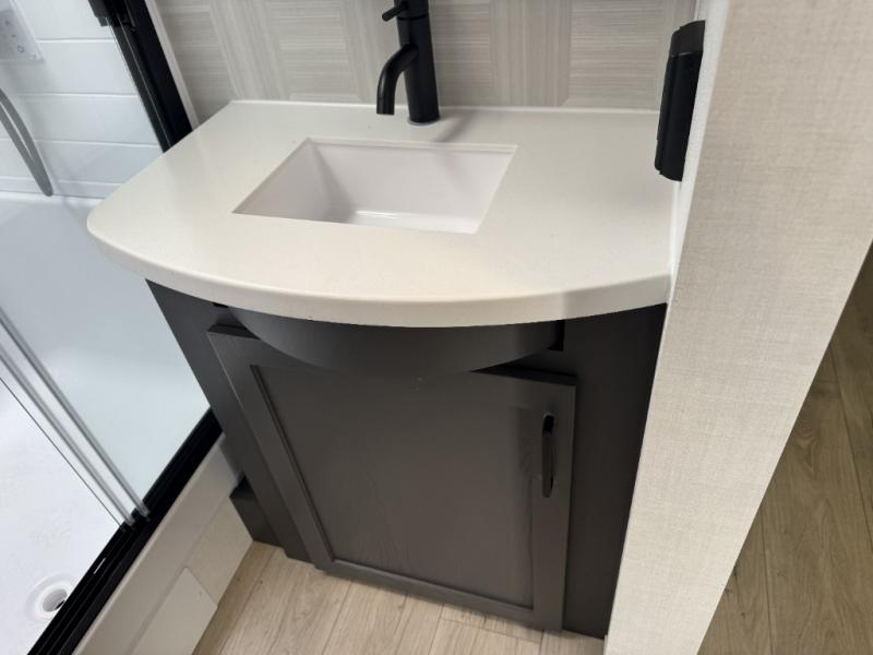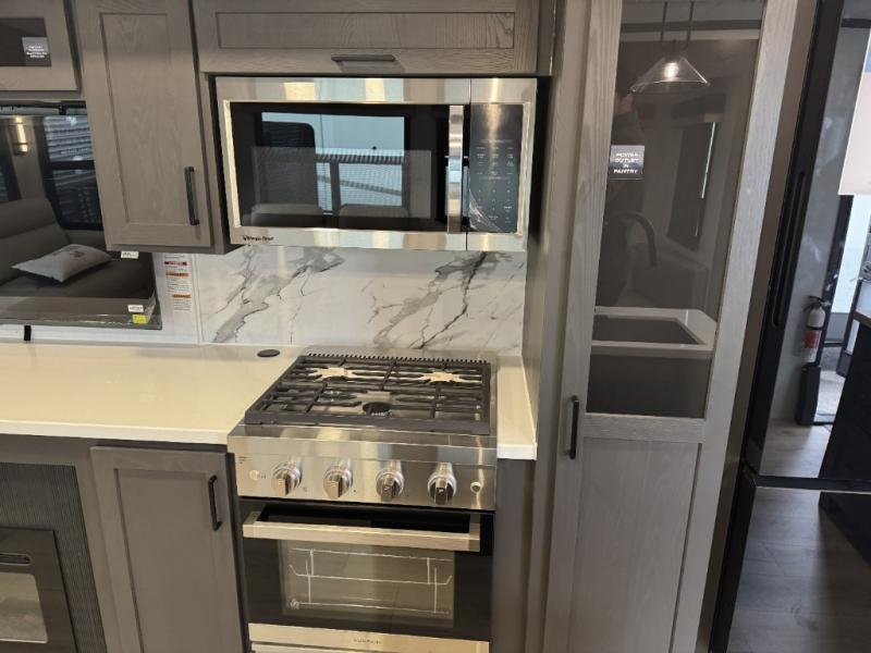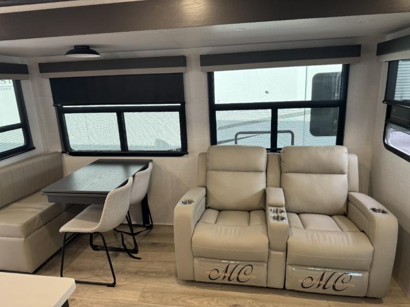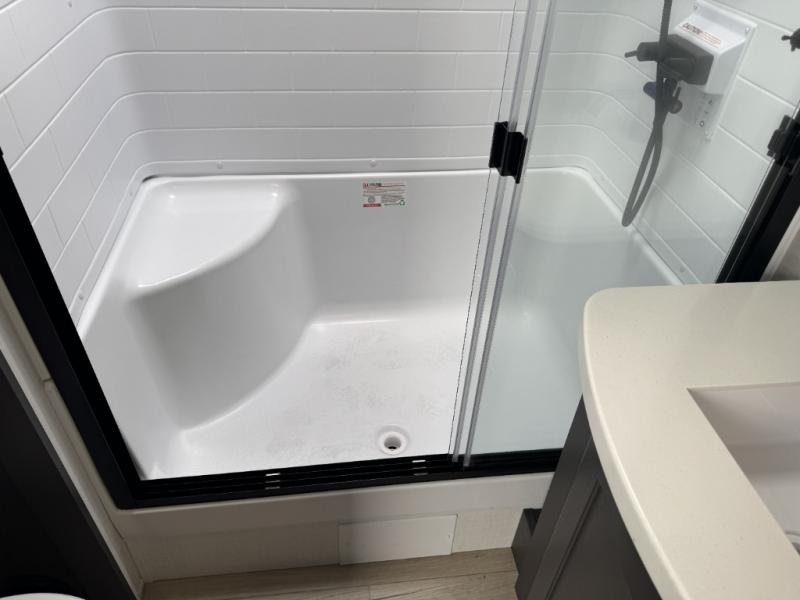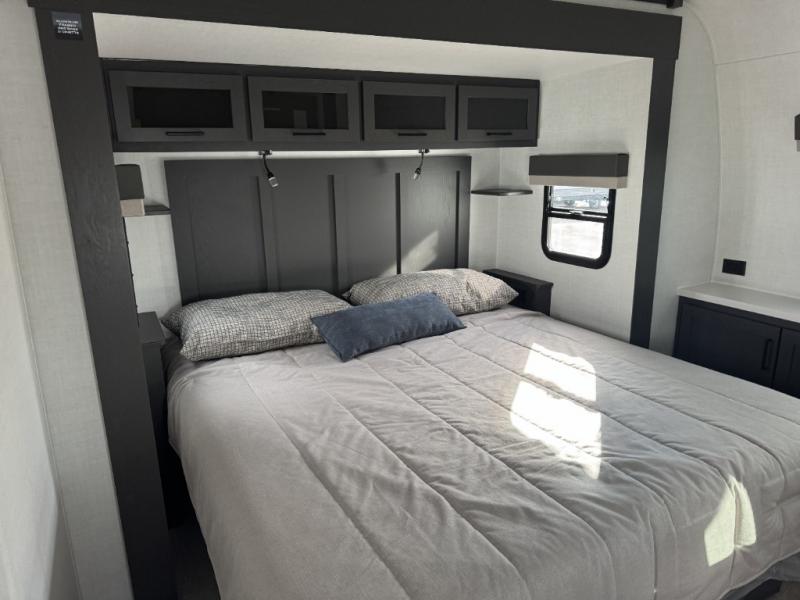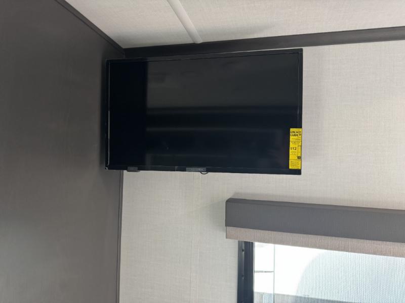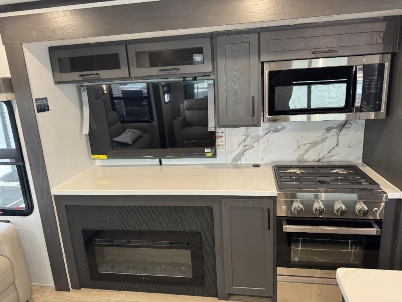 The large windows in the rear and door side slide will bring nature's scenery indoors with this travel trailer! Everyone can relax together in the rear living area featuring a 78" hide-a-bed sofa and 60" theater seating across from the entertainment center with a fireplace. Meal prepping will be even easier with the kitchen island, and the table and chairs with a bench is a comfortable place to enjoy your meals. The full bathroom has a shower with a seat and a linen closet to keep your towels close. You will feel well rested each morning after sleeping on the king bed slide in the front private bedroom which also has a wardrobe with washer and dryer prep and an area to add an optional TV!