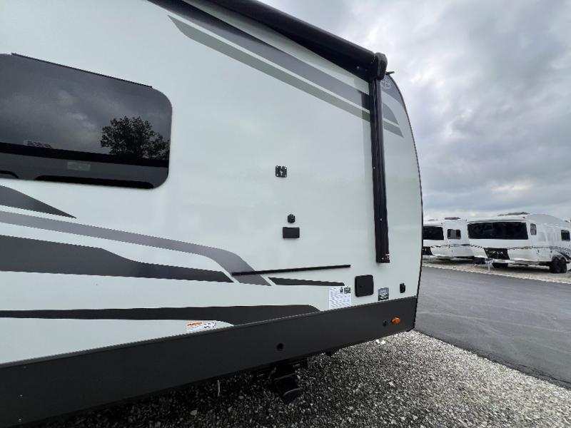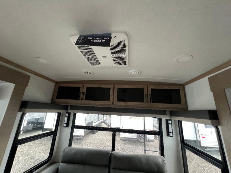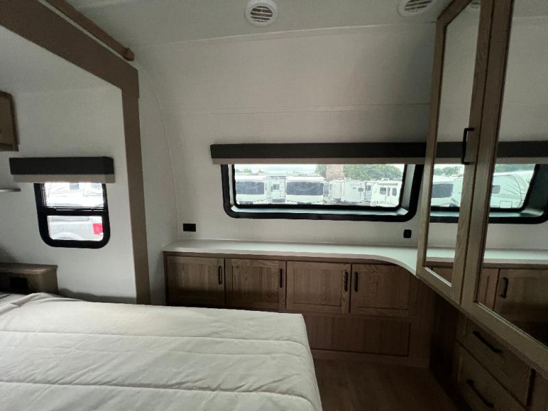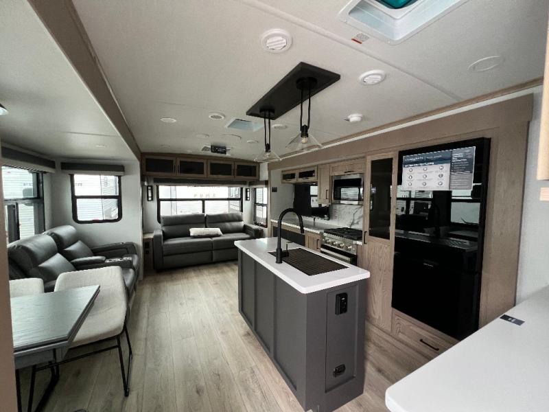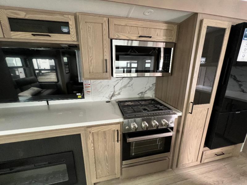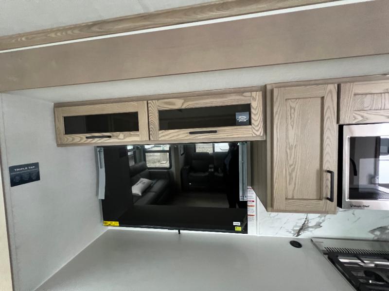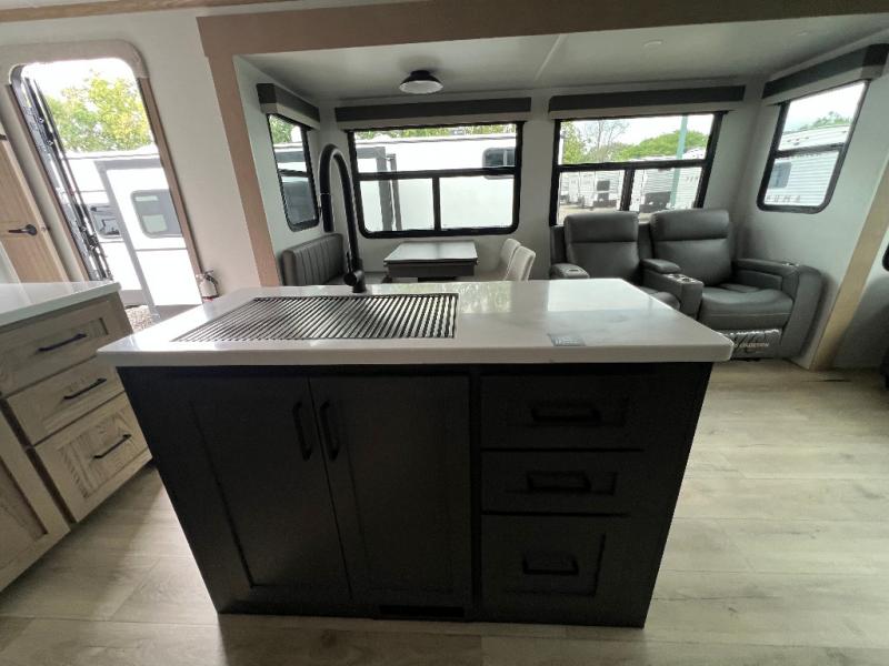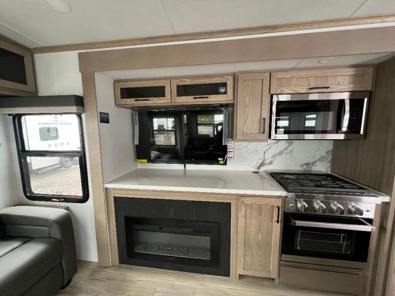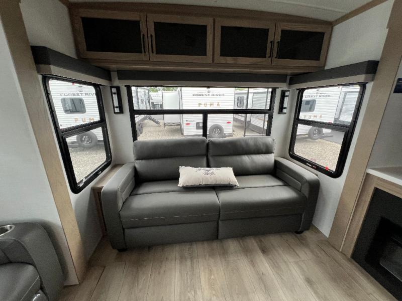 The large windows in the rear and door side slide will bring nature's scenery indoors with this travel trailer! Everyone can relax together in the rear living area featuring a 78" hide-a-bed sofa and 60" theater seating across from the entertainment center with a fireplace. Meal prepping will be even easier with the kitchen island, and the table and chairs with a bench is a comfortable place to enjoy your meals. The full bathroom has a shower with a seat and a linen closet to keep your towels close. You will feel well rested each morning after sleeping on the king bed slide in the front private bedroom which also has a wardrobe with washer and dryer prep and an area to add an optional TV!