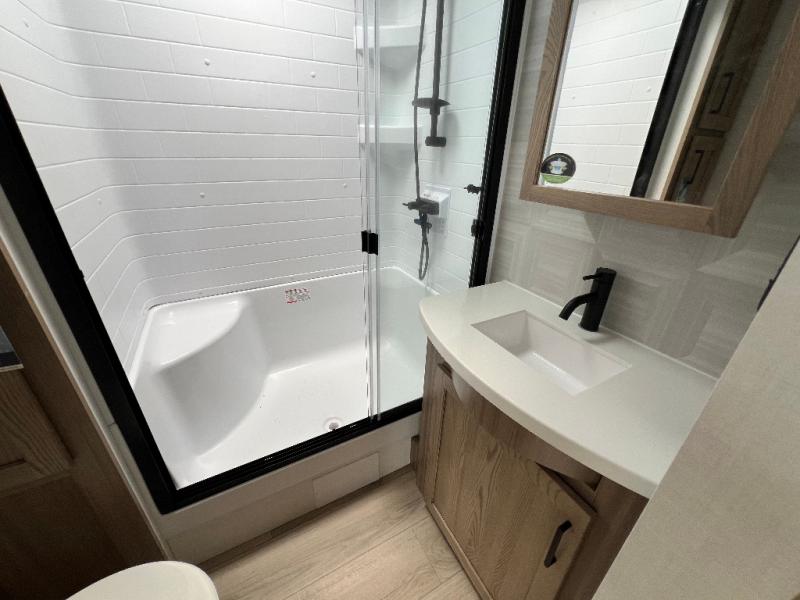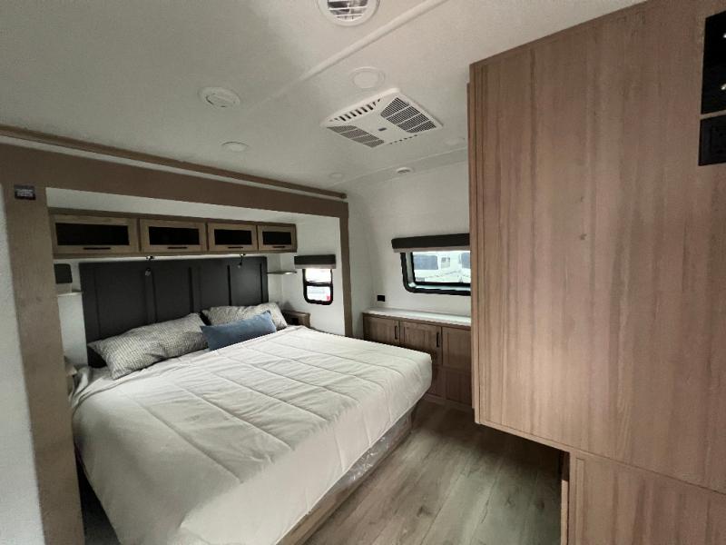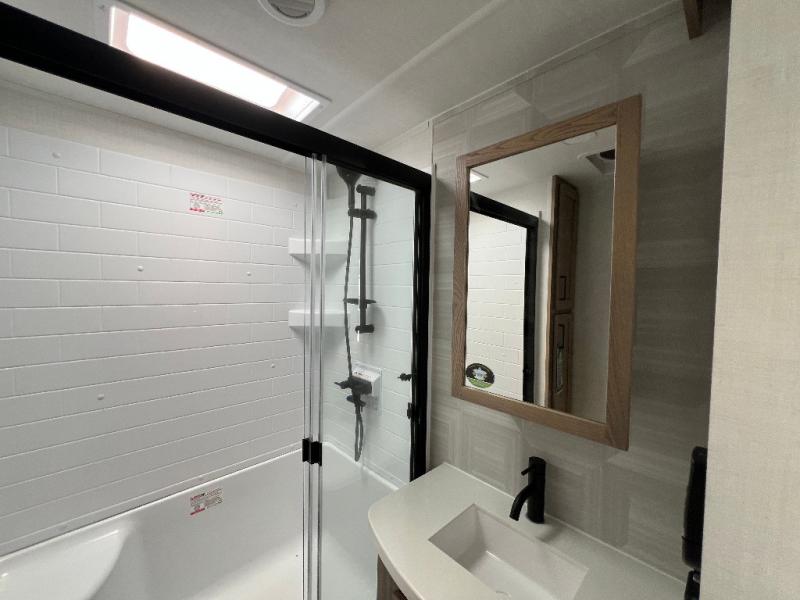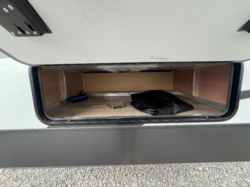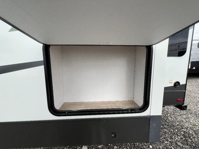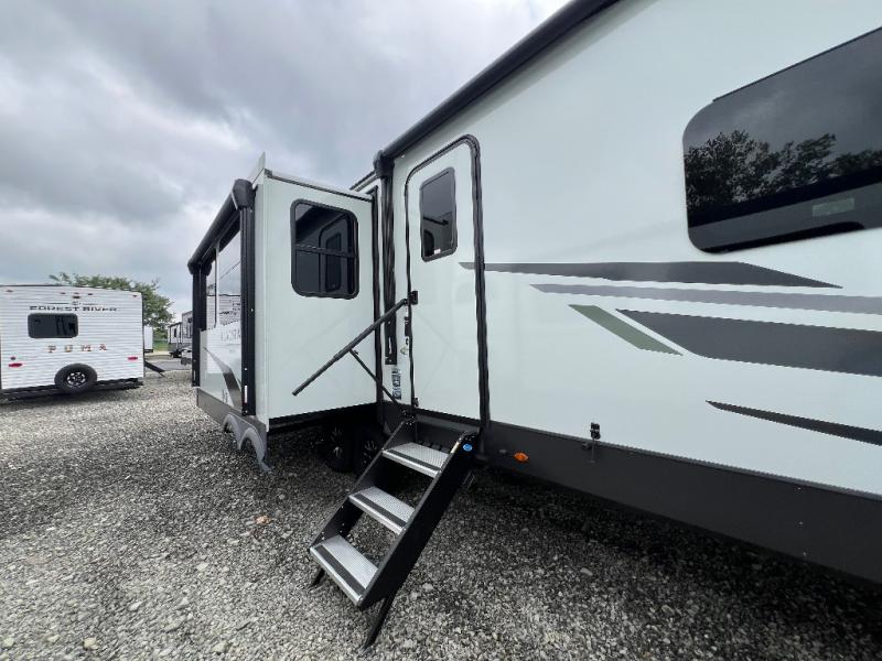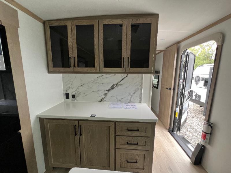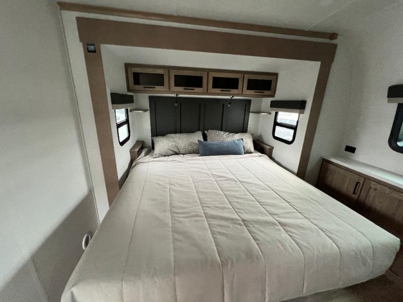 The large windows in the rear and door side slide will bring nature's scenery indoors with this travel trailer! Everyone can relax together in the rear living area featuring a 78" hide-a-bed sofa and 60" theater seating across from the entertainment center with a fireplace. Meal prepping will be even easier with the kitchen island, and the table and chairs with a bench is a comfortable place to enjoy your meals. The full bathroom has a shower with a seat and a linen closet to keep your towels close. You will feel well rested each morning after sleeping on the king bed slide in the front private bedroom which also has a wardrobe with washer and dryer prep and an area to add an optional TV!
