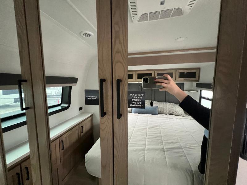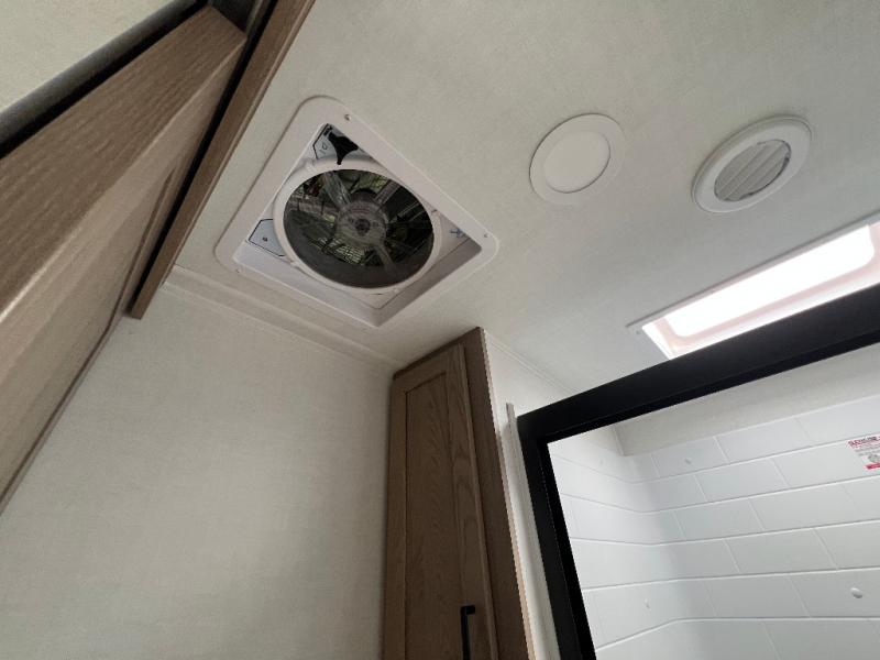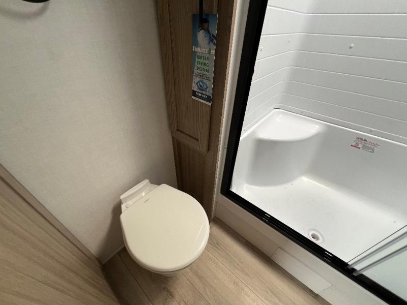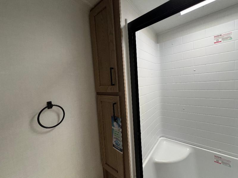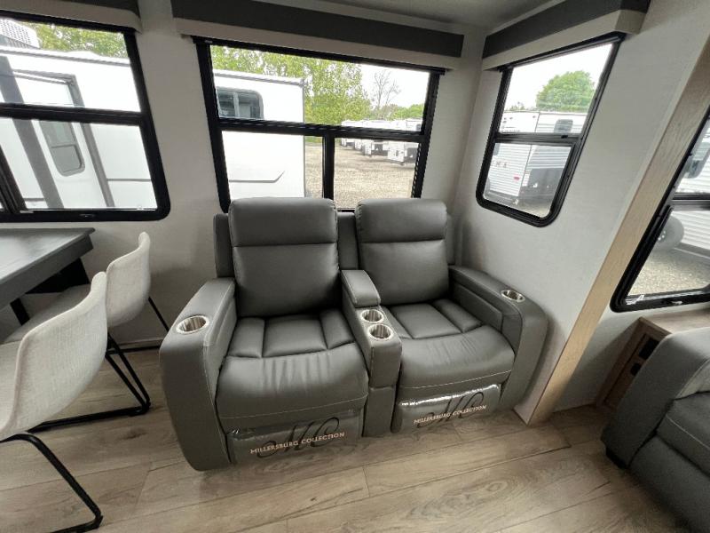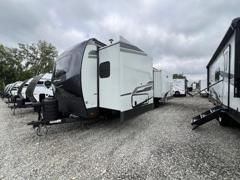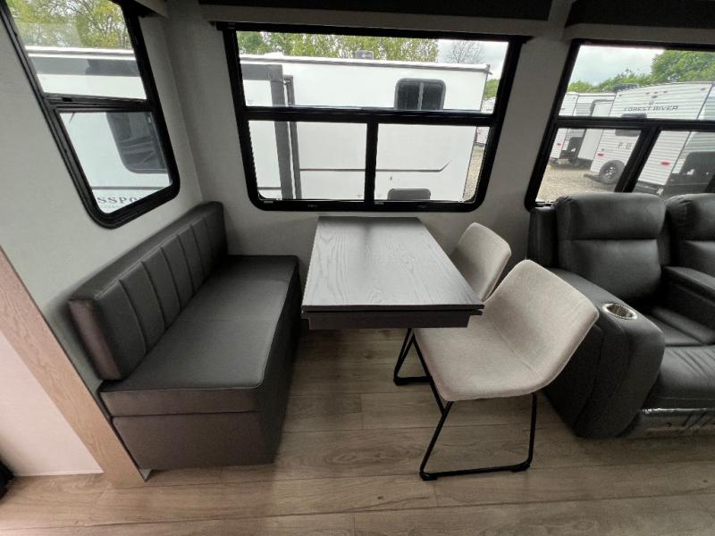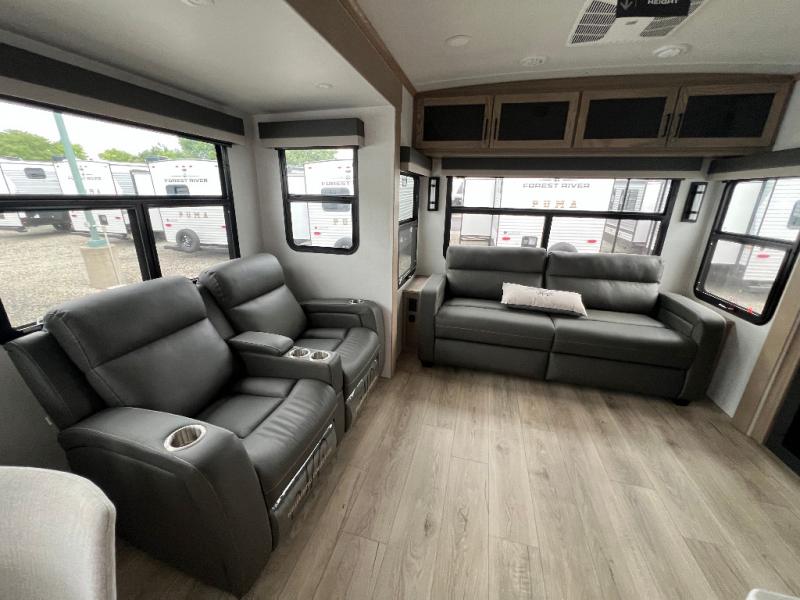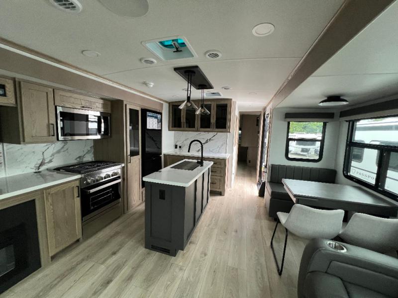 The large windows in the rear and door side slide will bring nature's scenery indoors with this travel trailer! Everyone can relax together in the rear living area featuring a 78" hide-a-bed sofa and 60" theater seating across from the entertainment center with a fireplace. Meal prepping will be even easier with the kitchen island, and the table and chairs with a bench is a comfortable place to enjoy your meals. The full bathroom has a shower with a seat and a linen closet to keep your towels close. You will feel well rested each morning after sleeping on the king bed slide in the front private bedroom which also has a wardrobe with washer and dryer prep and an area to add an optional TV!
