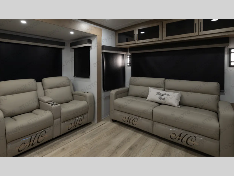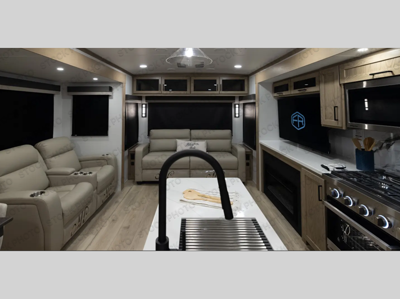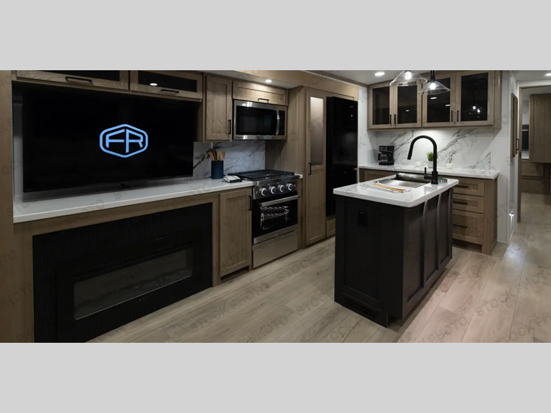 The large windows in the rear and door side slide will bring nature's scenery indoors with this travel trailer! Everyone can relax together in the rear living area featuring a 78" hide-a-bed sofa and 60" theater seating across from the entertainment center with a fireplace. Meal prepping will be even easier with the kitchen island, and the table and chairs with a bench is a comfortable place to enjoy your meals. The full bathroom has a shower with a seat and a linen closet to keep your towels close. You will feel well rested each morning after sleeping on the king bed slide in the front private bedroom which also has a wardrobe with washer and dryer prep and an area to add an optional TV!