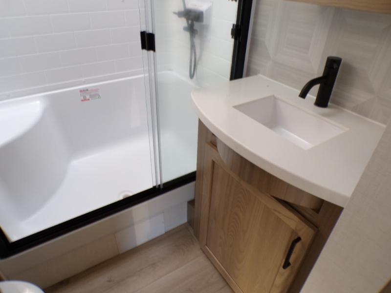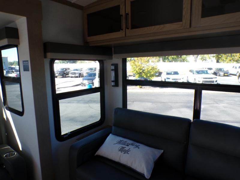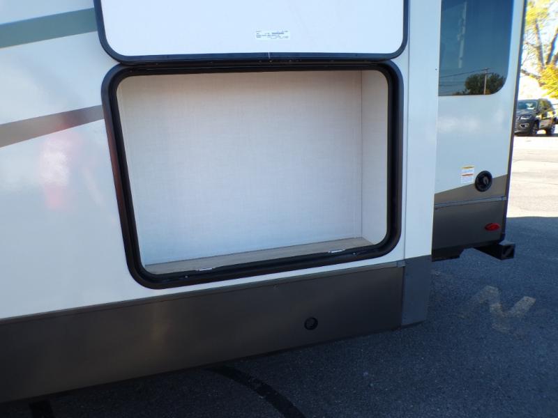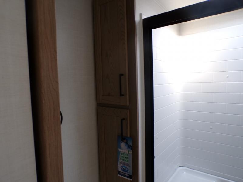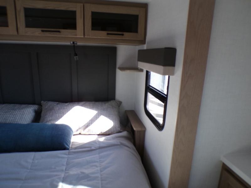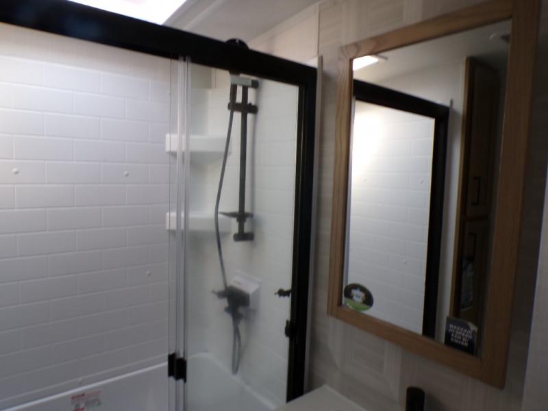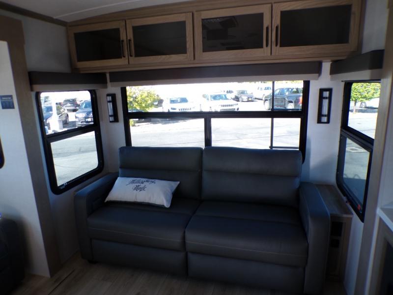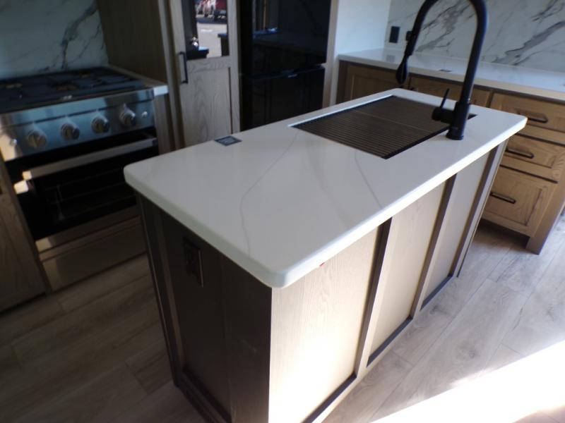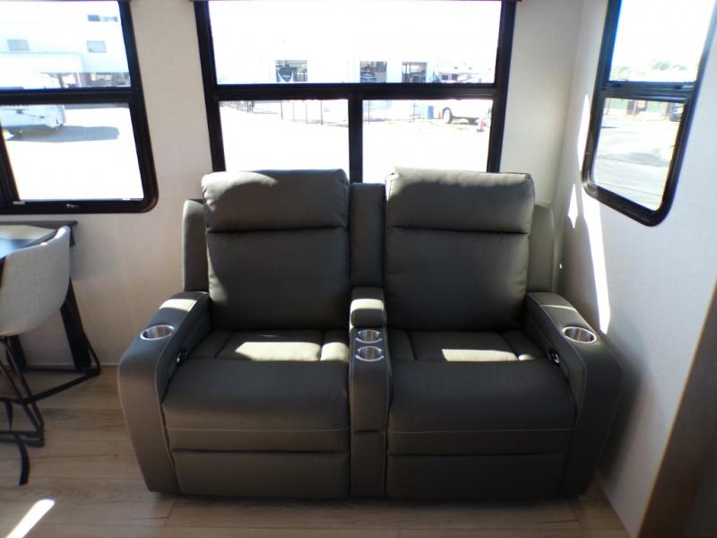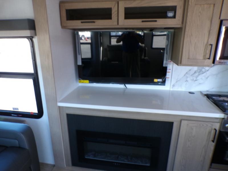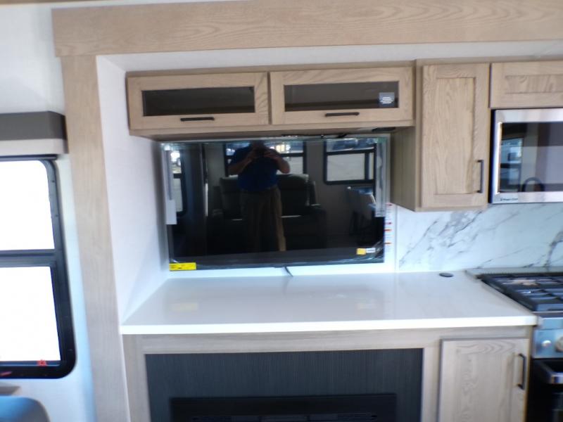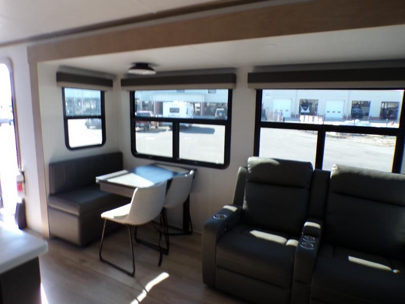 The large windows in the rear and door side slide will bring nature's scenery indoors with this travel trailer! Everyone can relax together in the rear living area featuring a 78" hide-a-bed sofa and 60" theater seating across from the entertainment center with a fireplace. Meal prepping will be even easier with the kitchen island, and the table and chairs with a bench is a comfortable place to enjoy your meals. The full bathroom has a shower with a seat and a linen closet to keep your towels close. You will feel well rested each morning after sleeping on the king bed slide in the front private bedroom which also has a wardrobe with washer and dryer prep and an area to add an optional TV!
