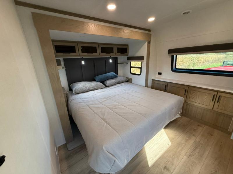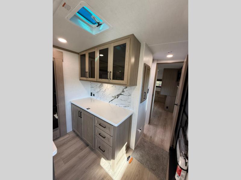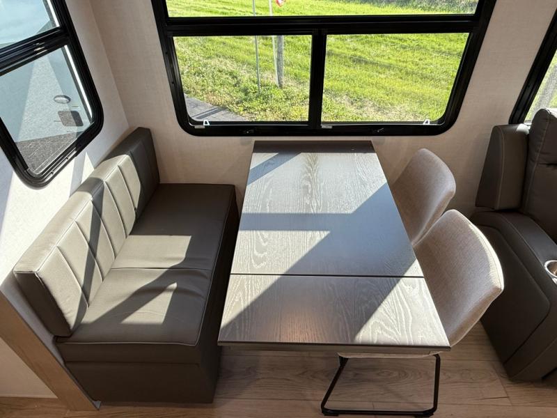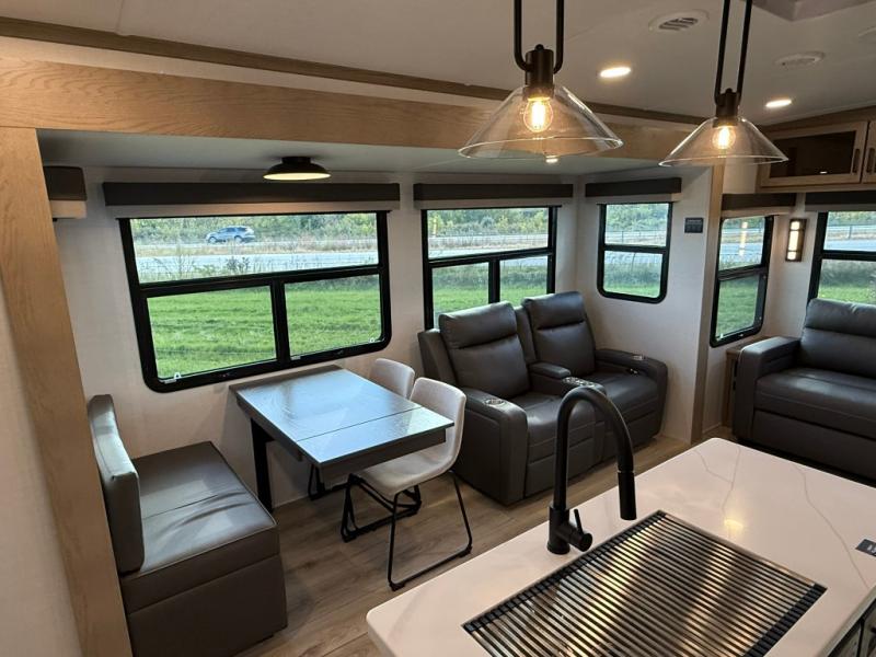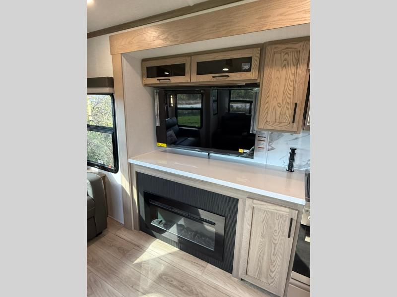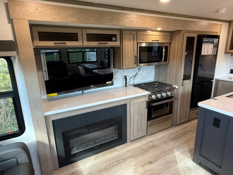 The large windows in the rear and door side slide will bring nature's scenery indoors with this travel trailer! Everyone can relax together in the rear living area featuring a 78" hide-a-bed sofa and 60" theater seating across from the entertainment center with a fireplace. Meal prepping will be even easier with the kitchen island, and the table and chairs with a bench is a comfortable place to enjoy your meals. The full bathroom has a shower with a seat and a linen closet to keep your towels close. You will feel well rested each morning after sleeping on the king bed slide in the front private bedroom which also has a wardrobe with washer and dryer prep and an area to add an optional TV!