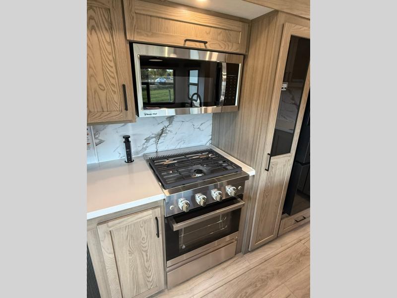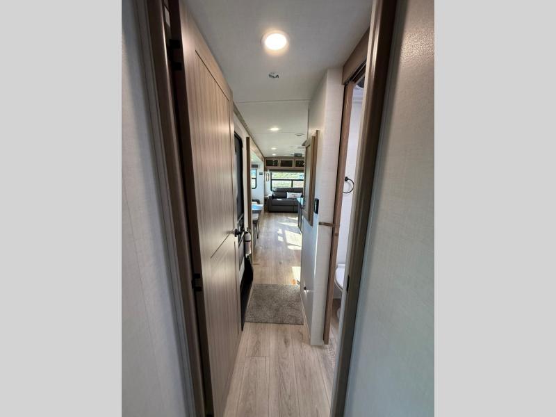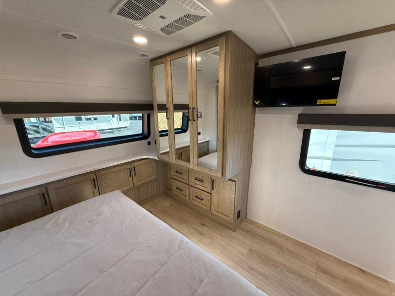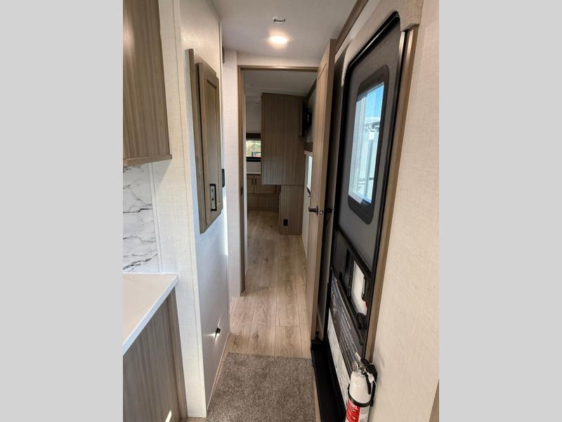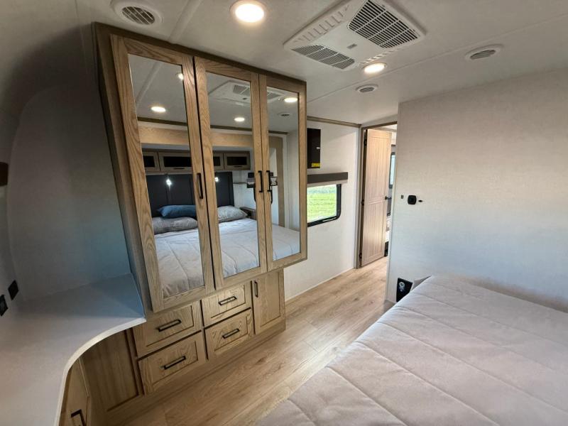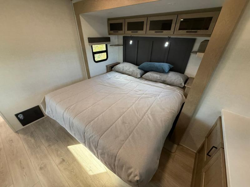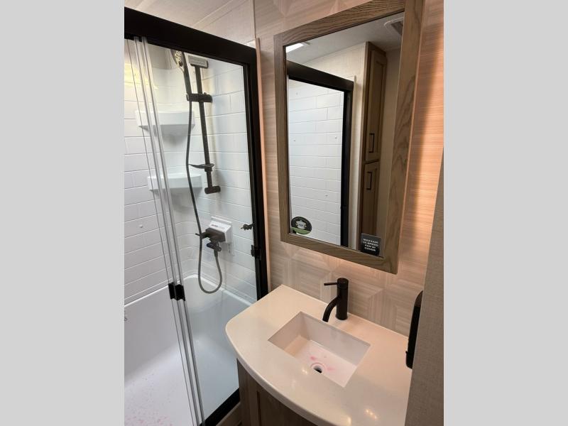 The large windows in the rear and door side slide will bring nature's scenery indoors with this travel trailer! Everyone can relax together in the rear living area featuring a 78" hide-a-bed sofa and 60" theater seating across from the entertainment center with a fireplace. Meal prepping will be even easier with the kitchen island, and the table and chairs with a bench is a comfortable place to enjoy your meals. The full bathroom has a shower with a seat and a linen closet to keep your towels close. You will feel well rested each morning after sleeping on the king bed slide in the front private bedroom which also has a wardrobe with washer and dryer prep and an area to add an optional TV!