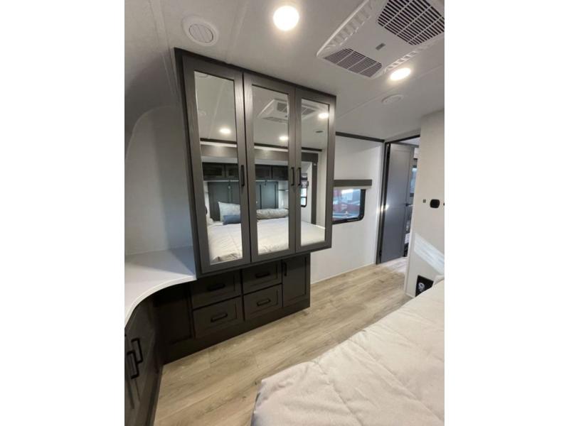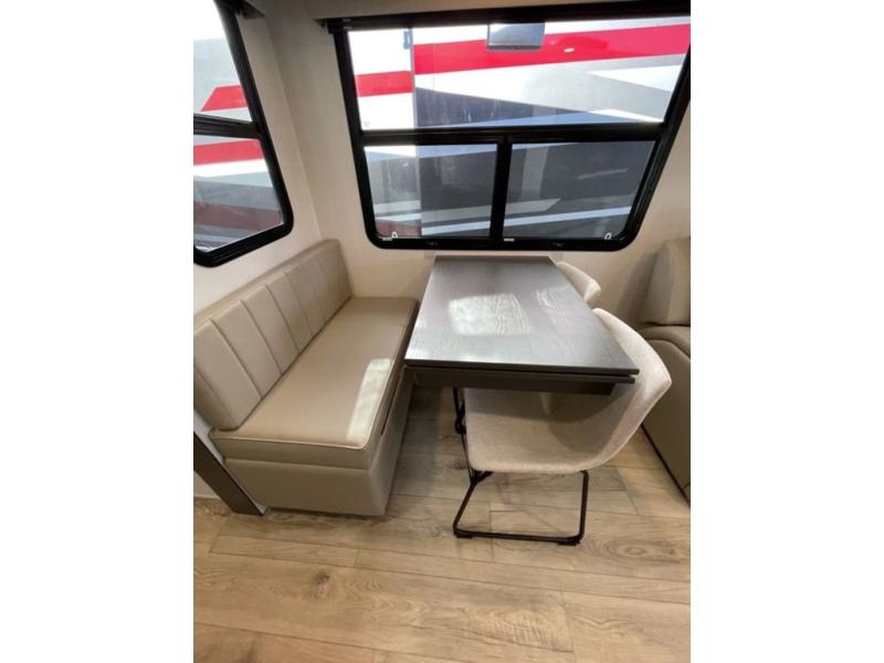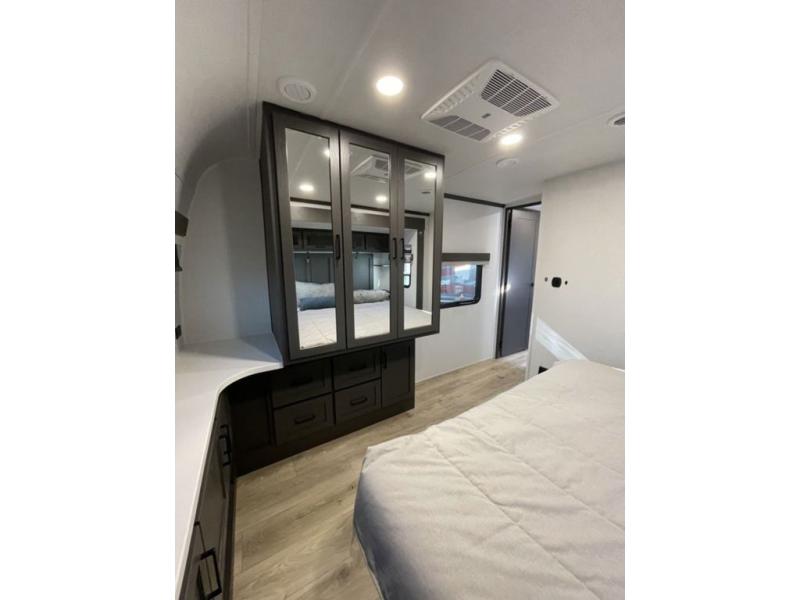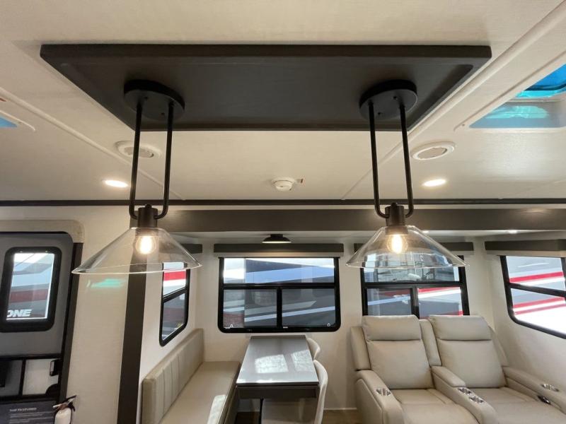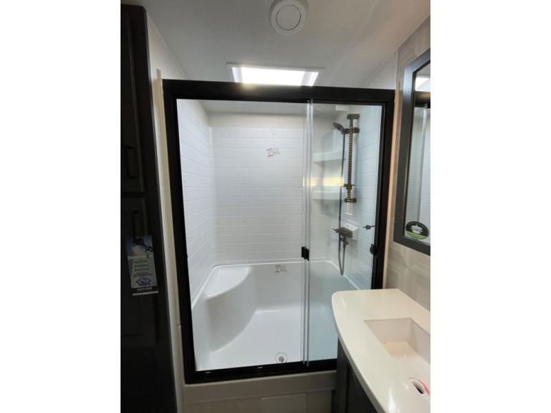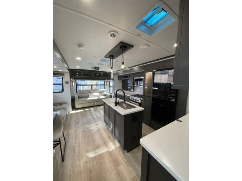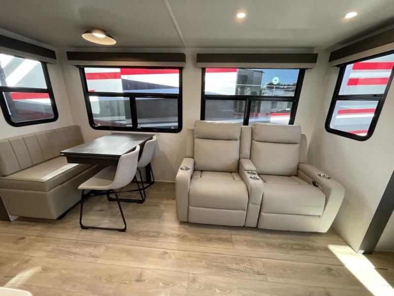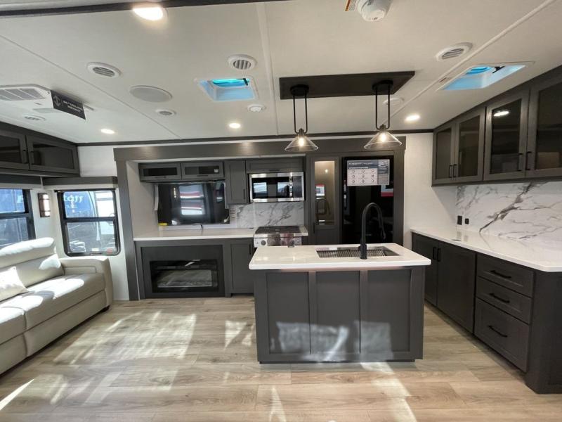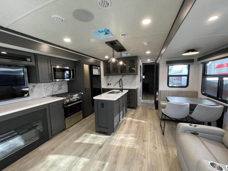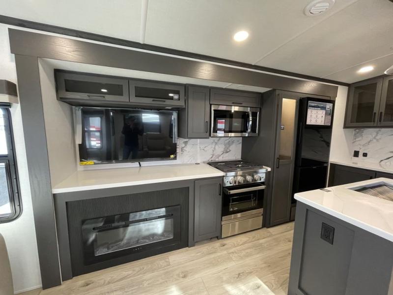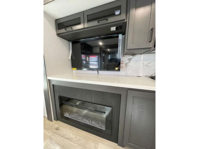The large windows in the rear and door side slide will bring nature's scenery indoors with this travel trailer! Everyone can relax together in the rear living area featuring a 78" hide-a-bed sofa and 60" theater seating across from the entertainment center with a fireplace. Meal prepping will be even easier with the kitchen island, and the table and chairs with a bench is a comfortable place to enjoy your meals. The full bathroom has a shower with a seat and a linen closet to keep your towels close. You will feel well rested each morning after sleeping on the king bed slide in the front private bedroom which also has a wardrobe with washer and dryer prep and an area to add an optional TV!