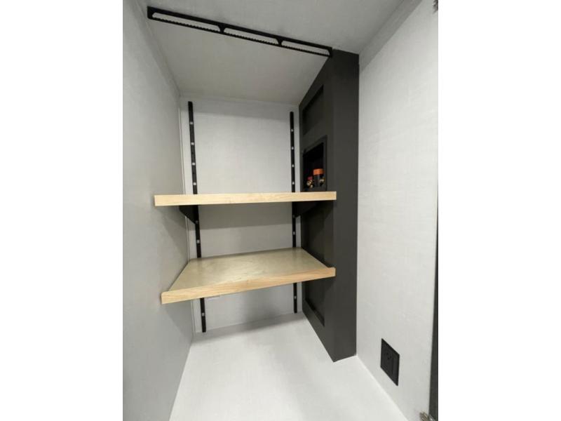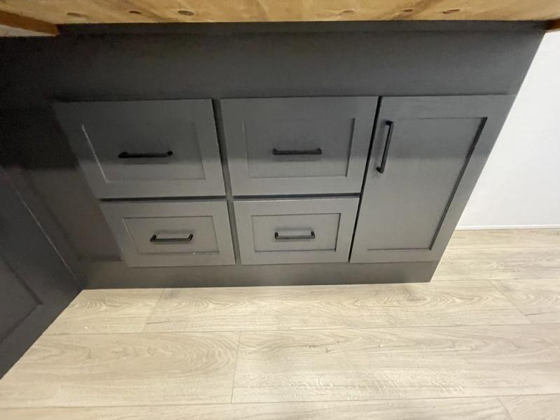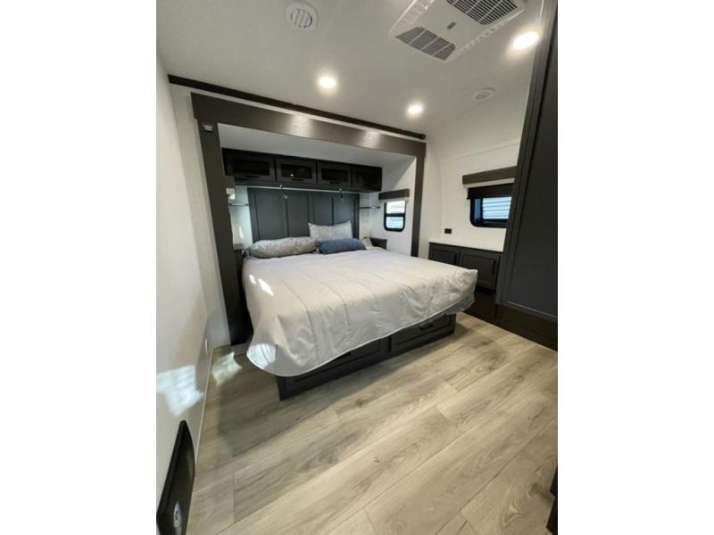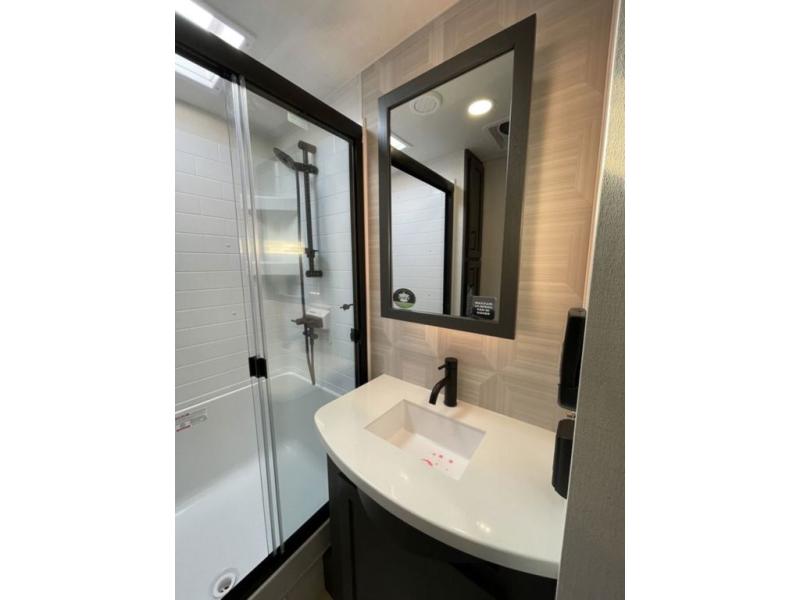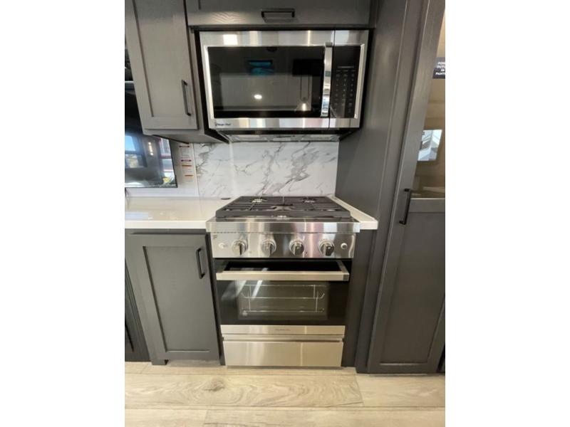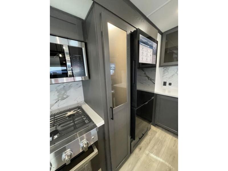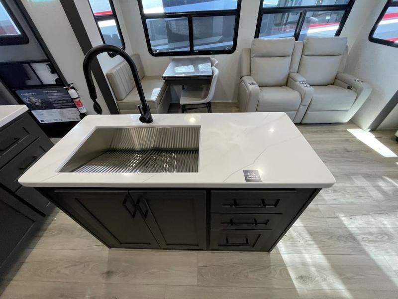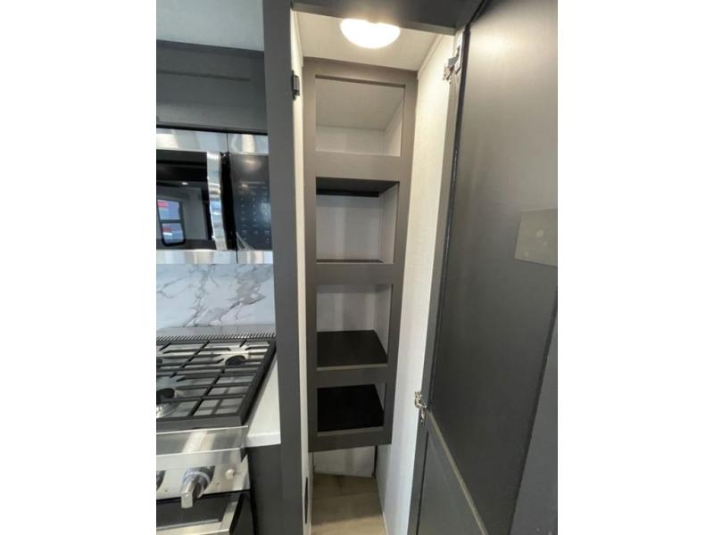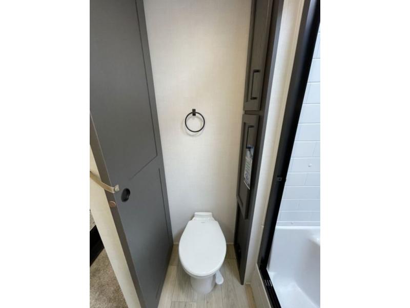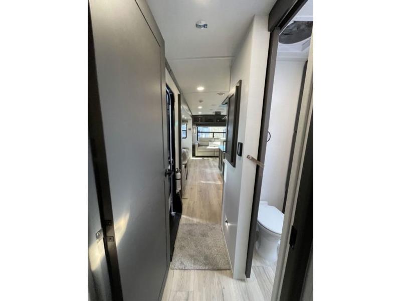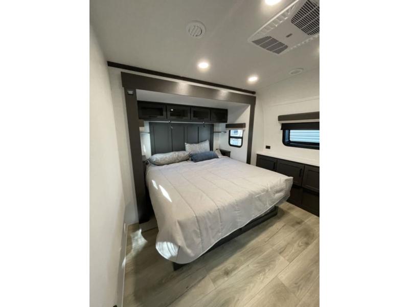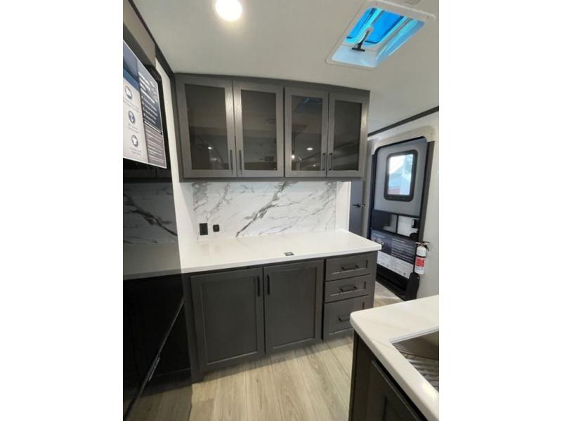 The large windows in the rear and door side slide will bring nature's scenery indoors with this travel trailer! Everyone can relax together in the rear living area featuring a 78" hide-a-bed sofa and 60" theater seating across from the entertainment center with a fireplace. Meal prepping will be even easier with the kitchen island, and the table and chairs with a bench is a comfortable place to enjoy your meals. The full bathroom has a shower with a seat and a linen closet to keep your towels close. You will feel well rested each morning after sleeping on the king bed slide in the front private bedroom which also has a wardrobe with washer and dryer prep and an area to add an optional TV!
