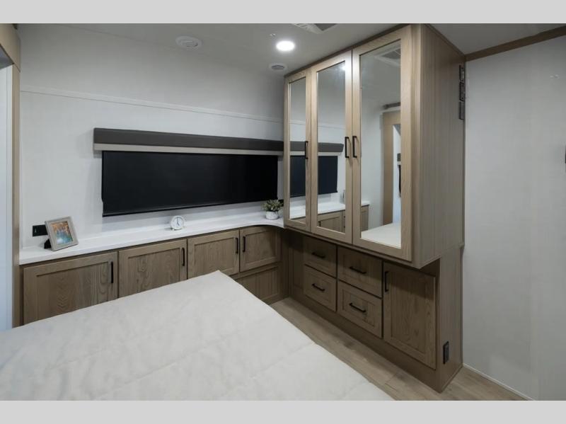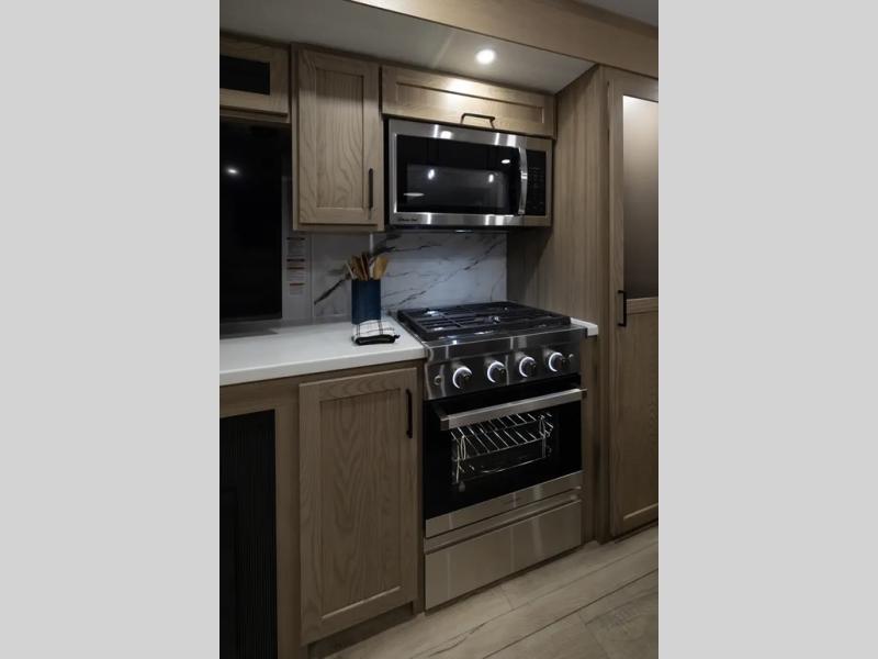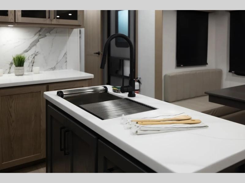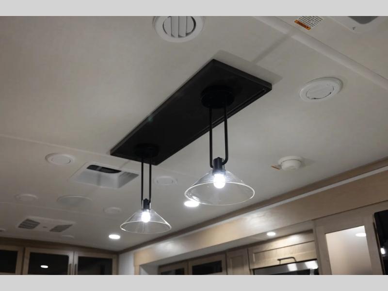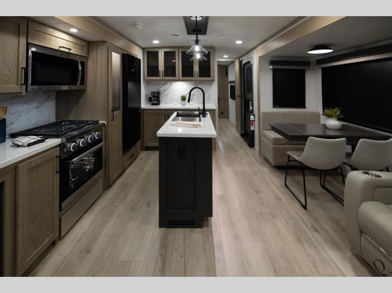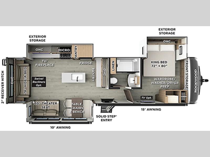 The large windows in the rear and door side slide will bring nature's scenery indoors with this travel trailer! Everyone can relax together in the rear living area featuring a 78" hide-a-bed sofa and 60" theater seating across from the entertainment center with a fireplace. Meal prepping will be even easier with the kitchen island, and the table and chairs with a bench is a comfortable place to enjoy your meals. The full bathroom has a shower with a seat and a linen closet to keep your towels close. You will feel well rested each morning after sleeping on the king bed slide in the front private bedroom which also has a wardrobe with washer and dryer prep and an area to add an optional TV!