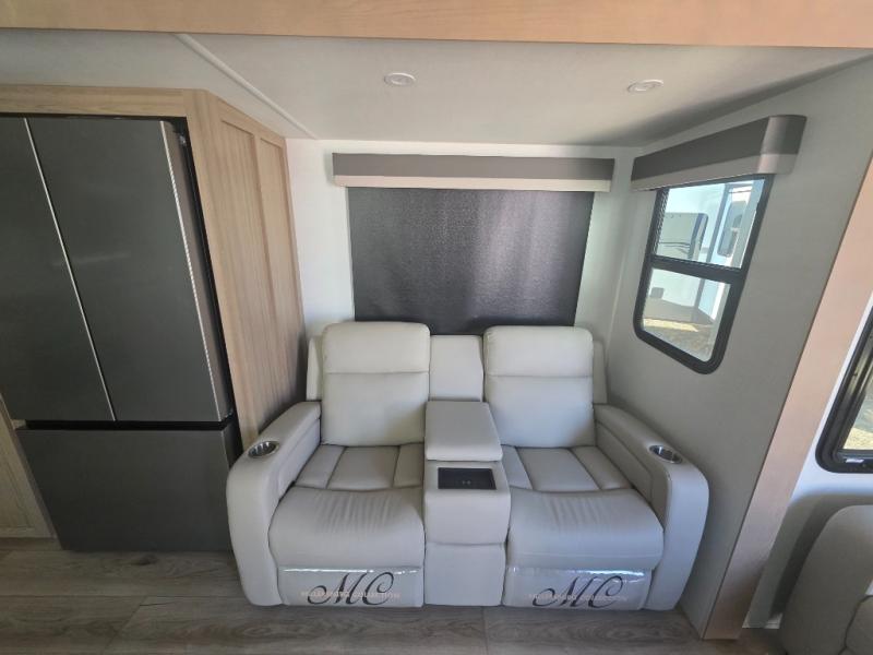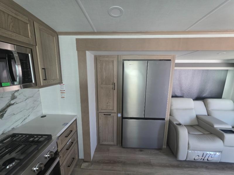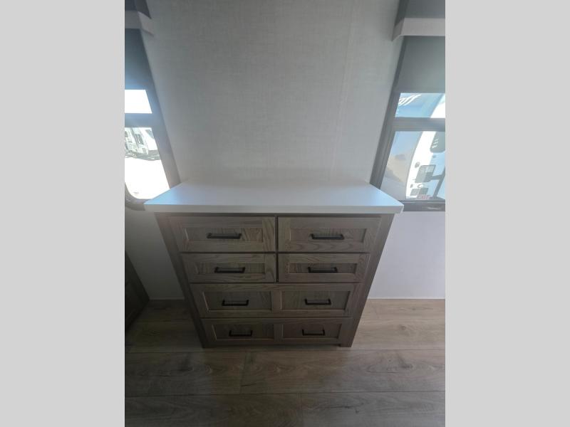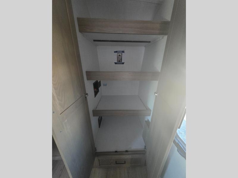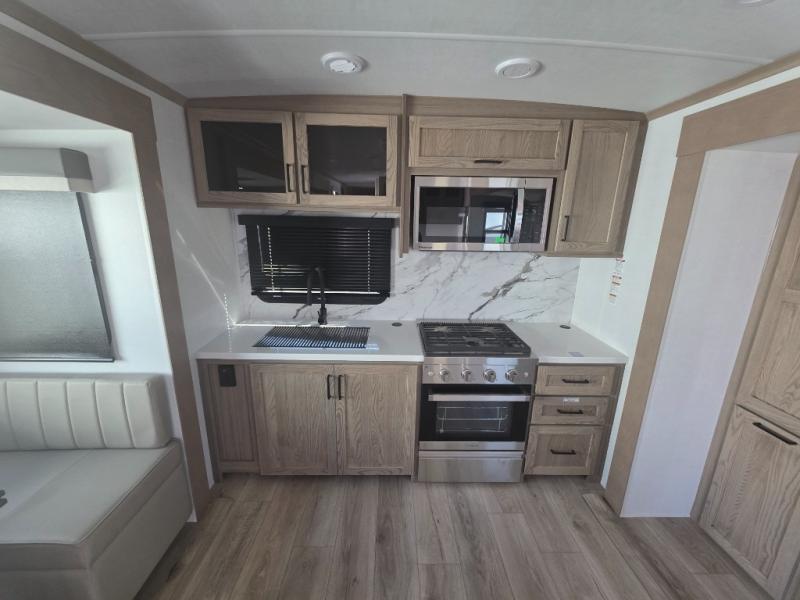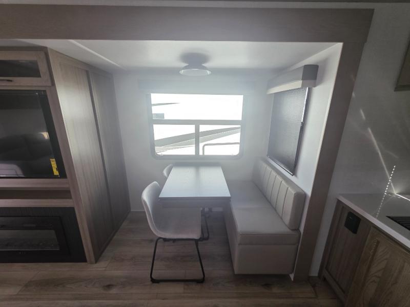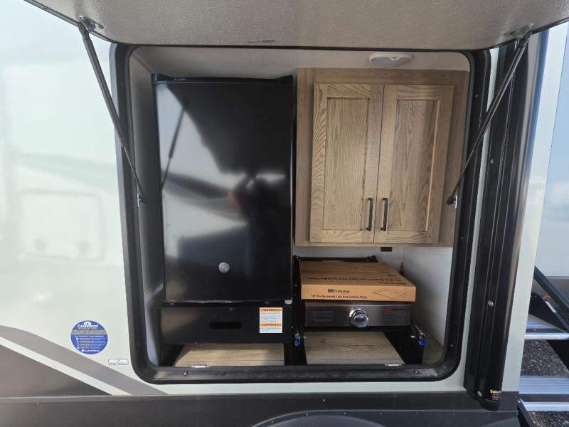 Three slides in this travel trailer provide more interior space! The rear kitchen has everything the chef will need to prepare home-cooked meals and a large pantry to store everyone's favorite snacks, or they can head to the outside kitchen and breathe in some fresh air while they cook. The table and chairs with a bench is not only great for enjoying meals and playing card games, but it is also great for transforming into an extra sleeping space. You can even transform the 60" hide-a-bed sofa into a sleeping space too. In the bedroom is a queen bed slide to lay your head at night, a dresser with an area prepped for an optional TV, and a front wardrobe with washer and dryer prep.