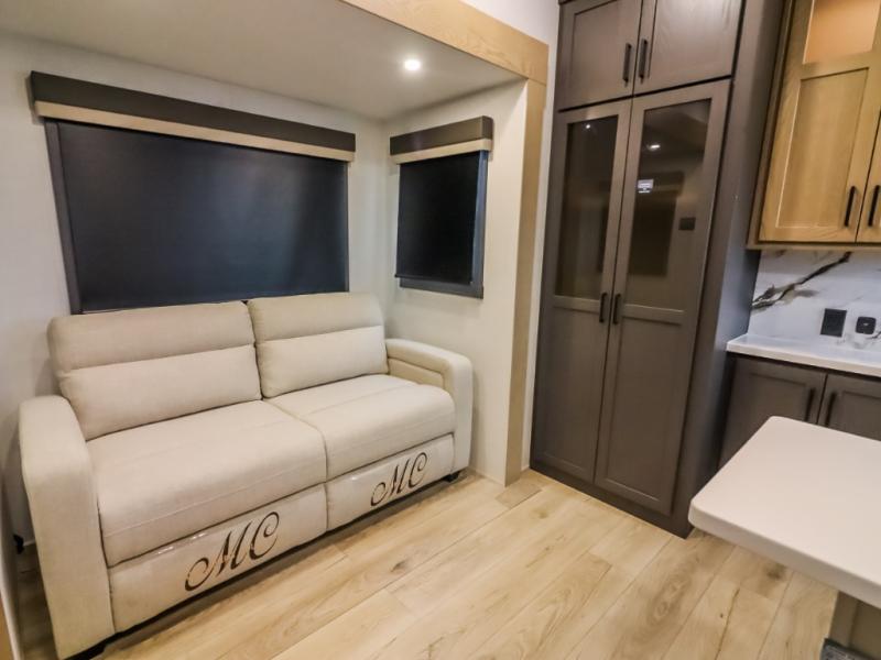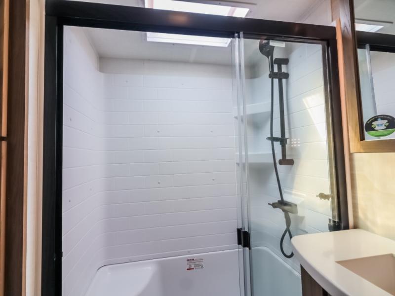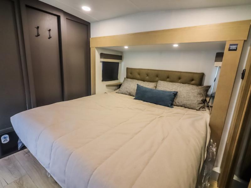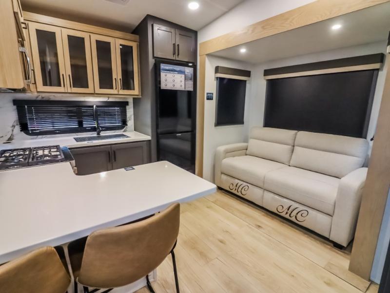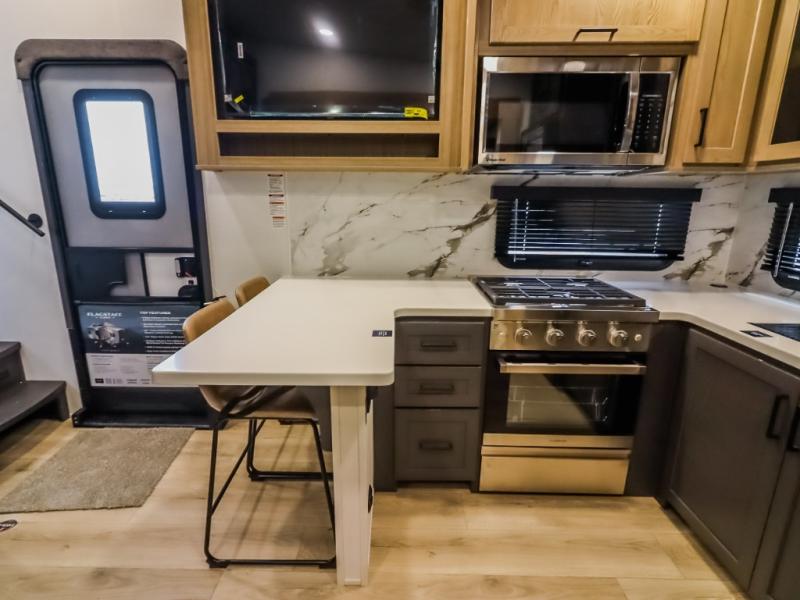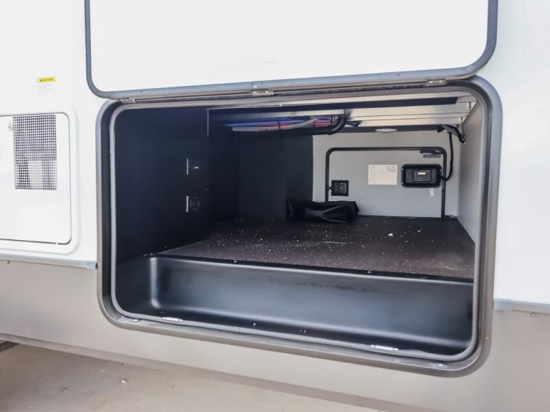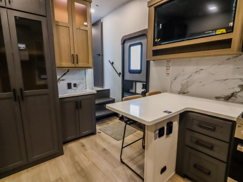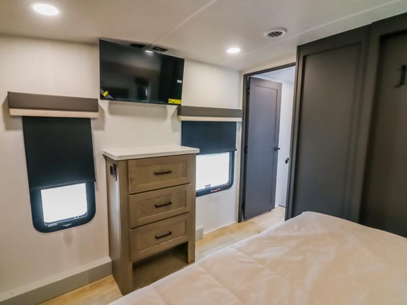 Camp in comfort with your favorite person or your friends in this spacious bedroom and bathroom fifth wheel! From the shower with a seat and linen storage to the slide out queen bed, you will feel right at home. There is also a king bed option if you want more space to stretch out at night. The bedroom also offers a dresser, a front wardrobe with shelves, and an optional TV. The main living area provides a hide-a-bed sofa that sleeps two, a rear kitchen with a 12V refrigerator to store lots of food, and a bar top with seating to dine at. You can watch the Smart TV before going to bed or each morning, and the 20' awning gives you even more living space outdoors protected from the outside elements.