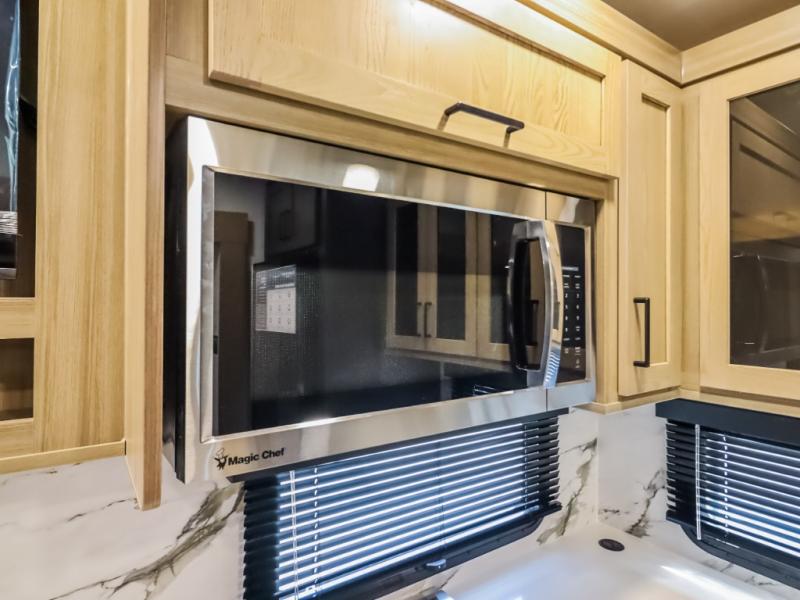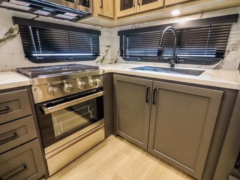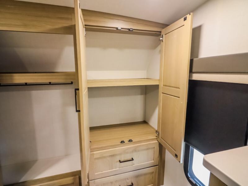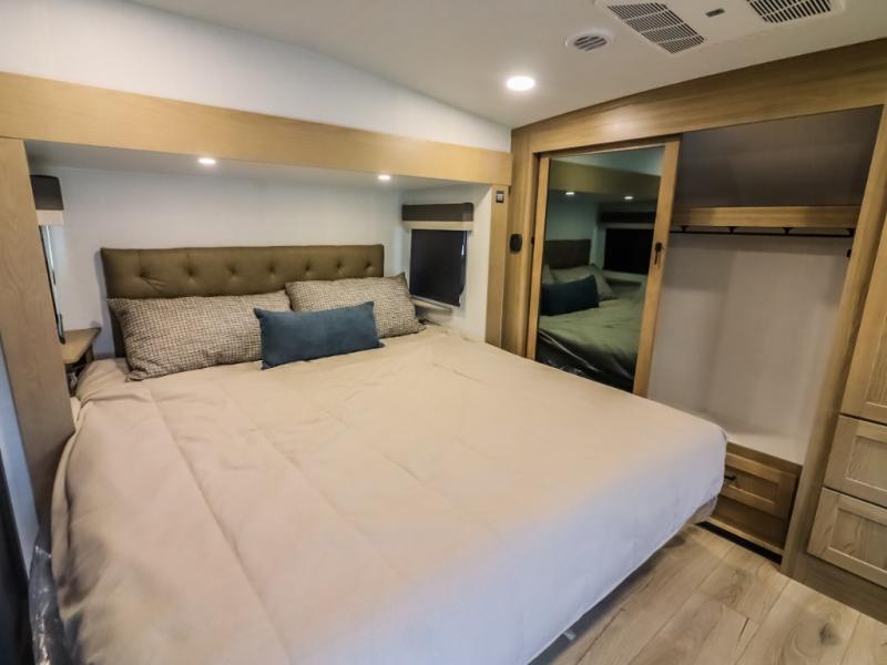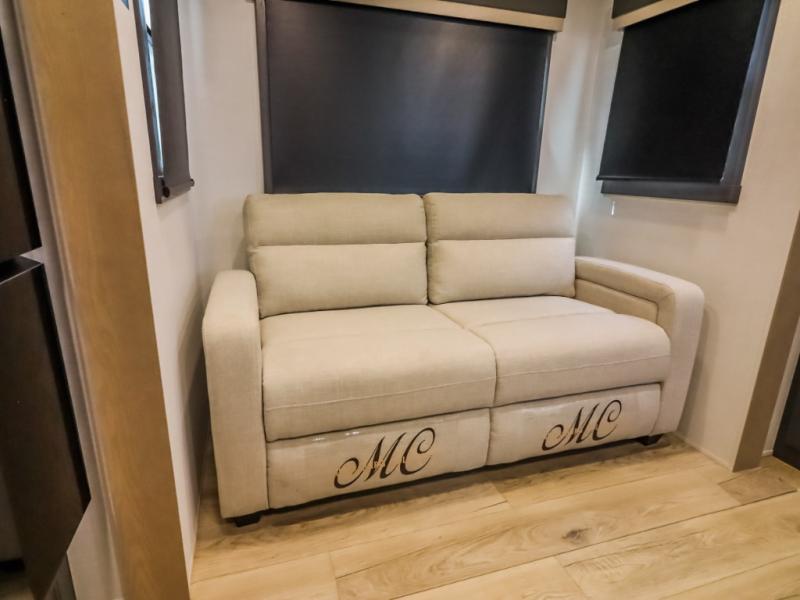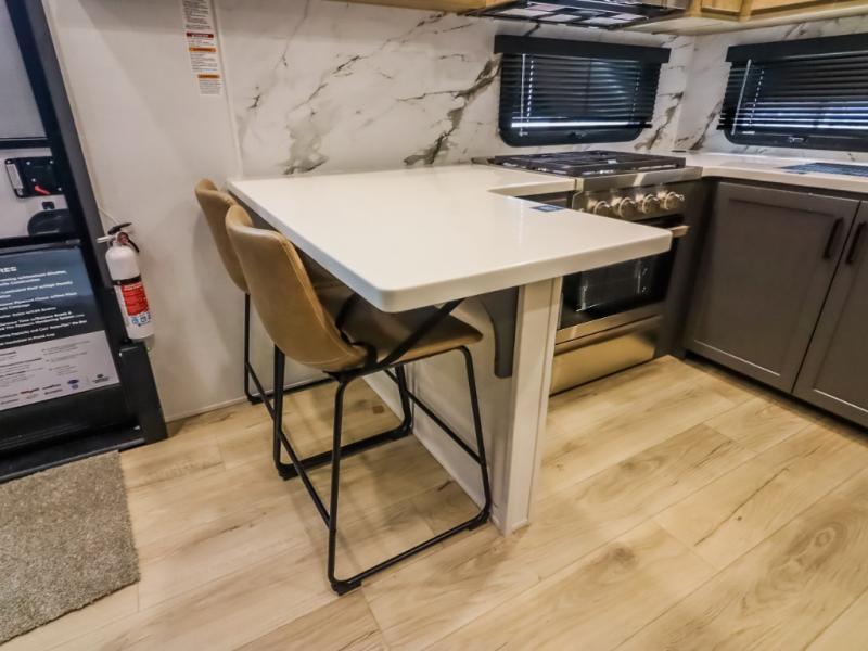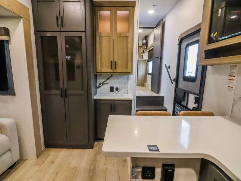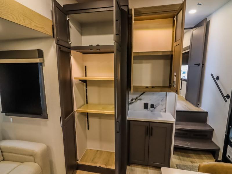 Camp in comfort with your favorite person or your friends in this spacious bedroom and bathroom fifth wheel! From the shower with a seat and linen storage to the slide out queen bed, you will feel right at home. There is also a king bed option if you want more space to stretch out at night. The bedroom also offers a dresser, a front wardrobe with shelves, and an optional TV. The main living area provides a hide-a-bed sofa that sleeps two, a rear kitchen with a 12V refrigerator to store lots of food, and a bar top with seating to dine at. You can watch the Smart TV before going to bed or each morning, and the 20' awning gives you even more living space outdoors protected from the outside elements.
