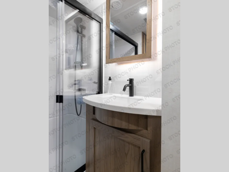Camp in comfort with your favorite person or your friends in this spacious bedroom and bathroom fifth wheel! From the shower with a seat and linen storage to the slide out queen bed, you will feel right at home. There is also a king bed option if you want more space to stretch out at night. The bedroom also offers a dresser, a front wardrobe with shelves, and an optional TV. The main living area provides a hide-a-bed sofa that sleeps two, a rear kitchen with a 12V refrigerator to store lots of food, and a bar top with seating to dine at. You can watch the Smart TV before going to bed or each morning, and the 20' awning gives you even more living space outdoors protected from the outside elements.