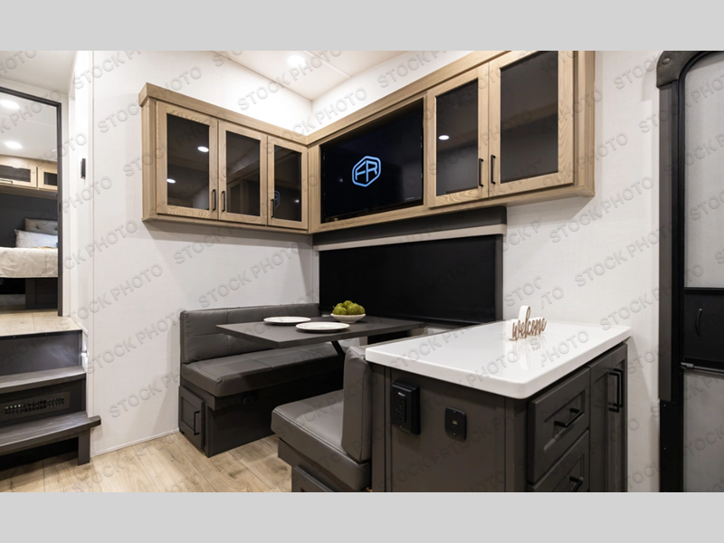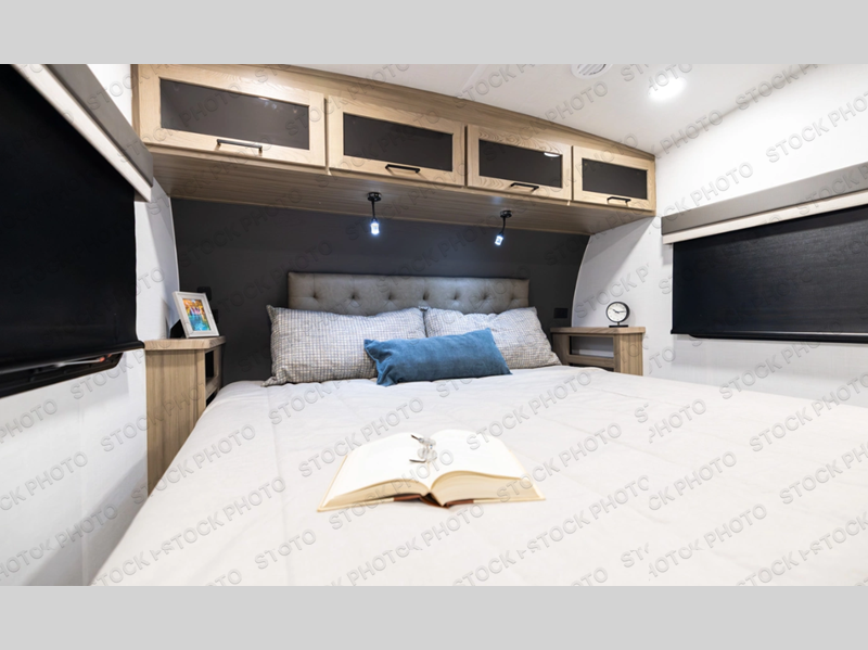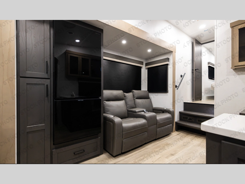 This rear kitchen fifth wheel is the perfect couple's trailer with space for an overnight guest on the booth dinette. There is a front private bedroom with a queen bed where you'll get a great night's rest, and in the morning you can relax on the theater seat with your coffee. The chef of your group will appreciate ample counter space to prep meals, and if the weather is nice, you might want to take your plate outdoors to eat under the 20' power awning.