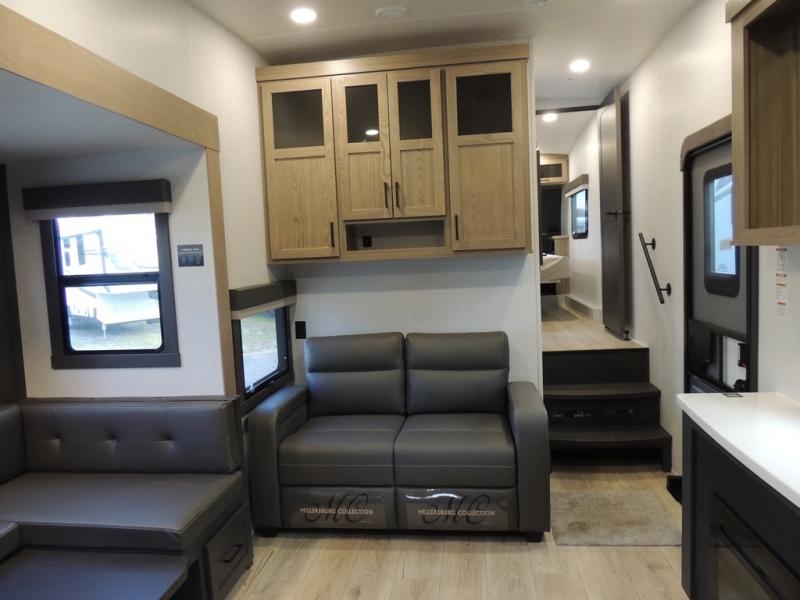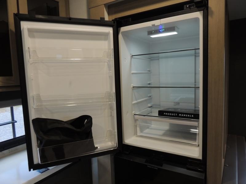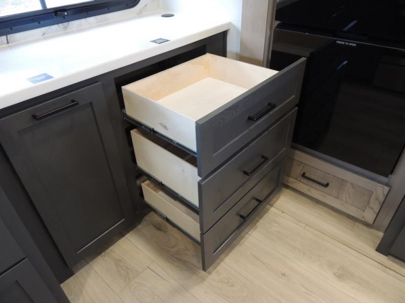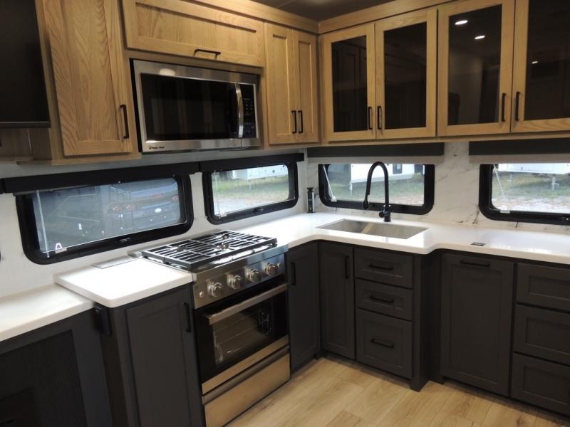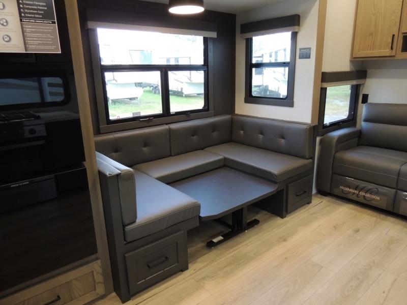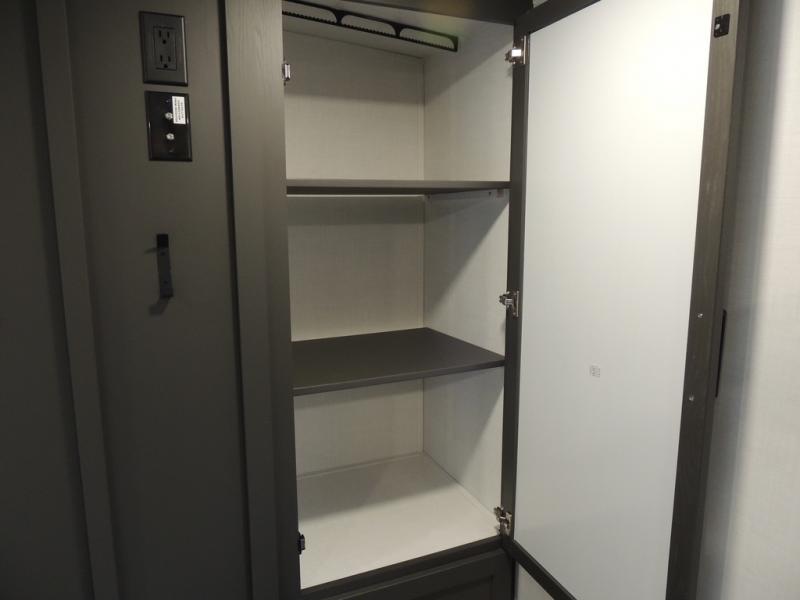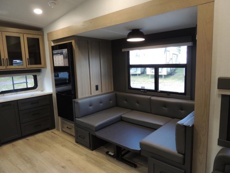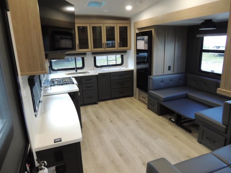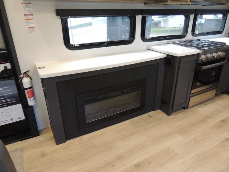 The perfect couple's fifth wheel offers privacy in a front bedroom with a queen bed, a wardrobe for your things and an optional TV if you want to watch movies in bed. And the full bath is close by for easy nighttime use. The cook will love all the counterspace and cabinets provided in the rear kitchen and along the side wall, plus there is a 12V refrigerator to keep your food fresh. If you have guests stay over, they can sleep on the hide-a-bed sofa and king U-dinette, and the TV and fireplace will make this space feel a little more like home!