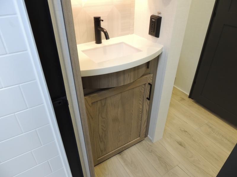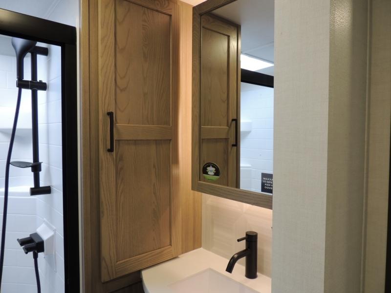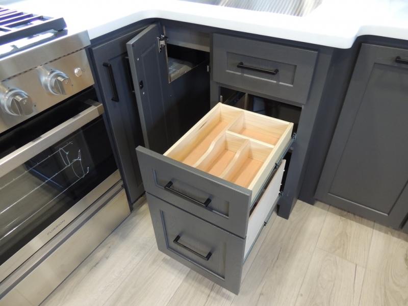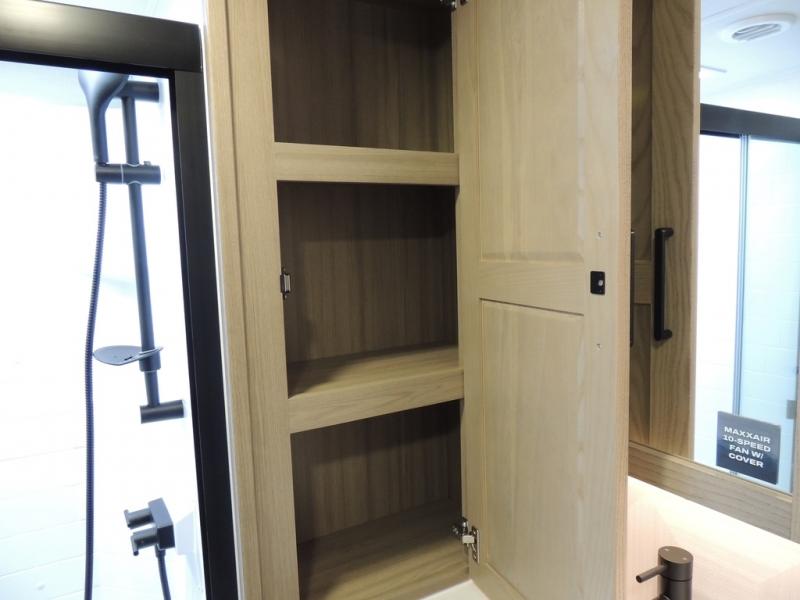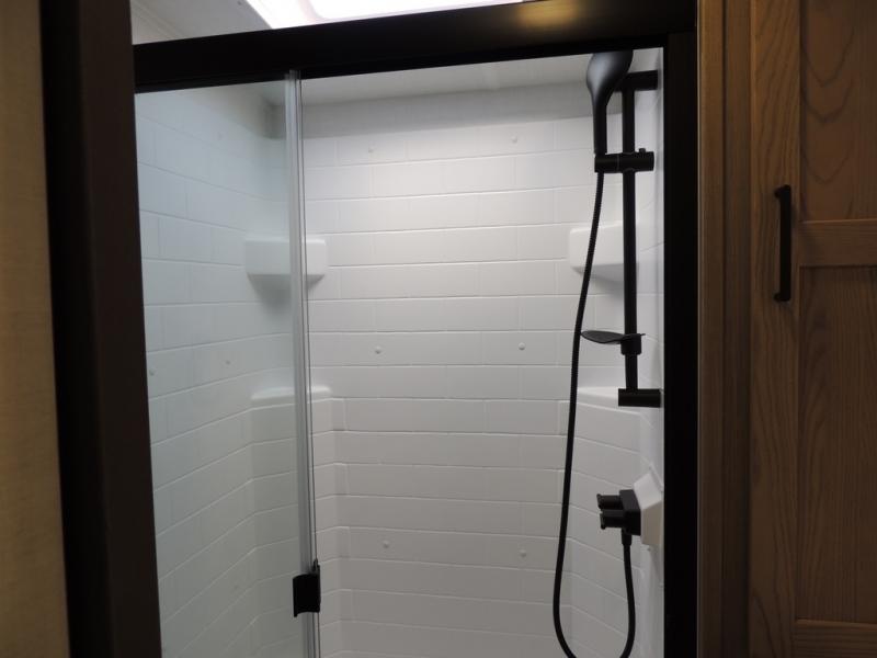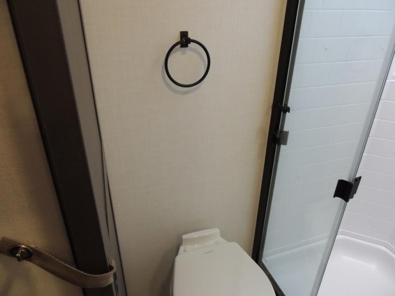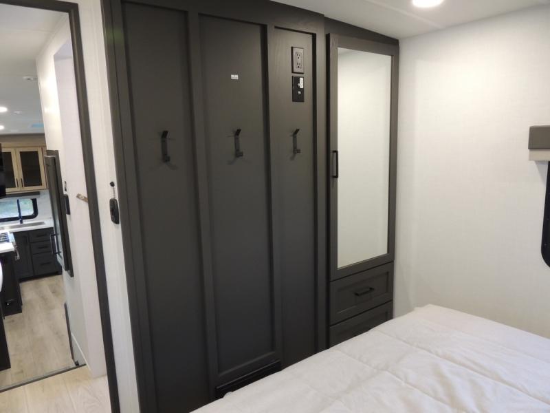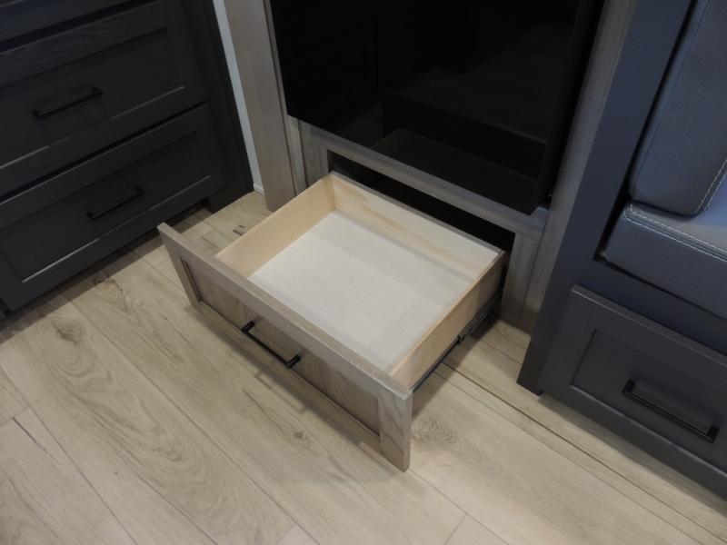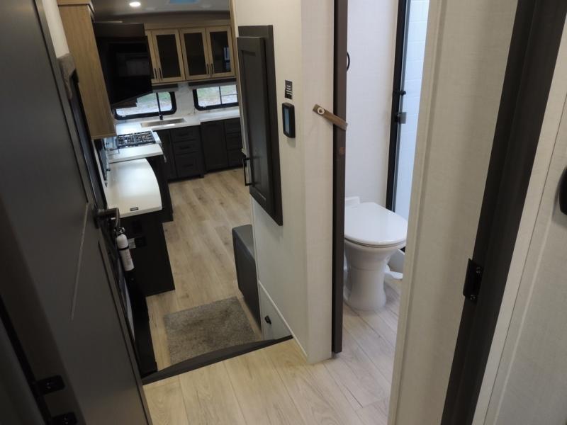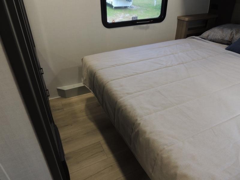 The perfect couple's fifth wheel offers privacy in a front bedroom with a queen bed, a wardrobe for your things and an optional TV if you want to watch movies in bed. And the full bath is close by for easy nighttime use. The cook will love all the counterspace and cabinets provided in the rear kitchen and along the side wall, plus there is a 12V refrigerator to keep your food fresh. If you have guests stay over, they can sleep on the hide-a-bed sofa and king U-dinette, and the TV and fireplace will make this space feel a little more like home!