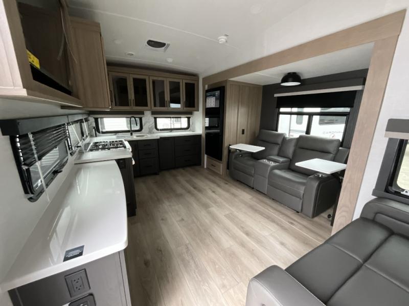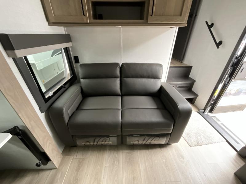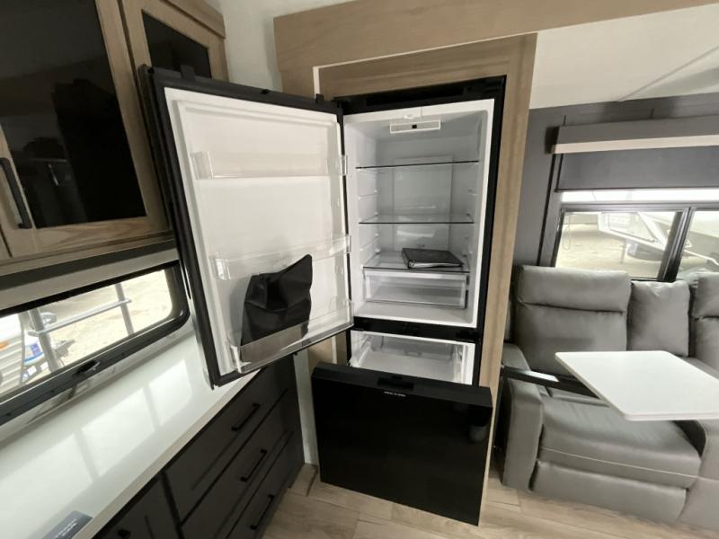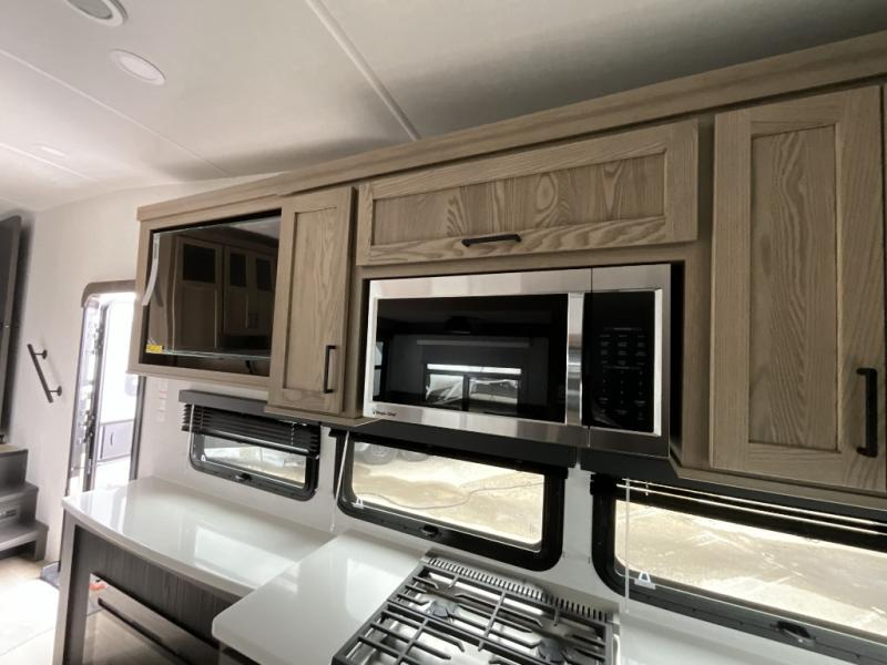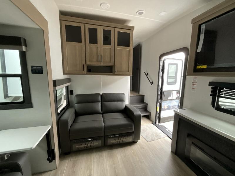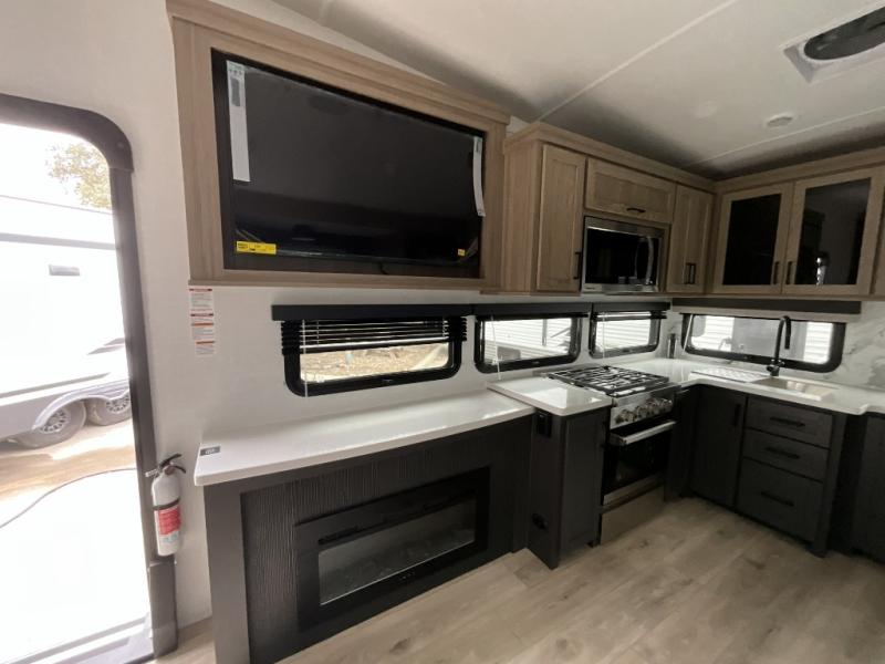 The perfect couple's fifth wheel offers privacy in a front bedroom with a queen bed, a wardrobe for your things and an optional TV if you want to watch movies in bed. And the full bath is close by for easy nighttime use. The cook will love all the counterspace and cabinets provided in the rear kitchen and along the side wall, plus there is a 12V refrigerator to keep your food fresh. If you have guests stay over, they can sleep on the hide-a-bed sofa and king U-dinette, and the TV and fireplace will make this space feel a little more like home!