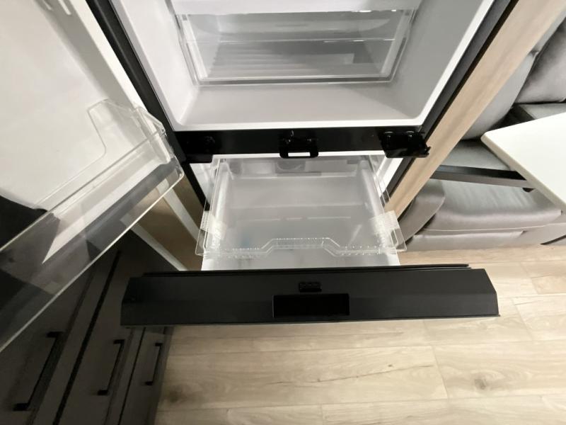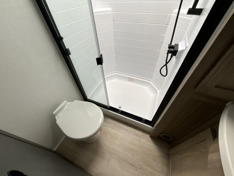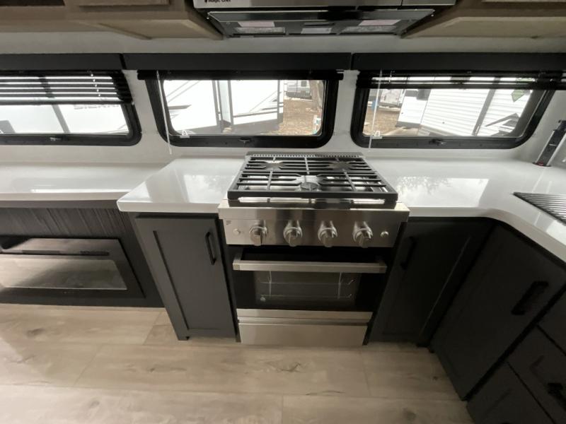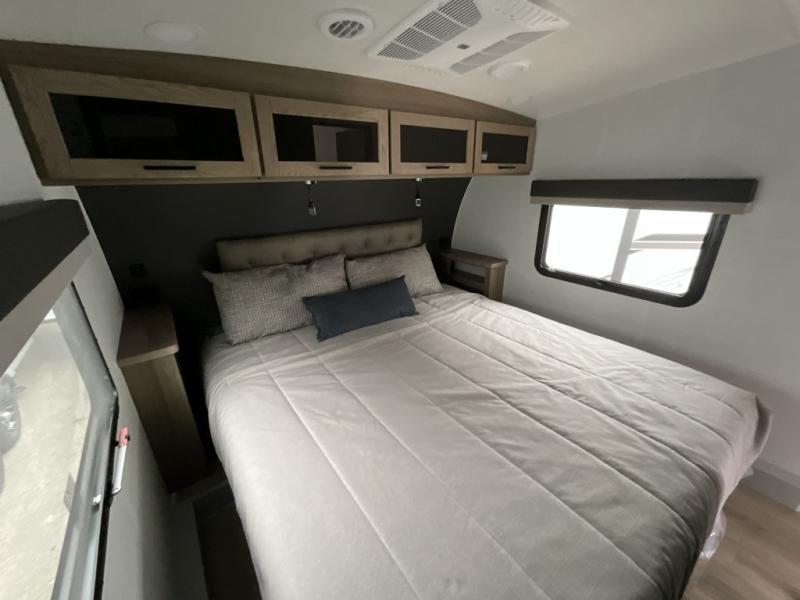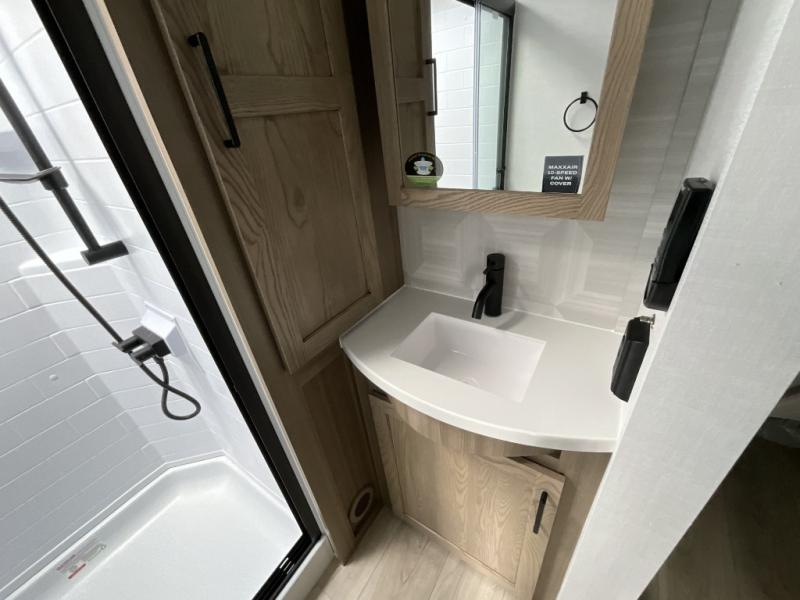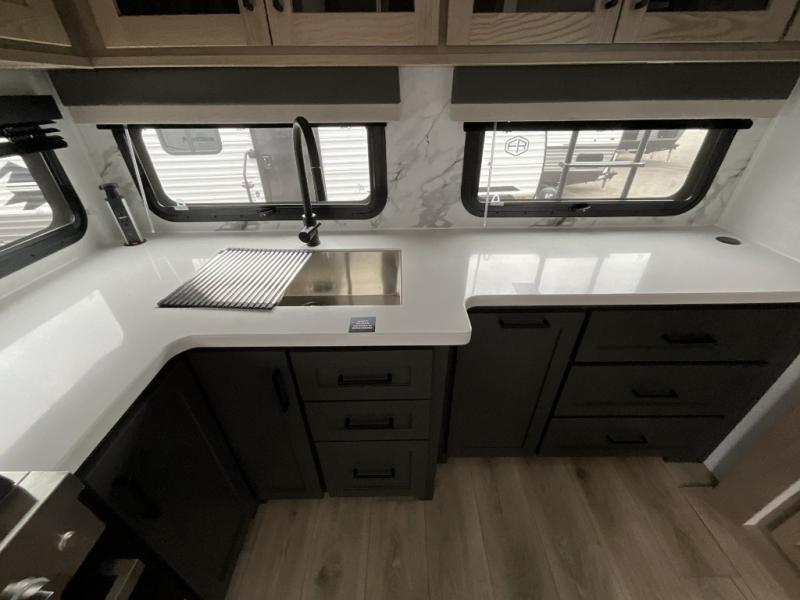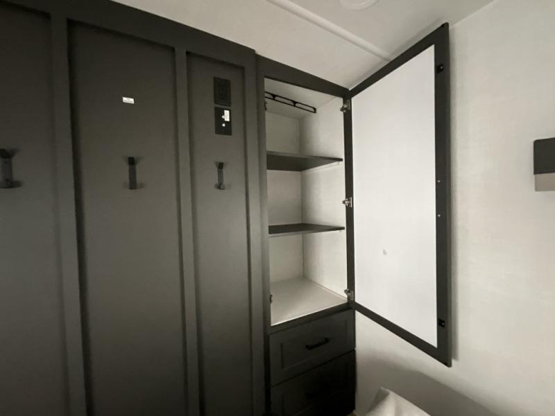 The perfect couple's fifth wheel offers privacy in a front bedroom with a queen bed, a wardrobe for your things and an optional TV if you want to watch movies in bed. And the full bath is close by for easy nighttime use. The cook will love all the counterspace and cabinets provided in the rear kitchen and along the side wall, plus there is a 12V refrigerator to keep your food fresh. If you have guests stay over, they can sleep on the hide-a-bed sofa and king U-dinette, and the TV and fireplace will make this space feel a little more like home!