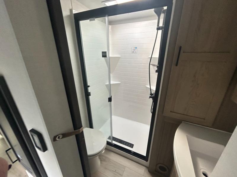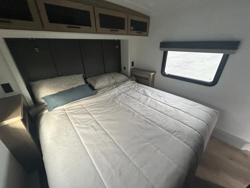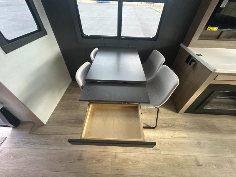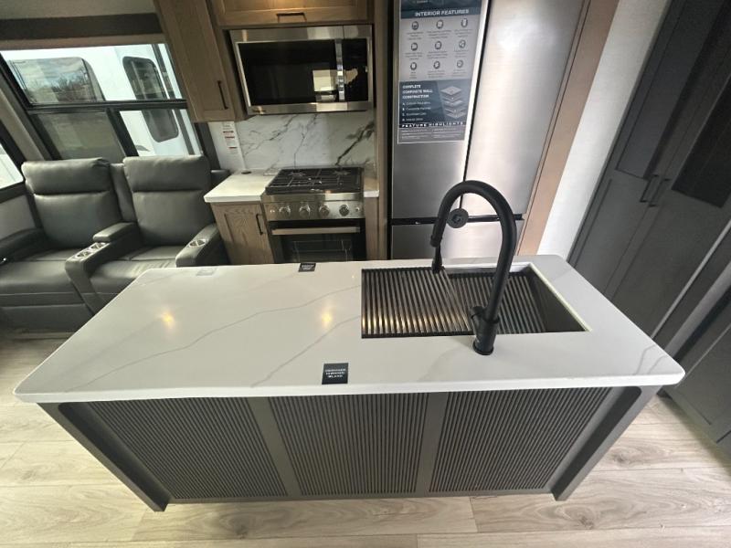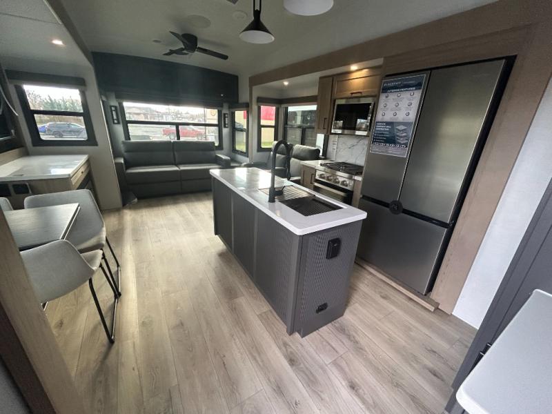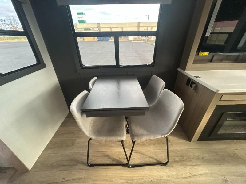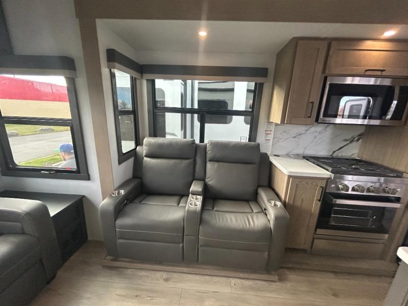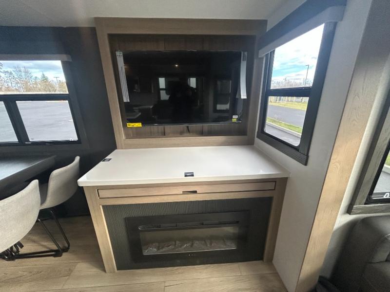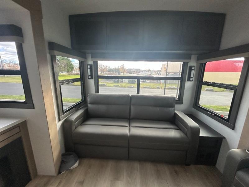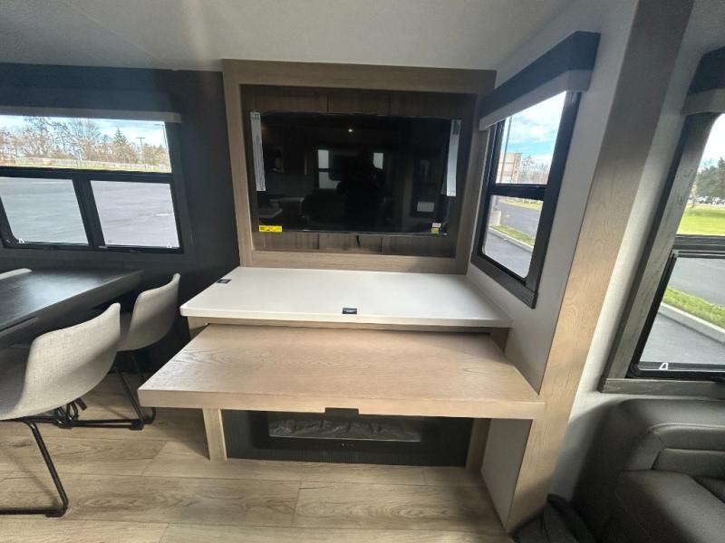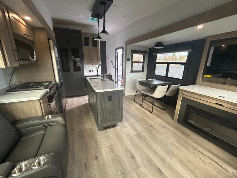 This fifth wheel will feel just like home wherever you decide to roam! The rear living area includes a hide-a-bed sofa with optional recliners, a 60" theater seat across from the TV and fireplace, plus a table and chairs. There is also a pull-out desk if you need to get some work done in the morning. The spacious full bath will let you freshen up each day, and the front private bedroom with a queen bed will provide a great escape each night.