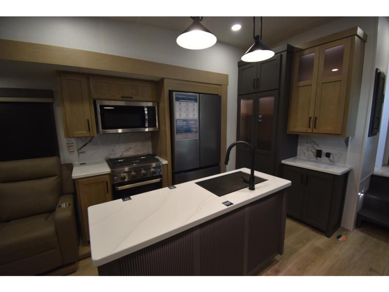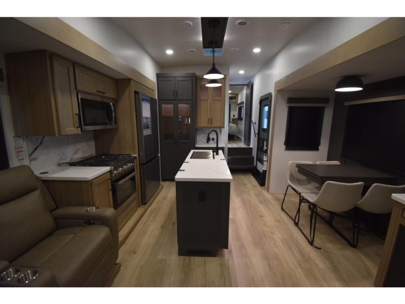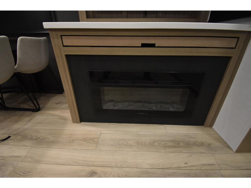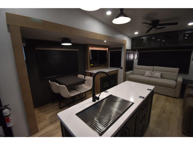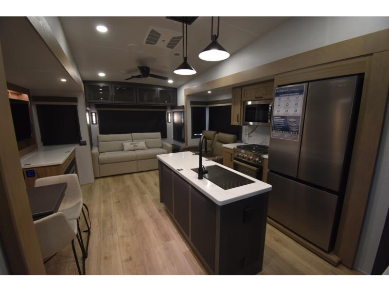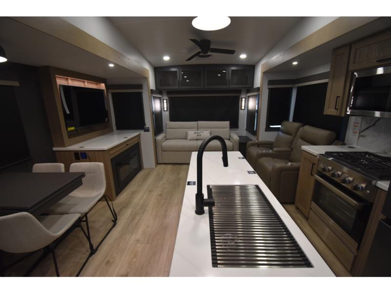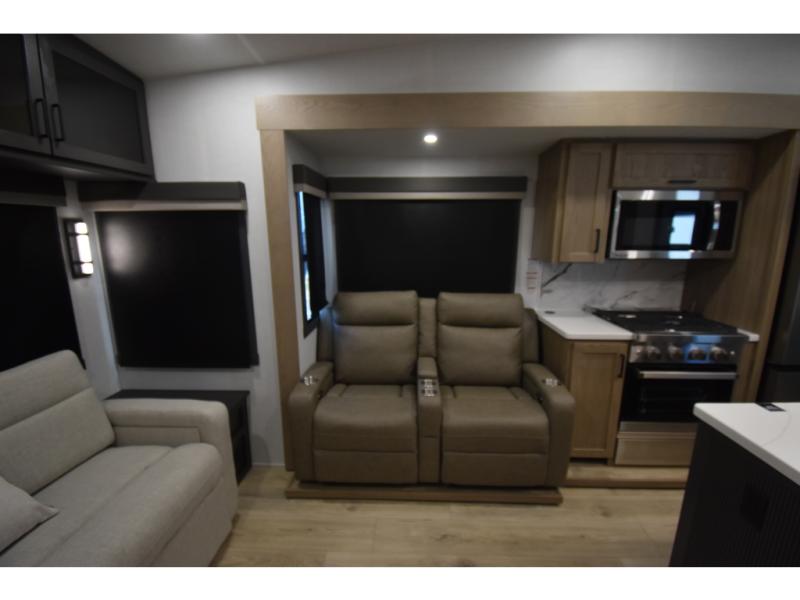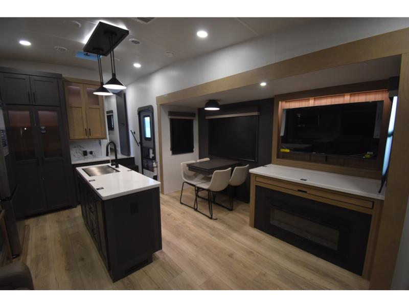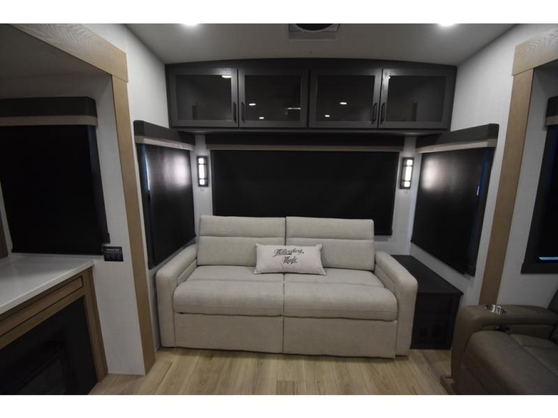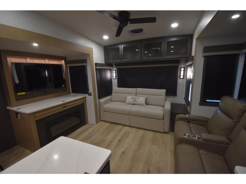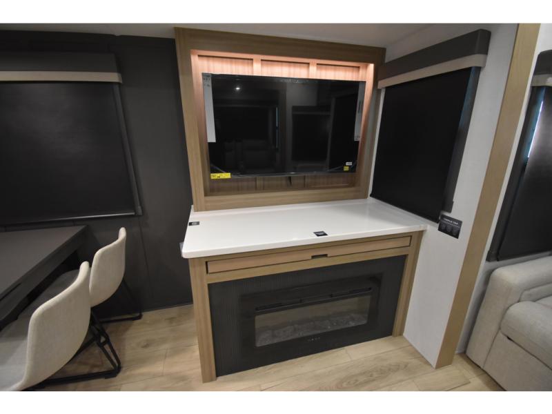 This fifth wheel will feel just like home wherever you decide to roam! The rear living area includes a hide-a-bed sofa with optional recliners, a 60" theater seat across from the TV and fireplace, plus a table and chairs. There is also a pull-out desk if you need to get some work done in the morning. The spacious full bath will let you freshen up each day, and the front private bedroom with a queen bed will provide a great escape each night.