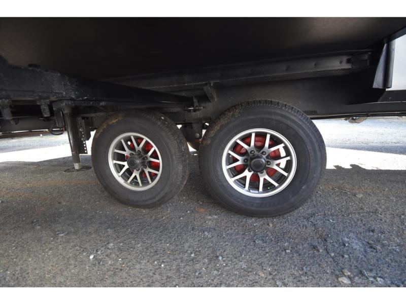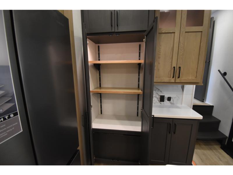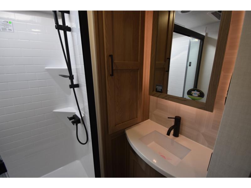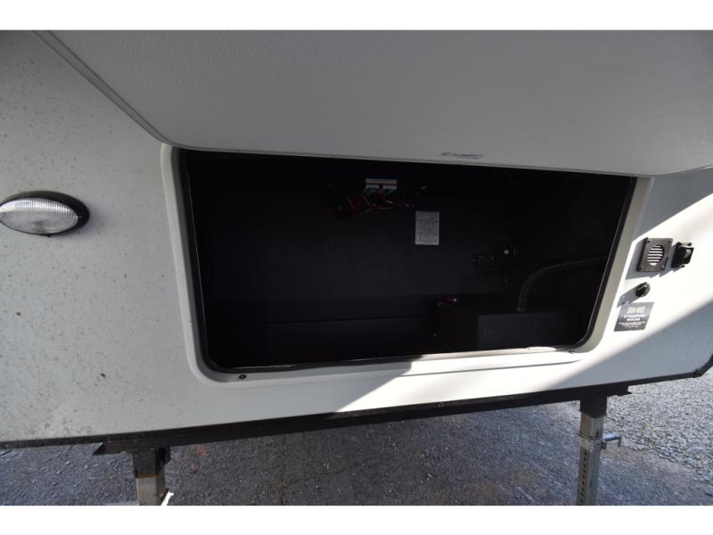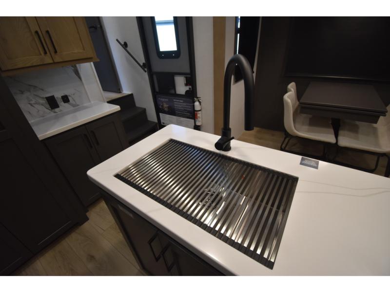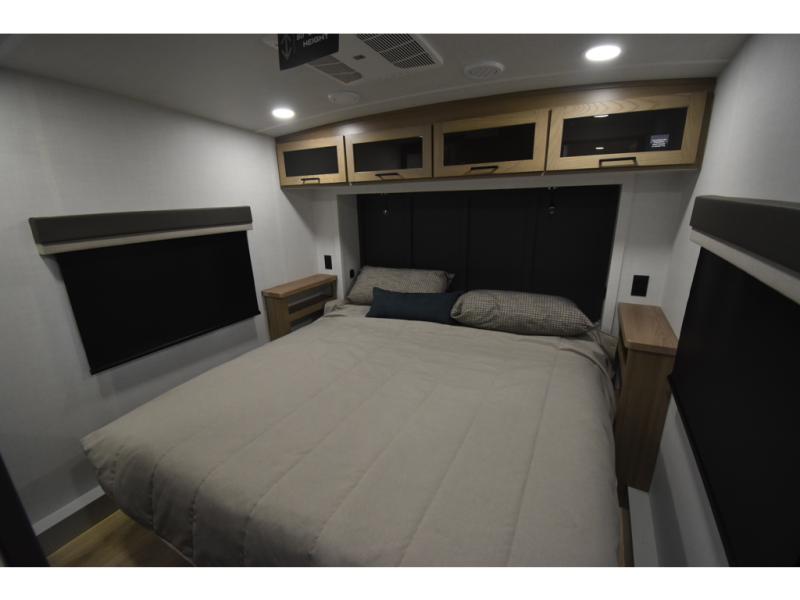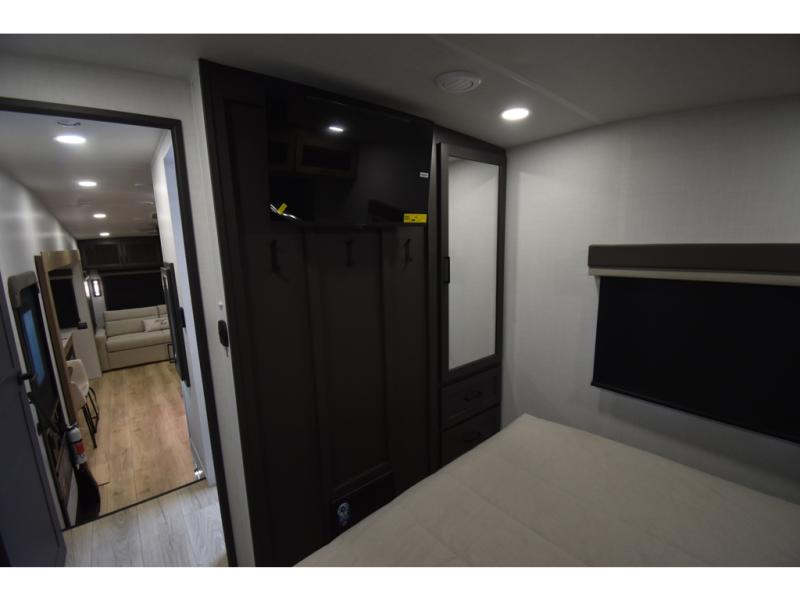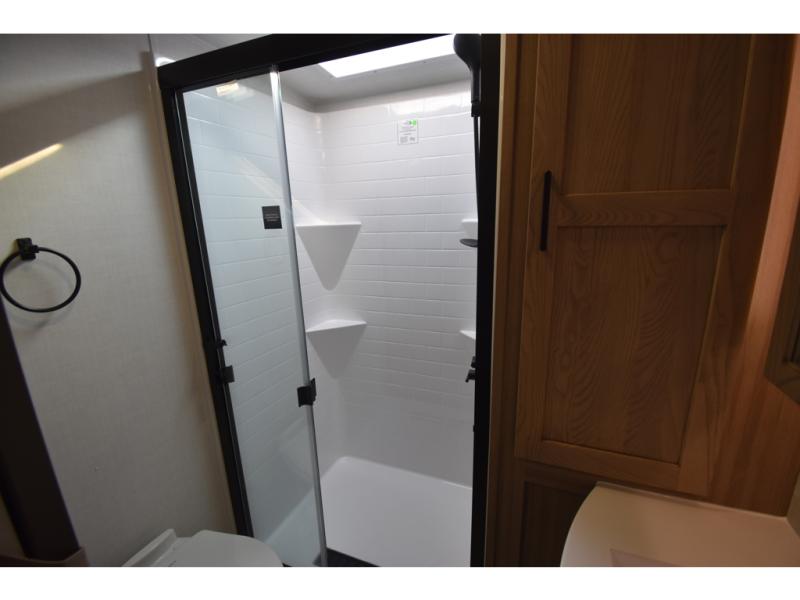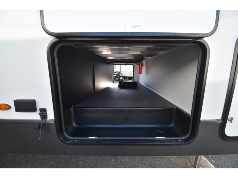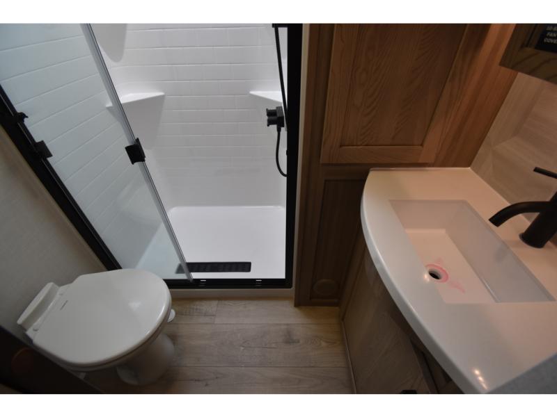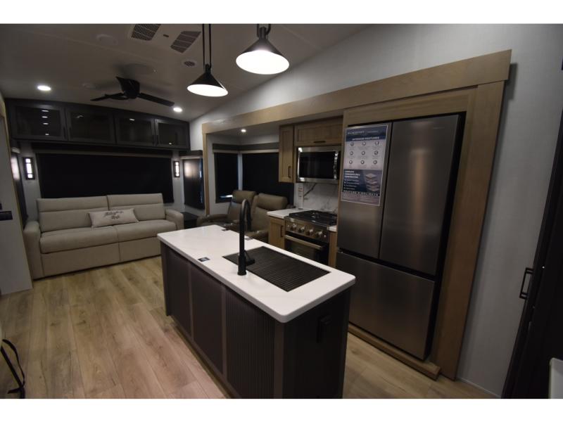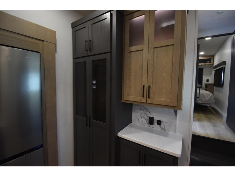 This fifth wheel will feel just like home wherever you decide to roam! The rear living area includes a hide-a-bed sofa with optional recliners, a 60" theater seat across from the TV and fireplace, plus a table and chairs. There is also a pull-out desk if you need to get some work done in the morning. The spacious full bath will let you freshen up each day, and the front private bedroom with a queen bed will provide a great escape each night.