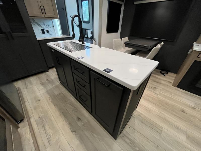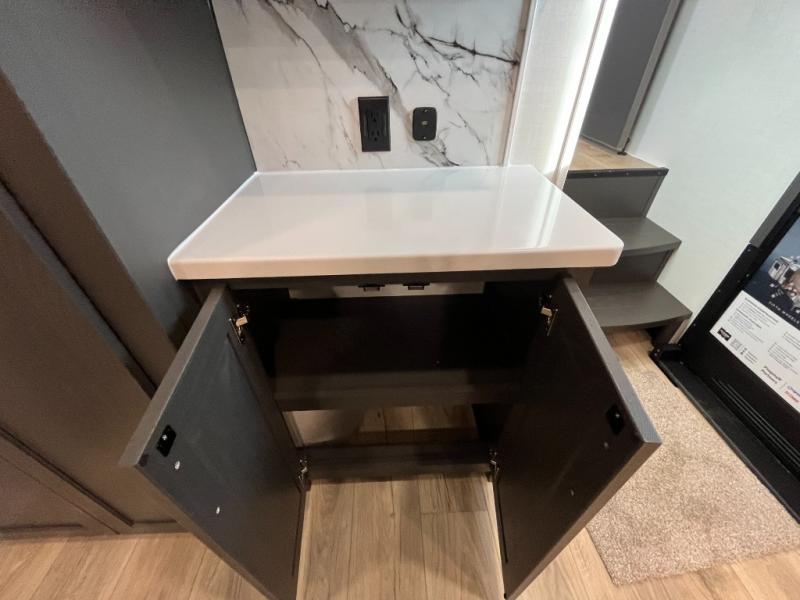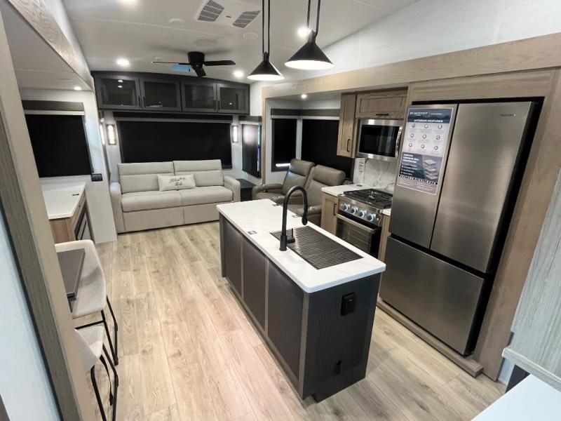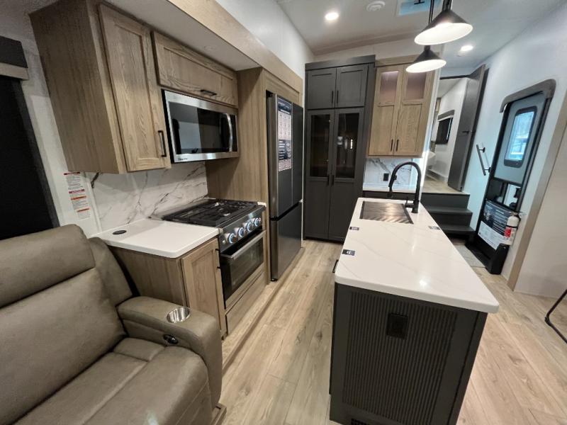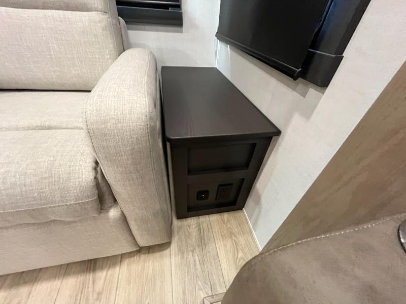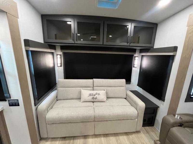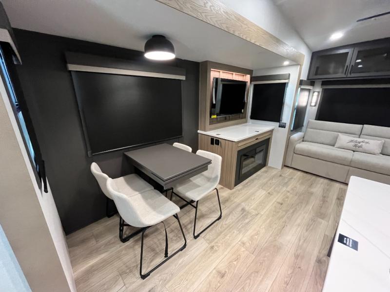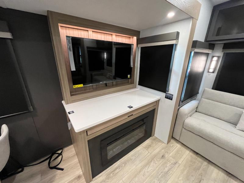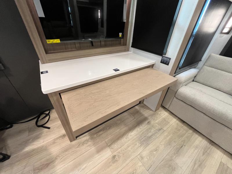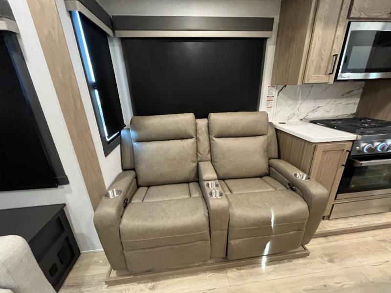 This fifth wheel will feel just like home wherever you decide to roam! The rear living area includes a hide-a-bed sofa with optional recliners, a 60" theater seat across from the TV and fireplace, plus a table and chairs. There is also a pull-out desk if you need to get some work done in the morning. The spacious full bath will let you freshen up each day, and the front private bedroom with a KING bed will provide a great escape each night.