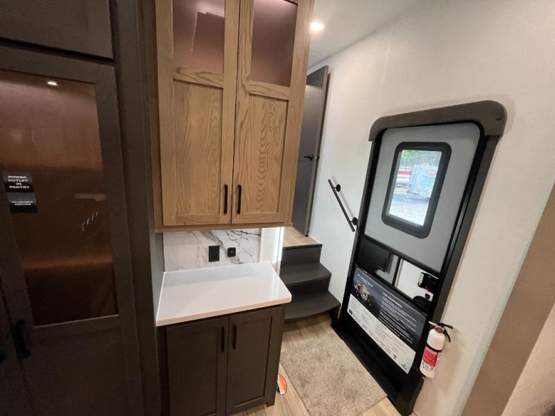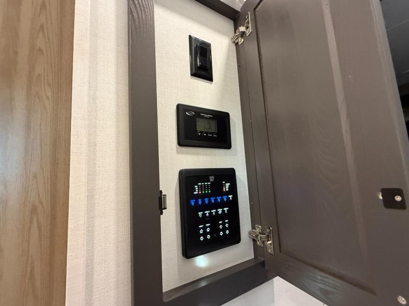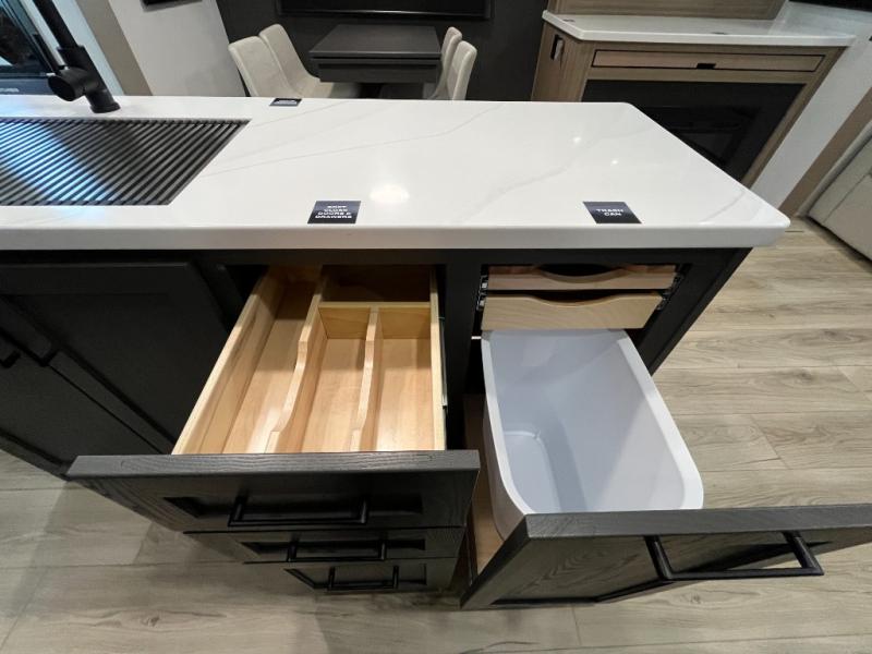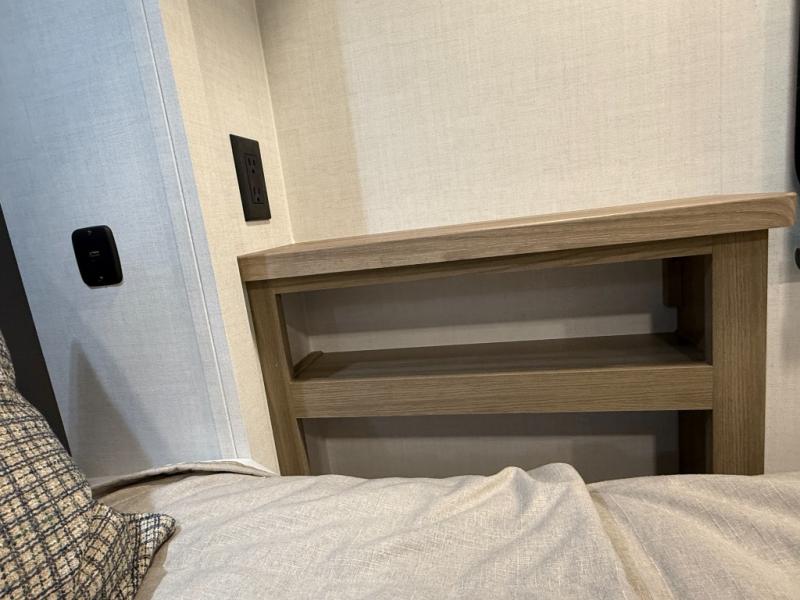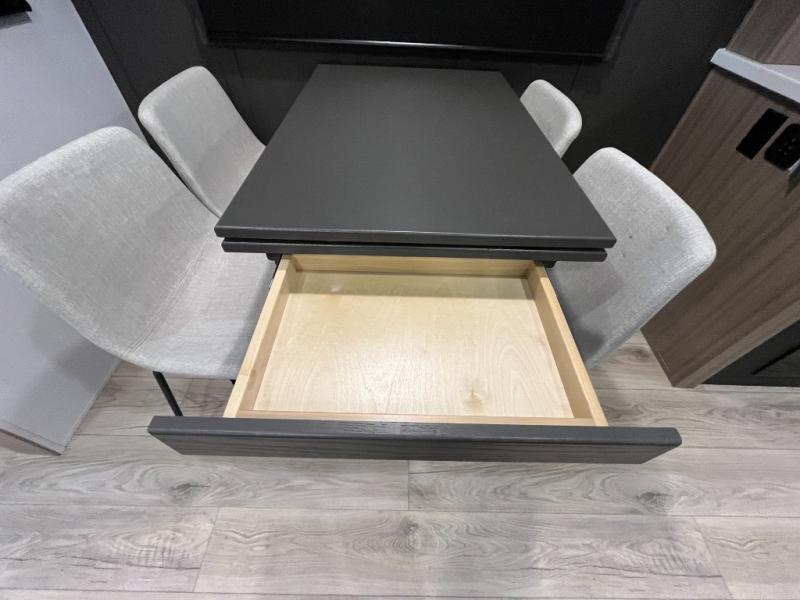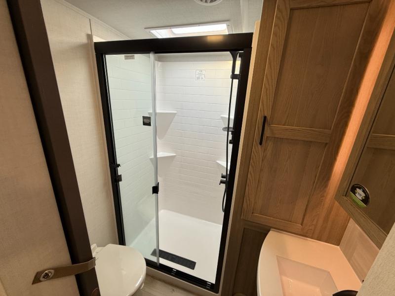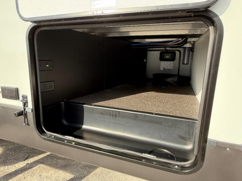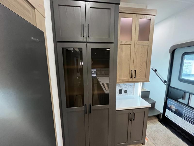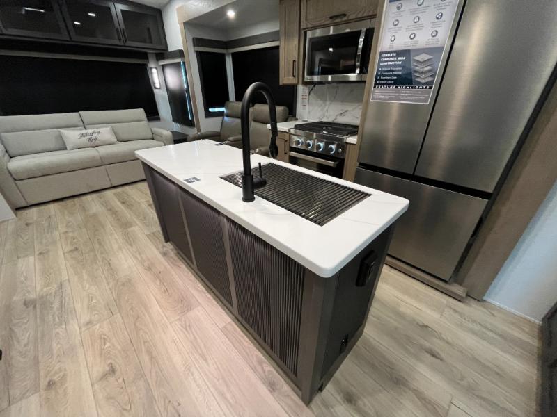 This fifth wheel will feel just like home wherever you decide to roam! The rear living area includes a hide-a-bed sofa with optional recliners, a 60" theater seat across from the TV and fireplace, plus a table and chairs. There is also a pull-out desk if you need to get some work done in the morning. The spacious full bath will let you freshen up each day, and the front private bedroom with a KING bed will provide a great escape each night.