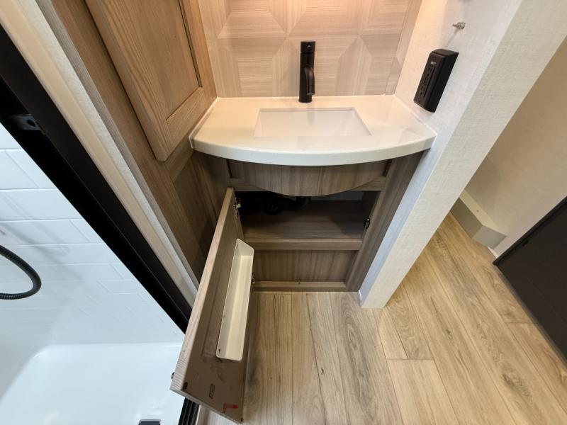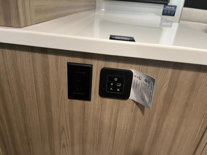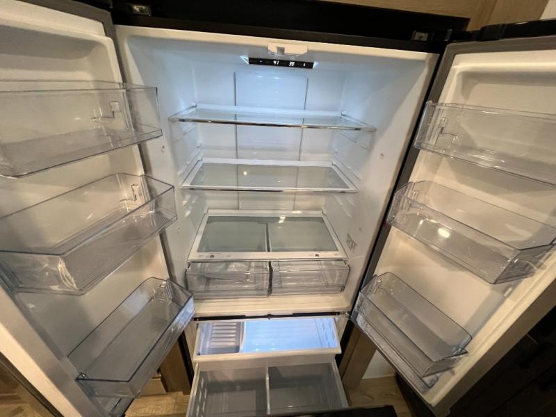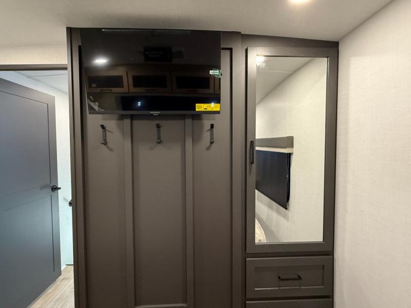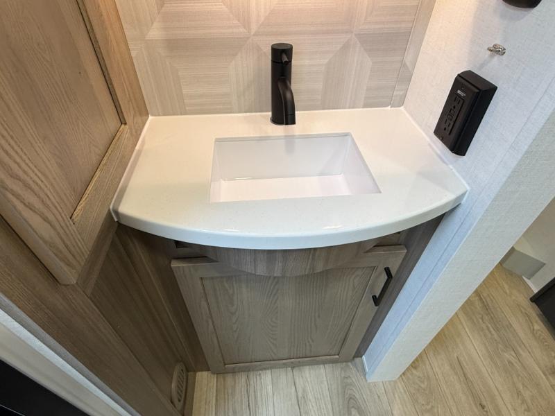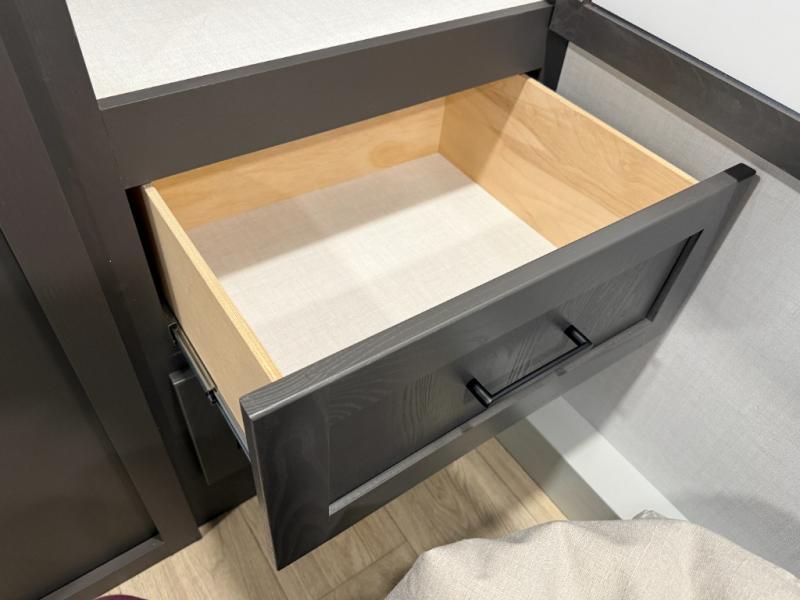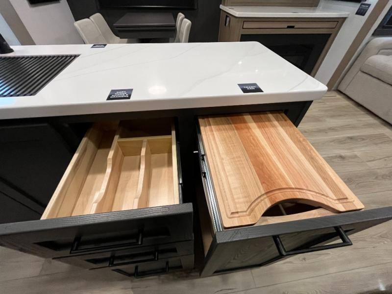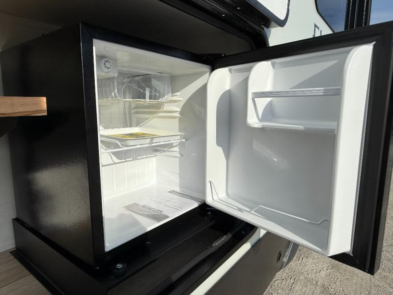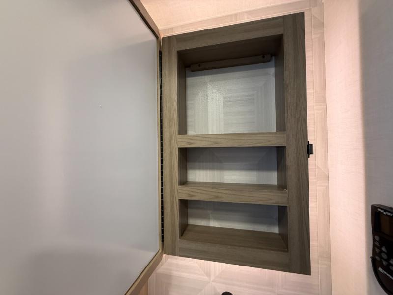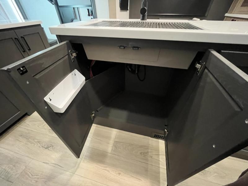 This fifth wheel will feel just like home wherever you decide to roam! The rear living area includes a hide-a-bed sofa with optional recliners, a 60" theater seat across from the TV and fireplace, plus a table and chairs. There is also a pull-out desk if you need to get some work done in the morning. The spacious full bath will let you freshen up each day, and the front private bedroom with a KING bed will provide a great escape each night.