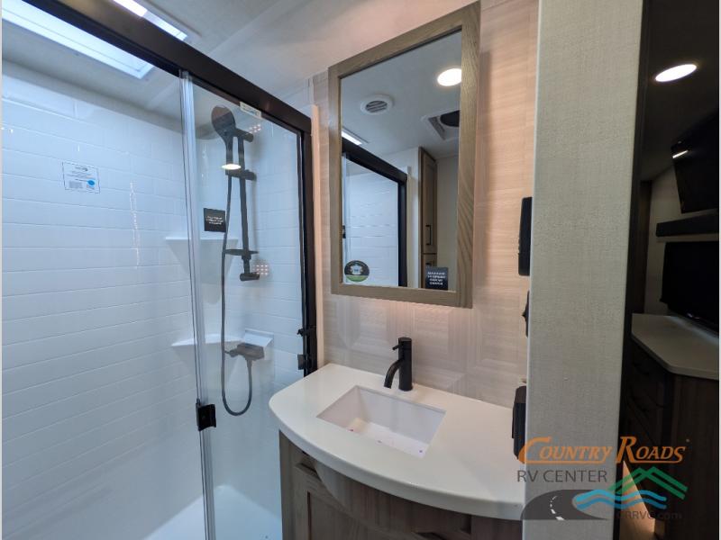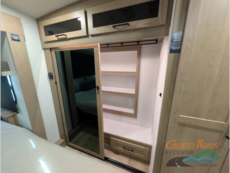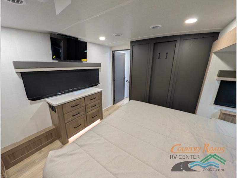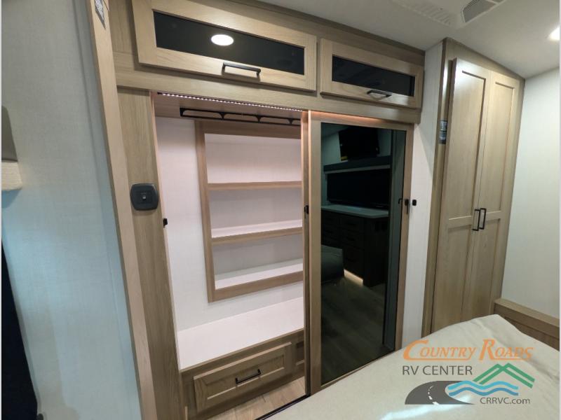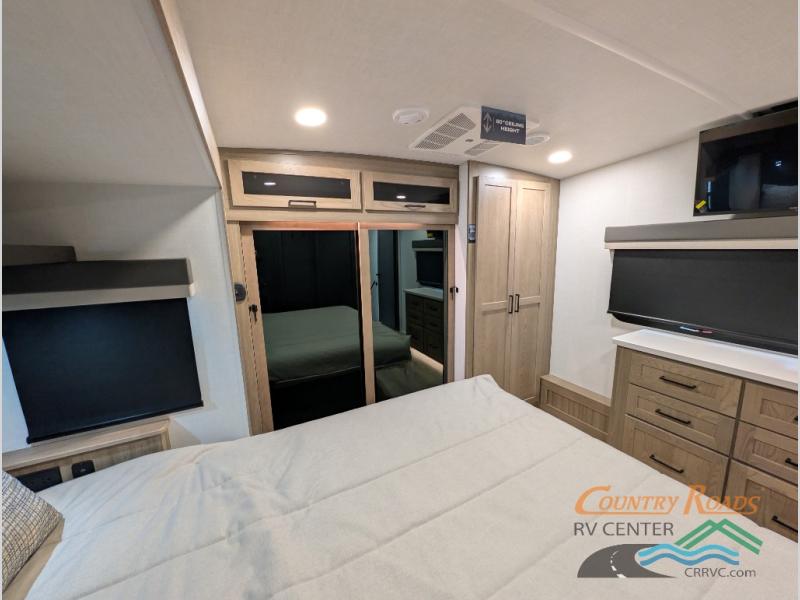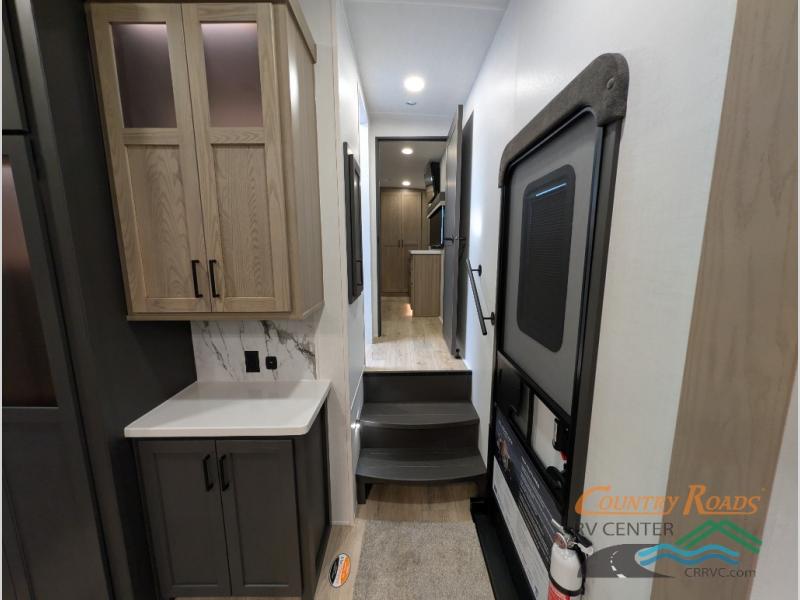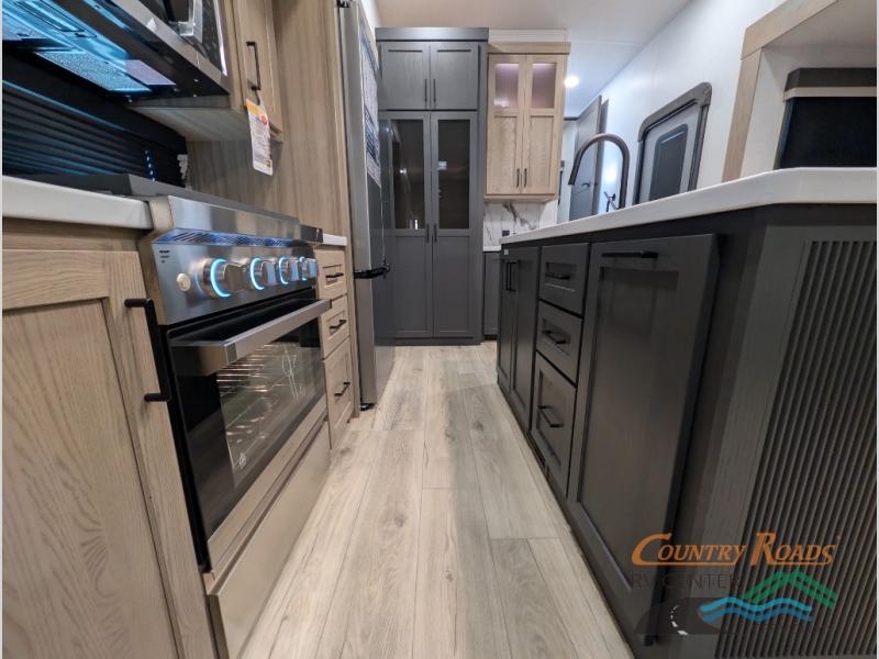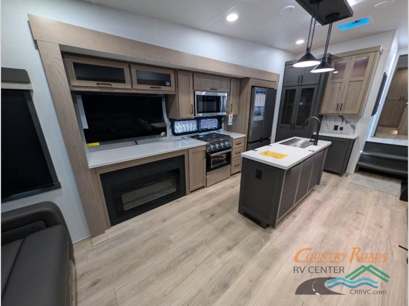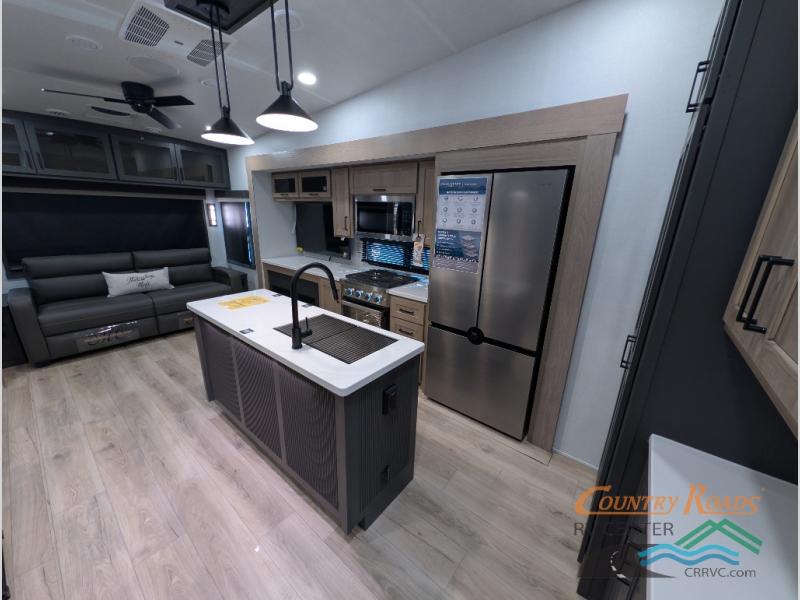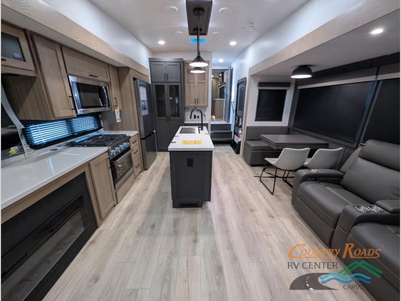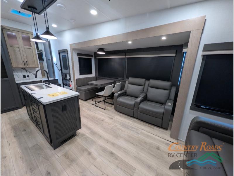 Get ready to enjoy the outdoors while inside with the spacious windows in both the rear and the door side slide of this fifth wheel. The main living area offers dual opposing slides giving you a great place to invite other RVers over to visit, eat, and even play cards. There is seating for nine from the table and chairs with a bench, the theater seats, and the rear hide-a-bed sofa. The cook will have a 12V refrigerator to store lots of drinks and cold food, plus a pantry, and the center island offers extra counter space plus seating. After everyone has left, retire to the front bedroom with a king bed slide, dresser, wardrobe, plus washer and dryer prep if you plan to go full-time!