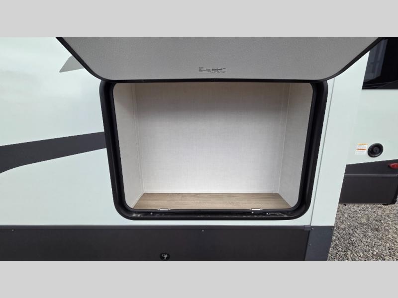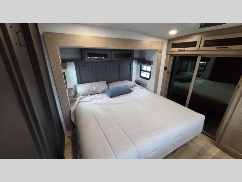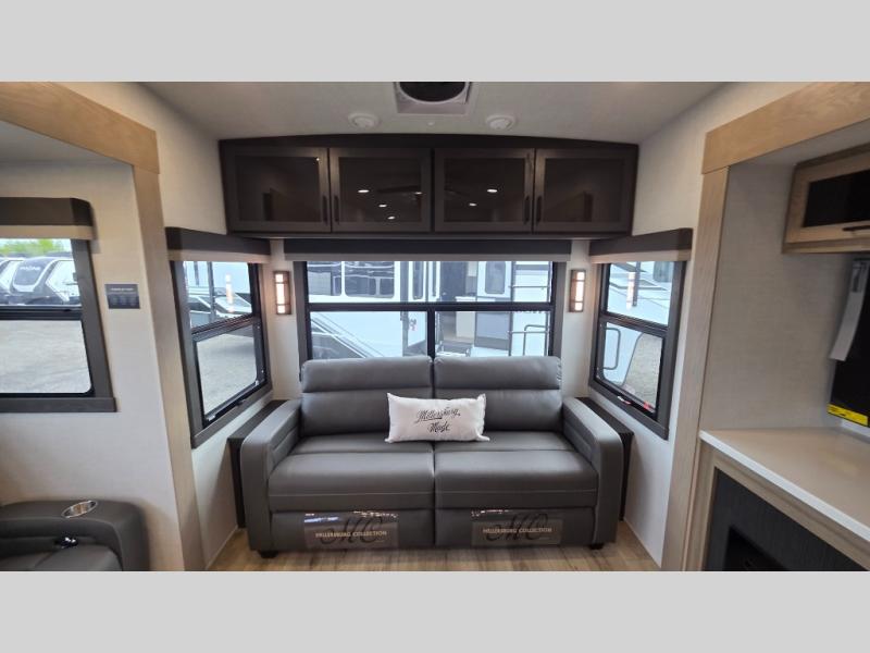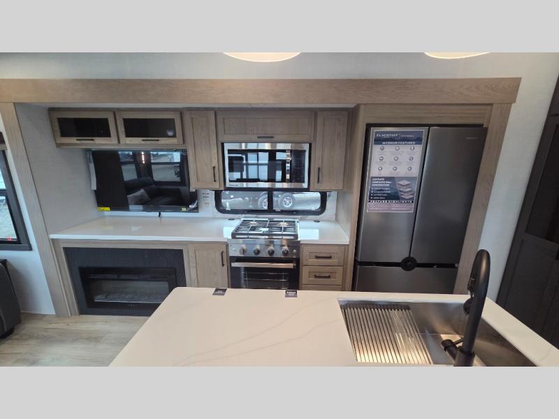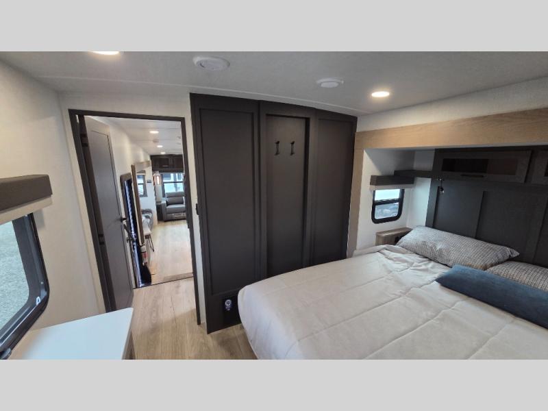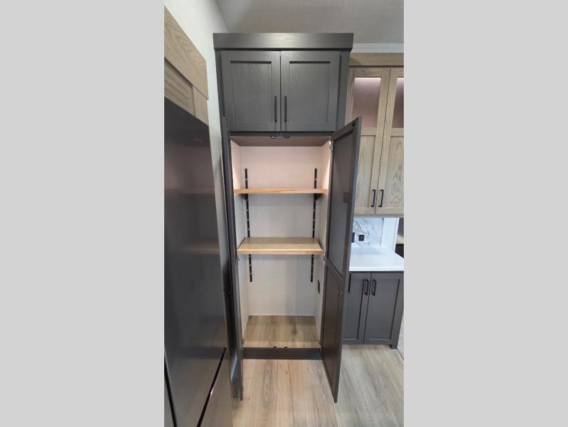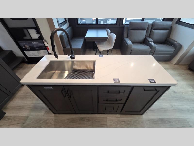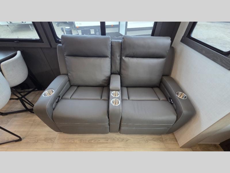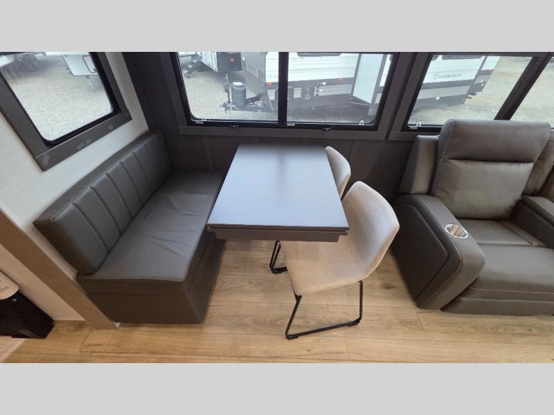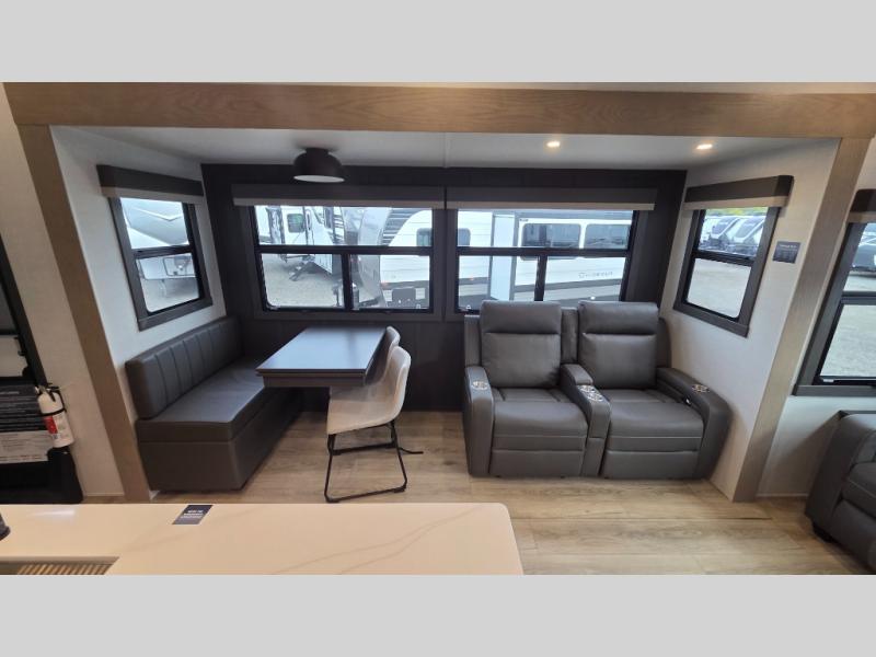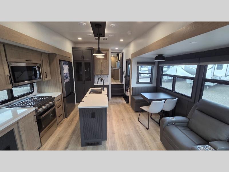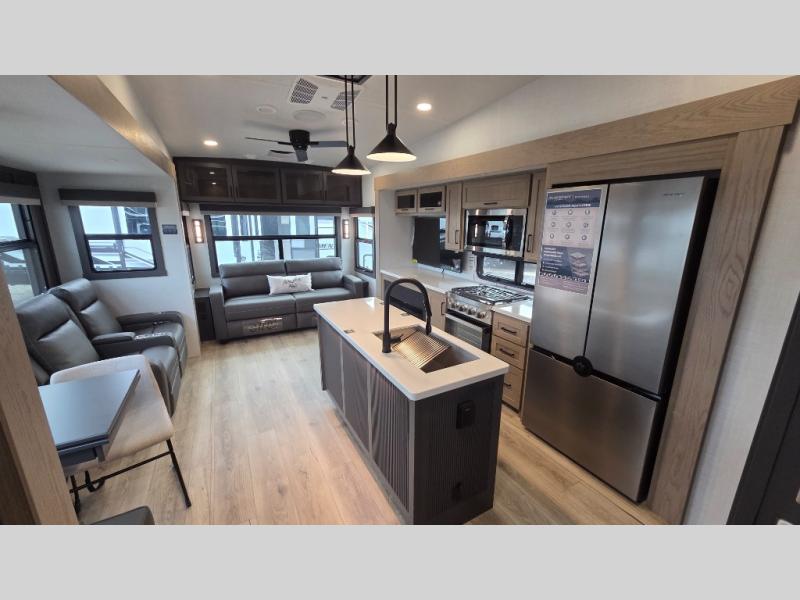 Get ready to enjoy the outdoors while inside with the spacious windows in both the rear and the door side slide of this fifth wheel. The main living area offers dual opposing slides giving you a great place to invite other RVers over to visit, eat, and even play cards. There is seating for nine from the table and chairs with a bench, the theater seats, and the rear hide-a-bed sofa. The cook will have a 12V refrigerator to store lots of drinks and cold food, plus a pantry, and the center island offers extra counter space plus seating. After everyone has left, retire to the front bedroom with a king bed slide, dresser, wardrobe, plus washer and dryer prep if you plan to go full-time!