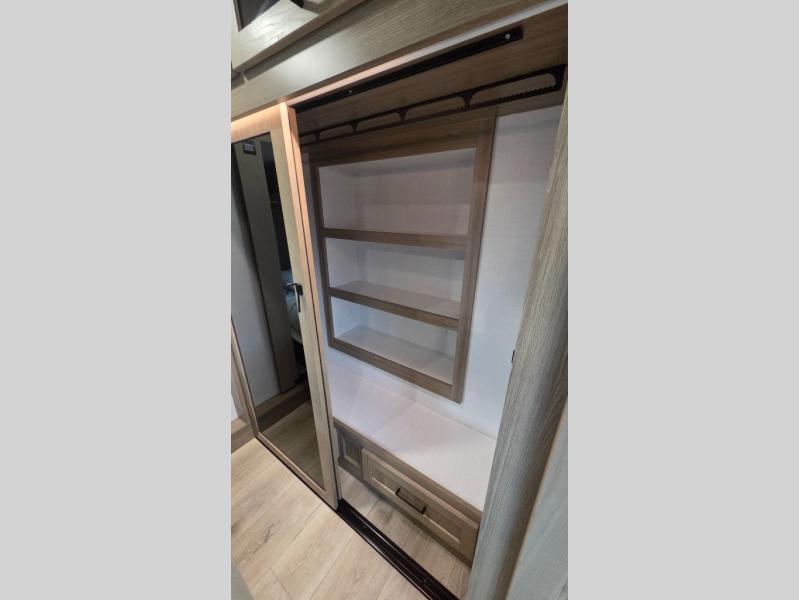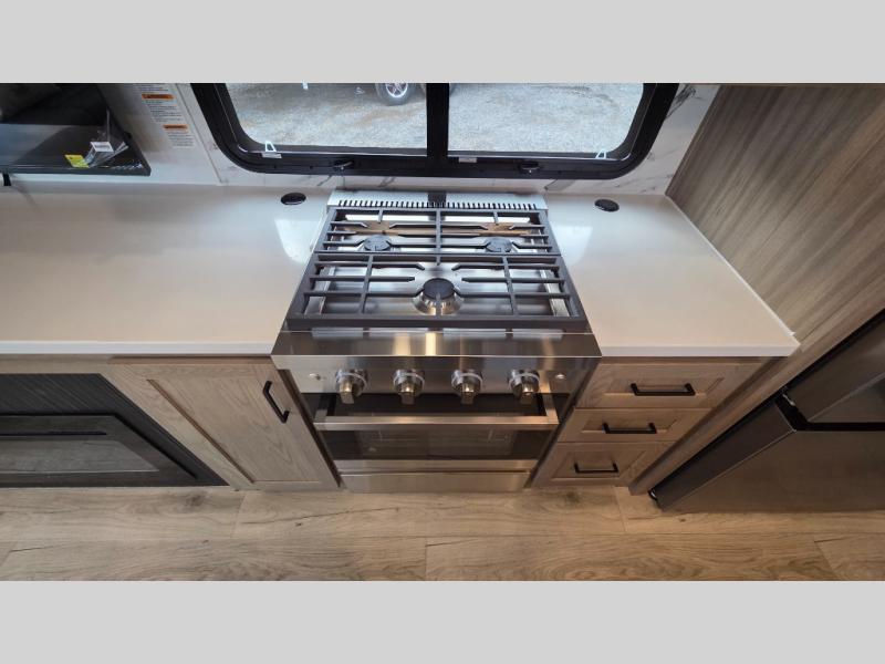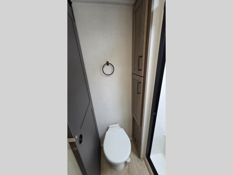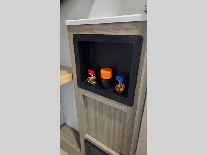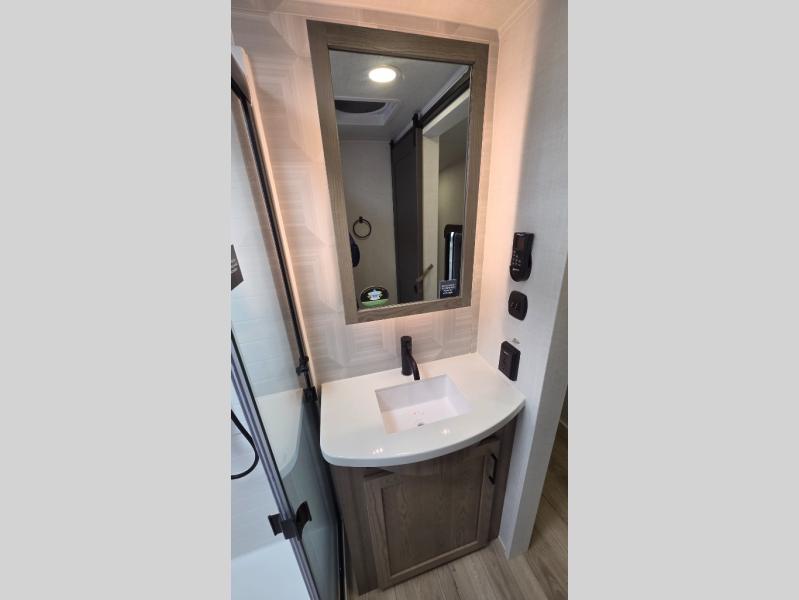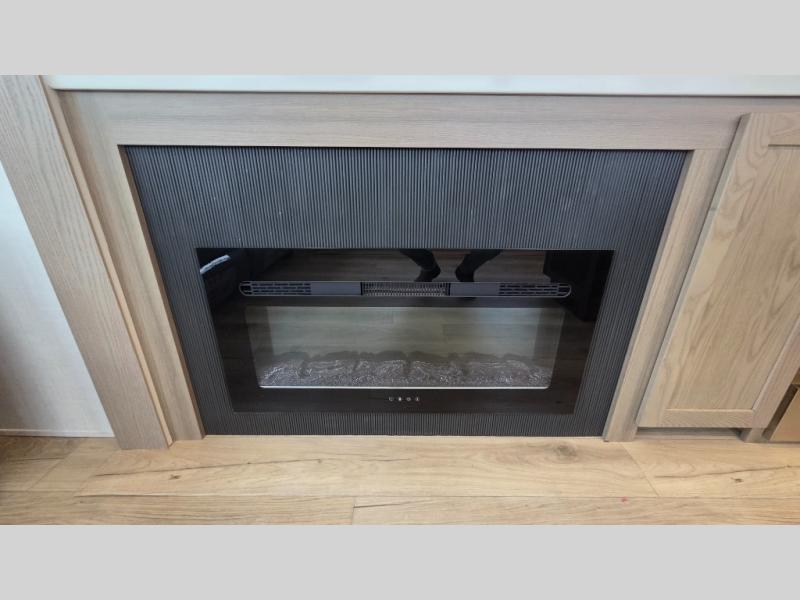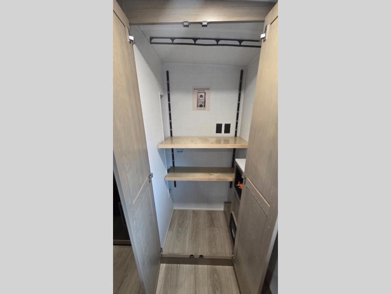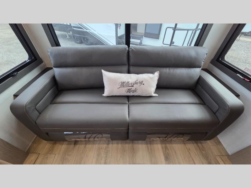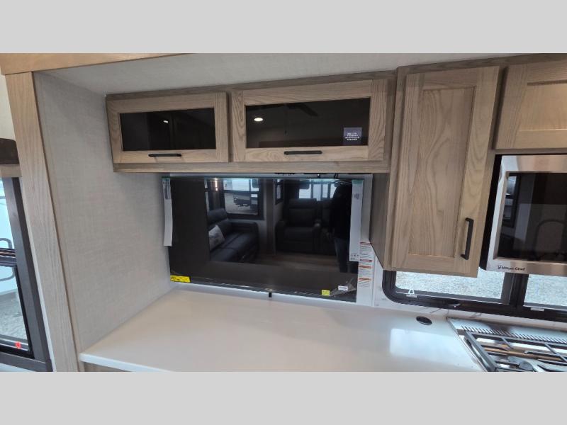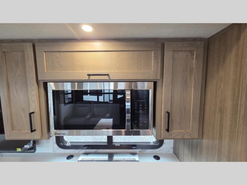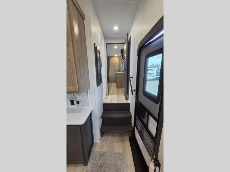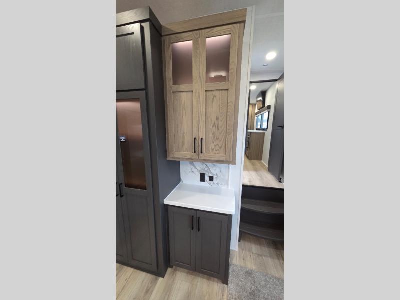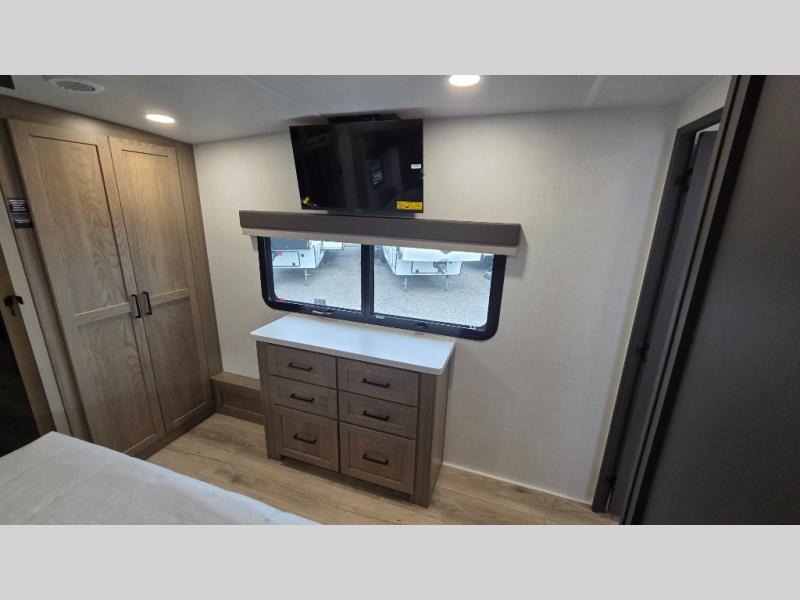 Get ready to enjoy the outdoors while inside with the spacious windows in both the rear and the door side slide of this fifth wheel. The main living area offers dual opposing slides giving you a great place to invite other RVers over to visit, eat, and even play cards. There is seating for nine from the table and chairs with a bench, the theater seats, and the rear hide-a-bed sofa. The cook will have a 12V refrigerator to store lots of drinks and cold food, plus a pantry, and the center island offers extra counter space plus seating. After everyone has left, retire to the front bedroom with a king bed slide, dresser, wardrobe, plus washer and dryer prep if you plan to go full-time!